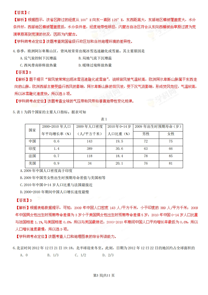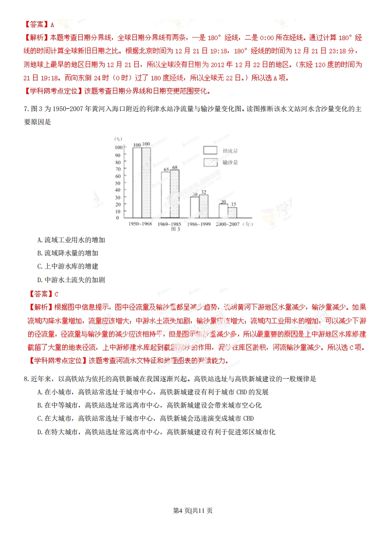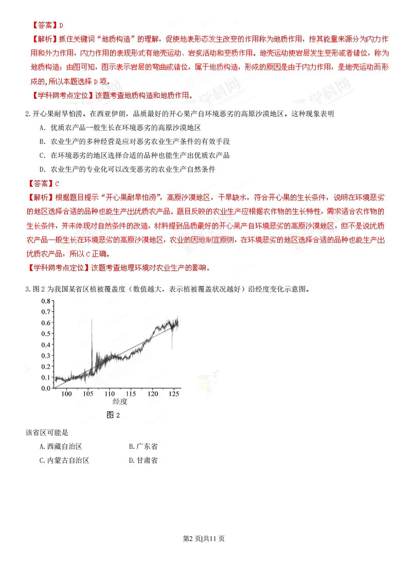 2013年普通高等学校招生全国统一考试(广东卷)文科综合(地理部分)【学科网试卷总评】2013年广东省高考文综卷,总体难度适中。全卷11道选择题,其中自然地理部分5道---1、3、4、6考查了地壳运动与地质作用、自然带、气候特征与天气系统、时间计算、等知识点:环境题一道--一10题考查植被对气候的影响:人文、区域地理部分5道----2、5、7、8、9、11题,考查农业区位因素、人口、流域治理、城市发展影响、交通及城市空间结构。综合题40题以印度尼西亚为背景资料,考查学生读取地图信息的基本能力,综合考查了区域的地理位置、气候、构造带、对流雨的成因、渔业资源丰富的原因及区域农业可持续发展的措施。综合题41题,以西宁市为背景资料,考查区域气候特点、城市形态的形成因素、土地利用变化及影响、工业结构特点分析及影响。全卷自然地理部分占有40分,人文和区域地理占56分,环境保护4分。分值内容分配合理。全卷涉及景观图片1幅,地理事物变化发展图2幅,表格资料2个,示意图1幅,位置图1幅,结构图2幅,体现了地理学科的特点。与城市相关的试题选择题有3题-一一考查城市交通与城市发展、城市化的影响、城市的空间形态变化:综合题41题就以西宁市为背景考查西宁的自然和经济地理特征,总分值40分。总卷自然地理部分和人文地理部分比重相当,综合题的考查立足区域地理特征和区域的发展,重点考查学生综合分析能力,对区域地理特征的归纳能力及学生日常知识的积累。整套试卷注重考查学生对地理的思考、分析、判断、归纳和总结能力,作为高考试卷更注重了学生综合素质的考查。本解析为学科网名师解析团队原创,授权学科网独家使用,如有盗用,依法追责!一、选择题:共11小题,每小题4分,满分44分.在每小题给出的四个选项中,只有一项是符合题目要求的.1.图I为某地实景图。其所示地质构造的形成原因主要是图1A.搬运作用B.风化作用C.变质作用D.地壳作用第1页共11页【答案】D【解析】抓住关键词“地质构造”的理解,促使地表形态发生改变的作用称为地质作用,按其能量来源分为内力作用和外力作用,内力作用的表现形式有地壳运动、岩浆活动和变质作用。地壳运动使岩层发生变形或者错位,称为地质构造,由图可知,图示表示岩层的弯曲或错位,属于地质构造,形成的原因是由于内力作用,是地壳运动而形成的,所以本题选择D项。【学科网考点定位】该题考查地质构造和地质作用。2.开心果耐旱怕涝。在西亚伊朗,品质最好的开心果产自环境恶劣的高原沙漠地区。这种现象表明A.优质农产品一般生长在环境恶劣的高原沙漠地区B.农业生产的多种经营是应对恶劣农业生产条件的有效手段C.在环境恶劣的地区选择合适的品种也能生产出优质农产品D.农业生产的专业化可以改变恶劣的农业生产自然条件【答案】C【解析】根据题目提示“开心果耐旱怕涝”,高原沙漠地区,干旱缺水,符合开心果的生长条件,说明在环境恶劣的地区选择合适的品种也能生产出优质农产品。题目反映的农业生产应根据农作物的生长特性,需求适合农作物的生长条件,并未体现对自然条件的改造,材料提到品质最好的开心果产自环境恶劣的高原沙漠地区,但不是说优质农产品一般生长在环境恶劣的高原沙漠地区,农业的因地制宜原则,在环境恶劣的地区选择合适的品种也能生产出优质农产品,所以C正确。【学科网考点定位】该题考查地理环境对农业生产的影响。3.图2为我国某省区植被覆盖度(数值越大,表示植被覆盖状况越好)沿经度变化示意图。0.810.70.60.50.40.30.20.10.0100105110115120125经度图2该省区可能是A.西藏自治区B.广东省C.内蒙古自治区D.甘肃省第2页共11页