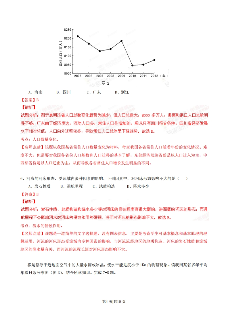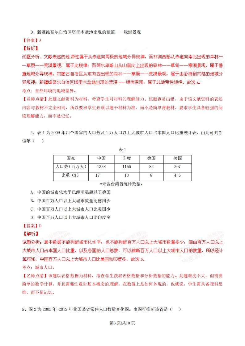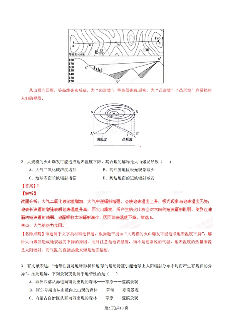 2015年普通高等学校招生全国统一考试(广东卷)文科综合地理第I卷本卷共35小题。每小题4分,共140分。在每个小题给出的四个选项中,只有一项是符合题目要求的。一、选择题:本大题共35小题,每小题4分,共140分。在每小题列出的四个选项中,只有一项是符合题目要求的。1,数字高程模型是对地貌形态的虚拟表示,可描述地面高程信息。图1为某旅游区的数字高程模型图,图中甲、乙、丙、丁四处观景平台视野最广的可能是()高程m)门最大值:1087最小值1723图1A、甲B、乙C、丙D、丁【答案】C【解析】试题分析:根据图例信息可知,颜色越亮,高程越高,即可丙地海拔最高,是图示区域的最高点,在此处设立观景平台视野最广,甲乙丁三处海拔低,位于山俗或山坡处,受两侧山顶的阻挡,视野差一些。考点:地形图。【名师点睛】此题难度不大,属于直视问题,根据数字高程模型判断该区域地形特点和地势起伏。直视问题可以通过作地形剖面图进行判断,在地形剖面图上由观测点的投射点向目标点的投射点绘直线,若直线没有被任何地物所切断,表示直视良好,否则不能直视。如下图所示,由点s'向点c'绘直线,直线没有被任何地物所切断,表示直视良好。而图中b'位于阴影区,说明s点不能直视b点,所以村落b对于s点为不直视。第1页共10页得高石10米松02180170160150140130120从山顶向四周,等高线先密后疏,为“凹形坡”:等高线先疏后密,为“凸形坡”,“凸形坡”容易挡住人们的视线。A凹形坡凸形坡2.大规模的火山爆发可能造成地表温度下降。其合理的解释是火山爆发导致()A、大气二氧化碳浓度增加B、高纬度地区极光现象减少C、地球表面长波辐射增强D、到达地而的短波辐射减弱【答案】D【解析】试题分析:大气二氧化碳浓度增加,大气中逆辐射增强,会使地表温度上升;极光现象与地表温度无关:地表长波辐射增强表明地表温度升高:而火山爆发,所产生的火山灰会对太阳的短波辐射悄削弱,使到达地面的短波辐射减弱,地面吸收太阳辐射减少,因而地表温度下降。故选D。考点:大气的热力作用。【名师点睛】该题属于文字类材料选择题,根据题干提示“大规模的火山爆发可能造成地表温度下降”,解析火山爆发造成地表温度下降的原因,同时注意是地表温度,而不是通常说的气温,地表温度的热量来源是太阳辐射,而气温的直接热量来源是地面辐射。3.有文献表述:“地带性就是地球形状和地球的运动特征引起地球上太阳辐射分布不均而产生有规律的分异”。按此理解。下列景观变化属于地带性的是()A、非洲西部从赤道向南北出现的森林一一草原一一荒漠景观B、阿尔卑斯山从山麓向上出现的森林一一草甸一一寒漠景观C、内蒙古自治区从东向西出现的森林一一草原一一荒漠景观第2页共10页