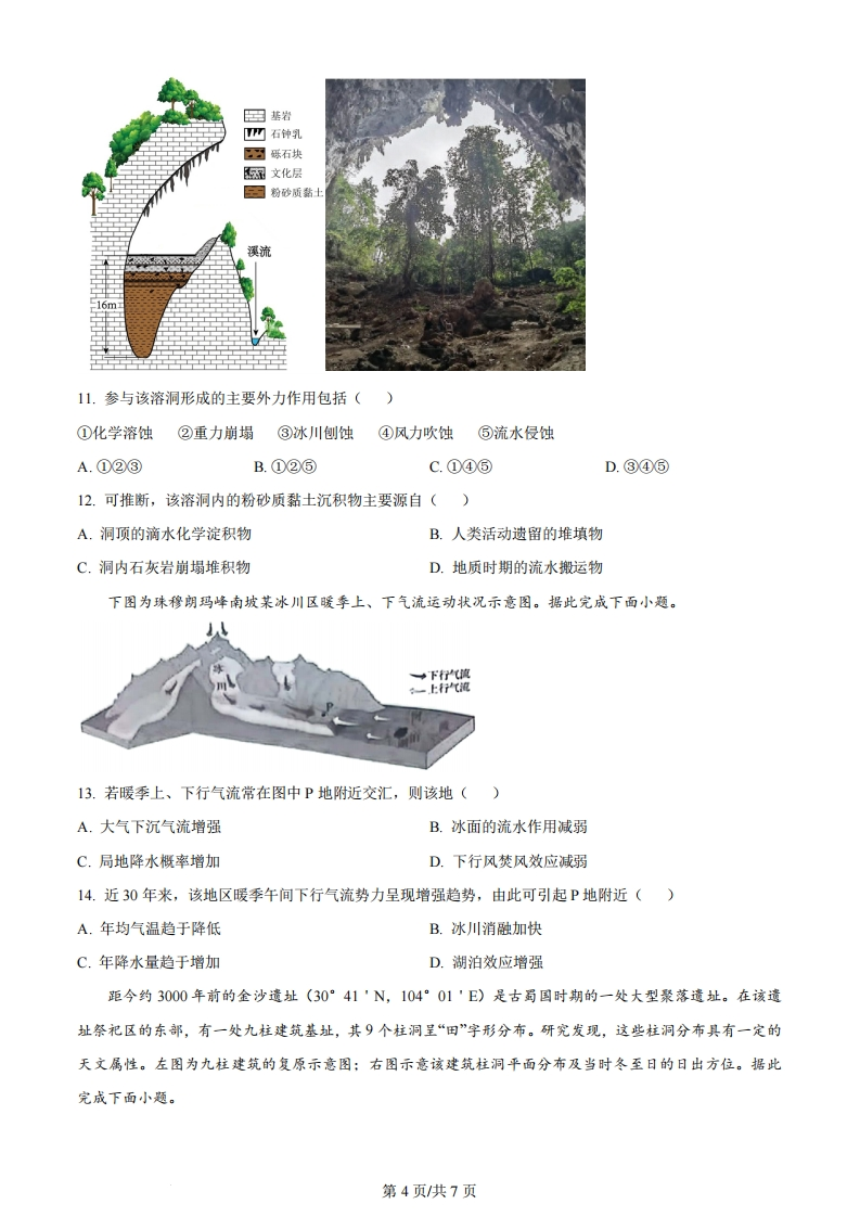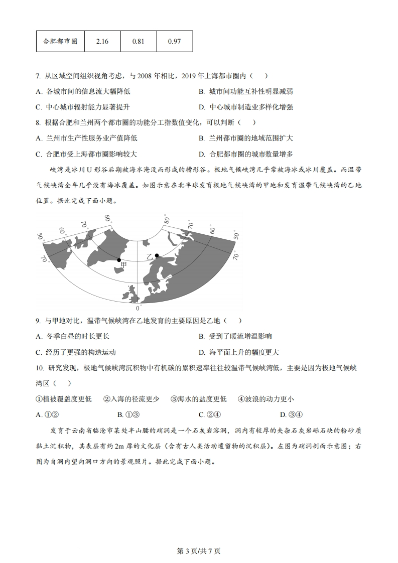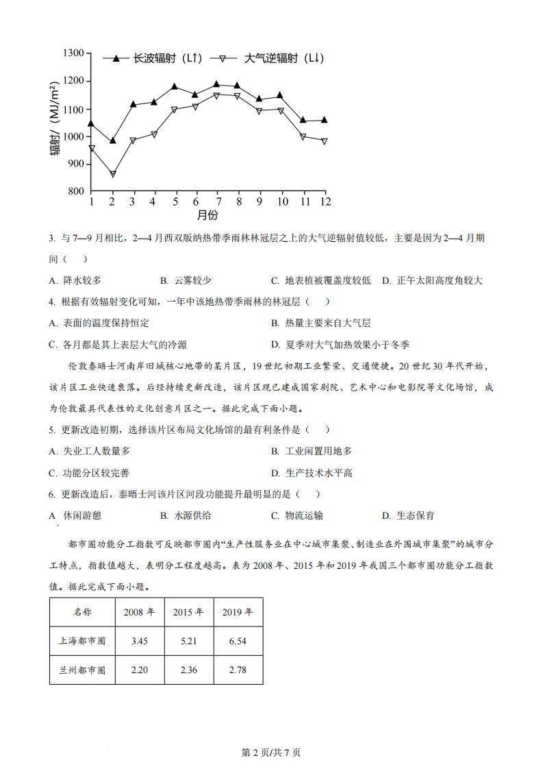 2024年广东省普通高中学业水平选择性考试地理本试卷共6页,19小题,满分100分。考试用时75分钟。注意事项:1.答题前,考生务必用黑色字迹的钢笔或签字笔将自己的姓名、考生号、考场号和座位号填写在答题卡上。用2B铅笔将试卷类型(A)填涂在答题卡相应位置上。将条形码横贴在答题卡右上角“条形码粘贴处”。2.作答选择题时,选出每小题答案后,用2B铅笔把答题卡上对应题目选项的答案信息点涂黑;如需改动,用橡皮擦干净后,再选涂其他答案,答案不能答在试卷上。3。非选择题必须用黑色字迹的钢笔或签字笔作答,答案必须写在答题卡各题目指定区域内相应位置上;如需改动,先划掉原来的答案,然后再写上新的答案;不准使用铅笔和涂改液。不按以上要求作答的答案无效。4。考生必须保持答题卡的整洁。考试结束后,将试卷和答题卡一并交回。一、选择题:本大题共16小题,每小题3分,共48分。在每小题列出的四个选项中,只有一项符合题目要求。1984年以来,贺兰山东麓地区葡萄酒产业发展经历了萌发停滞()、缓慢发展()、快速发展(Ⅲ)和高速发展(V)4个阶段,葡萄种植面积持续增加,葡萄酒生产集群规模不断扩大且重心向东南方向移动。如图反映4个阶段葡萄种植区自然要素变化。据此完成下面小题。a有机质含量/(gkg)b.砾石含量%c.年均降水量/mmd年均气温/C阶段1阶段I阶段I阶段I4.38111.1206.49.93.920.0180.0J9.0阶段四阶段Ⅲ阶段四阶段Ⅲ1.1984年以来,贺兰山东麓地区新增葡萄种植区趋向(A.土壤更贫瘠地区B.黄河两侧平原区C暖湿化加剧地区D.贺兰山高海拔区2.驱动该地区葡萄酒生产集群规模不断扩大的主要因素有()①劳动力大量回流②政策支持与激励③肥沃的土地资源多④旺盛的市场需求⑤适宜的气候条件⑥企业示范效应显著A.①③⑤B.①④⑤C.②③⑥D.②④⑥有效辐射为下垫面向上长波辐射与大气逆辐射的差值。如图表示2003一2012年云南省西双版纳热带季雨林林冠层向上长波辐射(L↑)及其上大气逆辐射(L)的月平均变化。据此完成下面小题。第1页/共7页13007士一长波辐射(L↑)一大气逆辐射(L)12001100100090080023456789101112月份3.与7一9月相比,2一4月西双版纳热带季雨林林冠层之上的大气逆辐射值较低,主要是因为2一4月期间()A.降水较多B.云雾较少C.地表植被覆盖度较低D.正午太阳高度角较大4.根据有效辐射变化可知,一年中该地热带季雨林的林冠层()A.表面的温度保持恒定B.热量主要来自大气层C.各月都是其上表层大气的冷源D.夏季对大气加热效果小于冬季伦敦泰晤士河南岸旧城核心地带的某片区,19世纪初期工业繁荣、交通便捷。20世纪30年代开始,该片区工业快速衰落。后经持续更新改造,该片区现已建成国家刷院、艺术中心和电影院等文化场馆,成为伦敦最具代表性的文化创意片区之一。据此完成下面小题。5.更新改造初期,选择该片区布局文化场馆的最有利条件是()A.失业工人数量多B.工业闲置用地多C.功能分区较完善D.生产技术水平高6.更新改造后,泰晤士河该片区河段功能提升最明显的是()A休闲游憩B.水源供给C.物流运输D.生态保育都市圈功能分工指数可反映都市圈内“生产性服务业在中心城市集聚、制造业在外围城市集聚”的城市分工特点,指数值越大,表明分工程度越高。表为2008年、2015年和2019年我国三个都市圈功能分工指数值。据此完成下面小题。名称2008年2015年2019年上海都市圈3.455.216.54兰州都市圈2.202.362.78第2页共7页