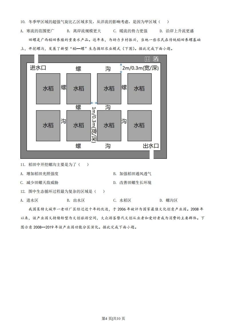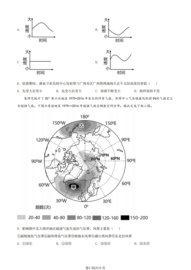 2022年广东省普通高中学业水平选择性考试地理本试卷共6页,20小题,满分100分。考试用时75分钟。注意事项:1.答卷前,考生务必用黑色字迹钢笔或签字笔将自己的姓名、考生号、考场号和座位号填写在答题卡上。用2B铅笔将试卷类型(B)填涂在答题卡相应位置上。将条形码横贴在答题卡右上角“条形码粘贴处”。2.作答选释题时,选出每小题答案后,用2B铅笔把答题卡上对应题目选项的答案信息点涂黑:如需改动,用橡皮擦干净后,再选涂其他答案,答案不能答在试卷上。3.非选择题必须用黑色字迹钢笔或签字笔作答,答案必须写在答题卡各题目指定区域内相应位置上;如需改动,先划掉原来的答案,然后再写上新的答案;不准使用铅笔和涂改液。不按以上要求作答的答案无效。4.作答选考题时,请先用B铅笔填涂选做题的题号对应的信息点,再作答。漏涂、错涂、多涂的,答案无效。5.考生必须保持答题卡的整洁。考试结束后,将试卷和答题卡一并交回。一、选择题:本大题共16小题,每小题3分,共48分。在每小题列出的四个选项中,只有一项符合题目要求。选择题后面有各选择的网络投票,欢迎大家积极参与。交通是城市间要素流动的重要载体,不同的交通流模式能够反映出城市间的相互联系状况。有学者基于G省2019年9月的日平均车流量数据信息,提出了该省高速公路交通流三种模式(下图)。据此完成下面小题。。区域中心城市·一般城市主要交通流下一般交通流1这三种模式中,对一般城市向区域中心城市要素集聚起促进作用()A.最大的是甲模式B.最大的是乙模式C.最大的是丙模式D.三种模式一样大2.从丙模式判断,各区域中心城市之间存在()A.职能一致性B.区域均衡性C.空间封闭性D.等级差异性第1页共10页河床纵剖面是指由河源至河口的河床最低点的连线剖面。青藏高原东南部的帕隆藏布江某段河床纵剖面呈阶梯状形态;近几十年来,在该河段有湖泊发育。下图示意该段河床纵剖面形态。据此完成下面小题。2800第段←第段③未来可能稳定状态纵剖面2700②现状纵剖面26002500现状河床纵剖面2400一一一一推测的原始河床纵剖面①2007年纵剖面2300010203040506070向下游距离(km)3.第I段河床纵剖面阶梯状形态形成的自然原因是()A.地质构造差异抬升B.河流的阶段性下切C.原始河床地形差异D.滑坡、泥石流作用4.在第Ⅱ段河床,纵剖面①→②→③的发育过程反映该段河床()A.淤积大于侵蚀B.侵蚀大于淤积C.侵蚀-淤积平衡D.持续不断侵蚀汞是一种易挥发的重金属元素,大气汞主要以气态形式存在。南岭周边省区是我国重要的有色金属治炼企业分布区。在南岭国家森林公园某山顶附近监测得知,该地大气汞含量日变化明显,最高值在午后出现;秋冬季比夏春季大气汞含量高且变幅大。据此完成下面小题。5.导致该地大气汞含量在午后出现最高值的原因是午后()①对流雨多发②谷风环流较强③植被蒸腾较弱④地面蒸发旺盛A.①②B.①③C.②④D.③④6.该地秋冬季比夏春季大气汞含量变幅大,原因可能是秋冬季()A.土壤汞排放量更多B.南下冷空气更频繁C.准静止锋更加强盛D.植被的覆盖度更低2021年10月16日,神舟十三号载人飞船在酒泉卫星发射中心成功发射,将我国3名航天员顺利送入距离地表约400km的中国空间站。2022年4月16日,航天员安全返回地球。据此完成下面小题。7.符合航天员驻留期间空间站绕太阳运动角速度大小变化的是()第2页共10页