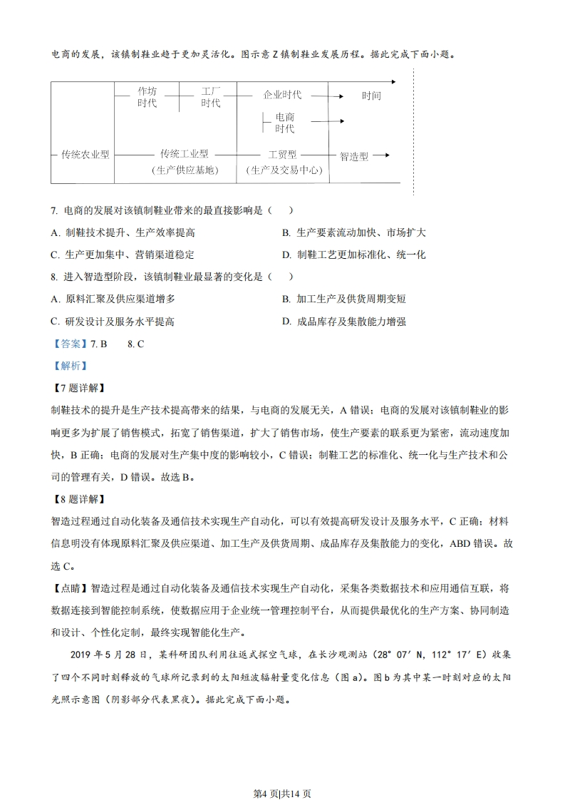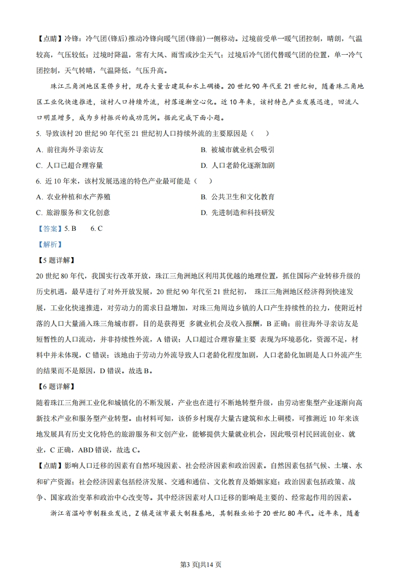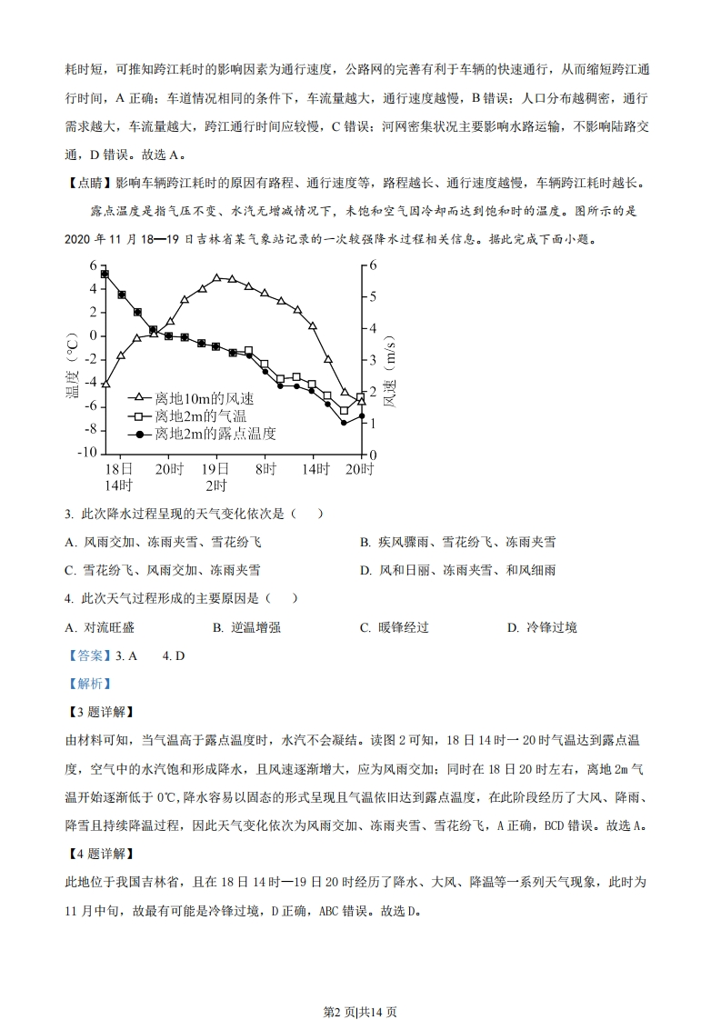 2023年普通高中学业水平选择性考试(广东卷)地理本试卷满分100分,考试时间75分钟。一、选择题:本大题共16小题,每小题3分,共48分。在每小题列出的四个选项中,只有一项符合题目要求。进入21世纪,长江下游跨江桥隧建设发展迅速。有研究统计,2000年长江下游公路跨江桥隧通道仅4条,2008年为9条,2016年增至17条。图示意这三个年份长江下游两岸部分市县距江岸不同直线距离区间的车辆,到达对岸所需平均时间的变化。据此完成下面小题。3.-0-2000年·一2008年0-2016年9日8m北岸南岸08回7●J166'o5斗44买3距北岸20015010050(km)长江050100150200距南岸(km)1.与2000一2008年相比,2008一2016年期间长江下游两岸不同直线距离区间车辆平均跨江耗时的缩减量均表现为()A.大幅增加B.保持不变C.略有增加D.有所减少2.由图中信息可判断,长江下游南岸市县比北岸市县()A.公路网更完善B.车流量更大C.人口更为稠密D.河网更密集【答案】1D2.A【解析】【1题详解】读图可知,2000-2008年,长江下游两岸不同直线距离区间车辆平均跨江耗时的缩减时间都约为2小时,属于大幅减少,2008-2016年两岸不同直线距离区间车辆平均跨江耗时的缩减时间均不足0.5小时,因此2008-2016年两岸不同直线距离区间车辆平均跨江耗时缩减,D正确,ABC错误。故选D。【2题详解】读图可知,长江下游南岸2000年、2008年及2016年距江岸相同距离的平均跨江时间均比北岸略短。影响车辆跨江耗时的原因有路程、通行速度等。由材料可知,南北岸跨江直线距离相同,南岸跨江耗时比北岸第1页共14页耗时短,可推知跨江耗时的影响因素为通行速度,公路网的完善有利于车辆的快速通行,从而缩短跨江通行时间,A正确:车道情况相同的条件下,车流量越大,通行速度越慢,B错误:人口分布越稠密,通行需求越大,车流量越大,跨江通行时间应较慢,C错误:河网密集状况主要影响水路运输,不影响陆路交通,D错误。故选A。【点睛】影响车辆跨江耗时的原因有路程、通行速度等,路程越长、通行速度越慢,车辆跨江耗时越长。露点温度是指气压不变、水汽无增减情况下,未饱和空气因冷却而达到饱和时的温度。图所示的是2020年11月18一19日吉林省某气象站记录的一次较强降水过程相关信息。据此完成下面小题。66,52034-6△-离地10m的风速分0-离地2m的气温-8●离地2m的露点温度-10018日20时19日8时14时20时14时2时3.此次降水过程呈现的天气变化依次是()A.风雨交加、冻雨夹雪、雪花纷飞B.疾风骤雨、雪花纷飞、冻雨夹雪C.雪花纷飞、风雨交加、冻雨夹雪D.风和日丽、冻雨夹雪、和风细雨4.此次天气过程形成的主要原因是()A.对流旺盛B.逆温增强C.暖锋经过D.冷锋过境【答案】3.A4.D【解析】【3题详解】由材料可知,当气温高于露点温度时,水汽不会凝结。读图2可知,18日14时一20时气温达到露点温度,空气中的水汽饱和形成降水,且风速逐渐增大,应为风雨交加:同时在18日20时左右,离地2m气温开始逐渐低于0℃,降水容易以固态的形式呈现且气温依旧达到露点温度,在此阶段经历了大风、降雨、降雪且持续降温过程,因此天气变化依次为风雨交加、冻雨夹雪、雪花纷飞,A正确,BCD错误。故选A。【4题详解】此地位于我国吉林省,且在18日14时一19日20时经历了降水、大风、降温等一系列天气现象,此时为11月中旬,故最有可能是冷锋过境,D正确,ABC错误。故选D。第2页共14页