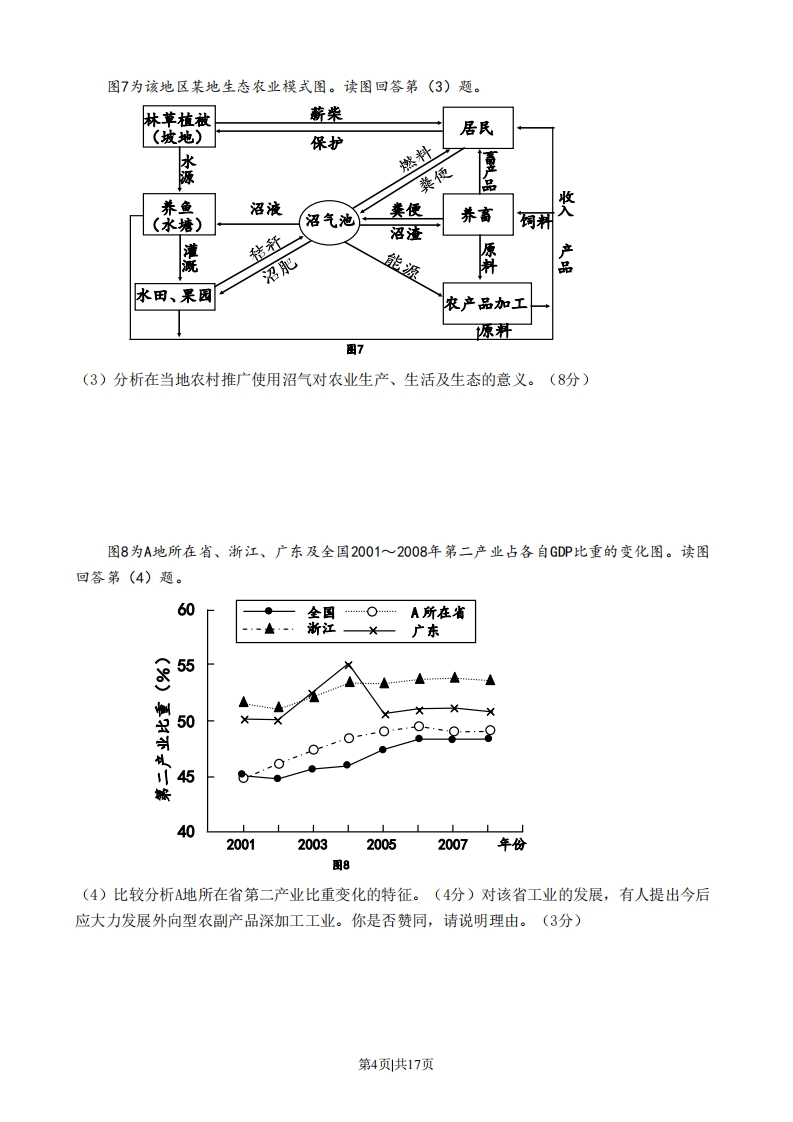 2009年高考山东卷地理图1是世界某区域农业地带分布图。读图回答1一2题。围例30☑种桂业为主曰种椎业和言牧业西有牧业为主亚游牧业田主要林区☐荒漠5拉0山□河流040国11、农业地带沿0°经线变化所反映出的地域分异规律形成的基础是A、水分B、热量C、地形D、土壤2、甲地区是世界上著名的棉花产区,其形成的主导因素是A、光照B、热量C、水源D、土壤图2为某气象台发布的墨西哥湾及邻近海区飓风近地面天气形势图。读图回答3~4题。85°80°75°30°中A市1016100325°1000cA。20°9月日6时(世界时水图例☐雨区92四等压线hP阳)▣忠风路径用23、此时降雨集中分布在飓风东北部的主要原因是A、气流上升速度快B、形成锋面雨C、凝结核多D、气温较低4、预计飓风中心经过70小时到达A市。到达A市时,所在地的区时为A、8日13时B、8月23时C、9日13时D、9日23时第1页共17页艾丁湖的存在对吐鲁番盆地的绿洲的维持具有重要作用。图3是1万多年来艾丁湖变迁示意图。读图回答5~6题。吐香o托克逊.-100-150m510a4■图例巴约1.1万年前☑约0.6万年前☑现代图35、图中信息反映出艾丁湖①湖面低于海平面②古湖盆地势北陡南缓③环境调节作用减弱④含盐量降低A、①③B、③④C、①②D、②④6、艾丁湖1万多年来变迁的主要原因是A、围湖造田B、绿洲萎缩C、湖区汇水面积减少D、气候变干图4为我国西南地区某流域1973一2002年部分土地利用类型面积变化图。读图回答7~8题。3000020000100000袋-10000一20000¥-30000水田军地林地丛建设“岩地草地用地-40000图例☐前期(1973一1990年)☑后期(1990一2002年)图47、关于该流域土地利用类型面积变化的叙述,正确的是A、前期增加后期减少的是林地B、增幅和减幅均最大的是灌丛草地C、前期幅度最大的是旱地D、整个时期耕地总体上是减少的8、以下土地利用类型中,其面积前后期变化能反映流域生态状况由退化趋于好转的是①林地②灌丛草地③建设用地④裸岩地A、①③B、②④C、①④D、②③第2页共17页