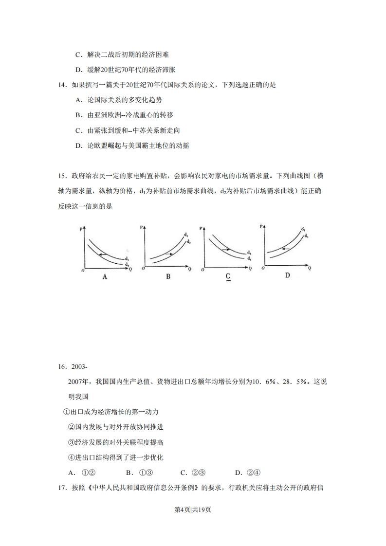 2008年普通高等学校招生全国统一考试(山东卷)文科综合能力测试第I卷(必做,共100分)图1是世界某地区图。读图回答12题1051.图中阴影部分表示该地区某种农产品的主要产区,该农产品为A.茶叶B.玉米C.稻米D.天然橡胶2.下列产业部门中,目前最适宜由中国向图中甲国转移的是A.汽车制造B.精钢锻造C.软件开发D.家具制造图1表1是中美两国的两个苹果产区与北半球苹果生长最适宜区的气候条件和生产成本的相关资料。据表回答3~4题。表1:年平均气温年降水量1月平均气温夏季平均生产成本(℃)(mm)(℃)气温℃(元/千克)中国某产区8-12490-660-1-819-230.64美国某产区15-17470-5206-818-212.05北半球最适宜区8-12560-750>.1419231.203.表中的美国产区最可能位于A.30N~40N西海岸B.30N~40N东海岸C.密西西比河三角洲D.五大湖区4.表中的中国产区与美国产区相比,具有的优势是①年平均气温、年降水量条件更适宜第1页共19页②气温年较差大,有利于苹果糖分的积累③夏季光照条件较好④劳动力成本较低A.①③B.②③C.①④D.②④图2是我国某地区略图,读图回答5~6题。92围何国家地质公国图25.图中四座山地的垂直自然带谱中均有A,山地常绿阔叶林带B.山地针叶林带C.山地荒漠带D.山地冰雪带6.图中景观图片为黄土塬(黄土高原地区面积广阔、地面平坦的黄土高地)。黄土塬上水循环过程不同于黄土高原其它地貌类型区,其最弱的环节是A.降水B.下渗C.蒸发D.地表径流7.下列日期中,北京的昼长与2008年奥运会开幕日那天(8月8日)北京的昼长最接近的是A.奥运圣火火种在希腊雅典采集的那天(3月25日)B.奥运圣火登上珠穆朗玛峰峰顶的那天(5月8日)C.奥运圣火传递至协办城市青岛的那天(7月24日)D.奥运圣火在国家体育场缓缓熄灭的那天(8月24日)唐宋时期,我国古代政治制度进一步发展,经济趋于繁荣。回答89题。8.唐朝中央政府具有较高的行政效率,主要原因在于A.增设机构,独立施政B.分工明确,相互协调第2页共19页