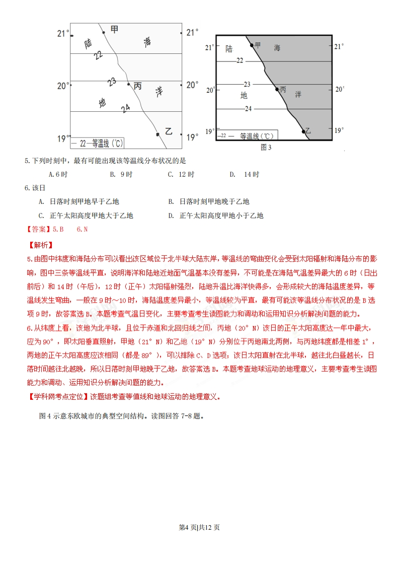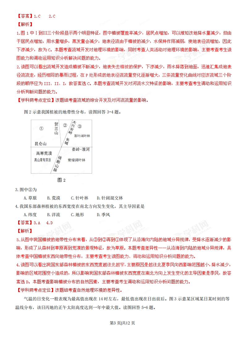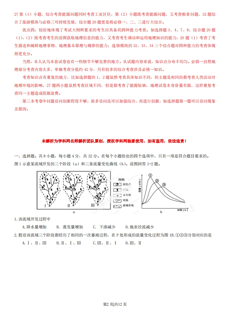 2013年普通高等学校招生全国统一考试(山东卷)文科综合地理【学科网试卷总评】本试卷分第I卷和第Ⅱ卷两部分,第【卷为选择题,共有8道题目,每题4分共32分,第Ⅱ卷为综合题(46分),又分必做(36分)和选做(10分)两部分,满分78分。其中综合题必做包括两道综合题,选做包括三道题,学生作答时选择其中一道题(选择任何一道题作答,满分均为10分)。选择题1、2题考查的是流域开发对地理环境的影响,同时也考查了人类活动对地理环境的影响,第1题考查对水循环和气候的影响,第2题考查对河流径流的影响,同一人类活动,考查多方面的影响,可以分辨出考生对知识掌握是否全面:涉及模块必修一和必修三。3、4题以我国的植被分布模型为背景材料,考查地理环境的整体性和差异性,第3题考查差异性一一从沿海到内陆的地域分异规律,具体考查中国植被东西向地带性分布,第4题以我国南北方森林带东西宽度的差异为例考查影响植被分布的自然因素,考查考生对地理环境整体性的理解,属于必修一模块。5、6两题利用理想区域为背景,考查气温的日变化和地球运动的地理意义,属于模块必修一。7、8两题以东欧城市的典型空间结构为背景材料,考查城市功能区布局及城市空间结构形态,模块分布为必修二综合题26题则是典型的区域地理考查,以我国宁夏平原为背景材料,主要考查必修三区域地理的研究方法,既考查自然地理,又考查人文地理,还同时考查区域可持续发展一一因地制宜的区域发展思想。具体分析第(1)题选择该区域典型地貌景观冲积扇,考查外力作用下地貌的形成过程,第(2)题则考查地形对局部气候的影响,两题属于必修一模块自然地理:第(3)题考查自然环境对农业生产、布局的影响,第(4)题则考查农业区位,因地制宜发展农业,从模块分析应属必修二农业生产。2?题,以巴西甘蔗乙醇生产为切入点,考查世界大问题一一能源问题和粮食问题,同时考查工业区位。第(1)题选择巴西乙醇生产,考查世界能源短缺、解决能源紧张状况的方法,同时考查了工业区位,第(2)题则以我国为代表,既考查能源问题,又考查粮食问题,重点考查学生调动运用知识的能力和全面认识问题,分析解决问题的能力。从模块来看,既涉及必修一中的自然环境对人类活动的影响,有涉及必修二工业区位,(2)题还涉及了必修二农业中的粮食问题。选做题32题为旅游模块,重点考查了主干知识旅游资源的评价和旅游资源开发过程中的注意事项,同时考查了必修三的可持续发展思想。33题为自然灾害模块,以泥石流为例考查自然灾害发生的条件和危害,考查考生读图获取地理信息的能力和调动和运用知识分析问题的能力。34题为环境保护模块,以我国华北某沿海地区景观剖面示意图为材料,考查生态系统的环境功能和生态系统破坏带来的环境问题,主要考查考生读图获取地理信息的能力及调动和运用知识分析问题的能力。综合分析本套卷优点较多。优点一:试题覆盖面较广。三本必修的主干知识都有所涉猎,必修一在选择题中有4道,综合题中有3小题,共42分,必修二在选择题中有2道,综合题中有2小题,共24分,同时考查必修三和必修一的有2道选择题,共12分,和一个大综合题26题,共24分,另有选修同时考查了必修三6分。从区域来看中国地理(宁夏)、世界地理(巴西)均有考查。优点二:重点考查主干知识,没有偏、难、怪题。分析本试卷不难看出,从选择题到综合题主要考查主干知识,即使是考查地球运动的第6题,考查的内容也是昼夜长短和正午太阳高度的简单比较,符合新课改课程标准要求。优点三:体现了地理学科的综合性特点。在题目设置中,有多处将地理知识有机融合进行综合考查,如综合题第1页共12页27第(1)小题,综合考查能源问题同时考查工业区位,第(2)小题既考查能源问题,又考查粮食问题,32题综合了旅游模块与必修三可持续发展,综合题26题更是将必修一、二、三进行大综合。优点四:较好地体现了考试大纲所要求的考生应具备的四种能力考查。如选择题3、4、7、8,综合题26题(1)、(2)既考查考生的读图获取地理信息的能力,又考查考生调动和运用地理知识的能力:26题(1)考查了考生描述和阐释地理事物、地理基本原理与规律的能力:选修模块的32、33、34三个综合题对四种能力的考查体现得更充分。当然,本人认为本套试卷也有一些细节不够完善的地方。从试题内容来说,知识点分布不均匀。必修一自然地理部分考查内容太多,单独考查分值约42分,另有较多的综合考查涉及必修一知识。考查知识点有重复的地方,比如选择题的1、2题虽然考查具体知识不同,但主题是相同的都考查人类活动对地理环境的影响,2?题两小题虽然考查区域不同,但是都考查了能源短缺,地理试卷本身容量有限,这样重复考查同一主题造成资源浪费。第三本考卷中问题设问创新程度不够,很多设问还可以加强综合,再进行创新,如选择题第一题可以设问现象及原因。本解析为学科网名师解析团队原创,授权学科网独家使用,如有盗用,依法追责!一、选择题。共8小题,每小题4分,共32分。在每个小题给出的四个选项中,只有一项是符合题目要求的。图1示意某流域开发的三个阶段()和三条流量变化曲线(b)。读图回答1-2题。①图例【口居民③之了水文站勾河流、可流城养线时间(h)61.该流域开发过程中A.降水量增加B.蒸发量增加C.下渗减少D.地表径流减少2.假设