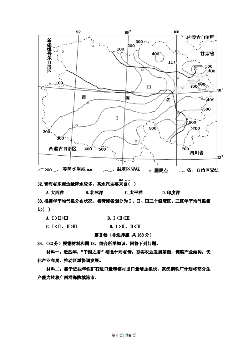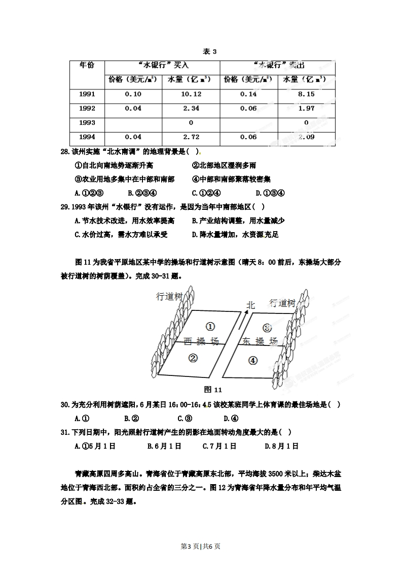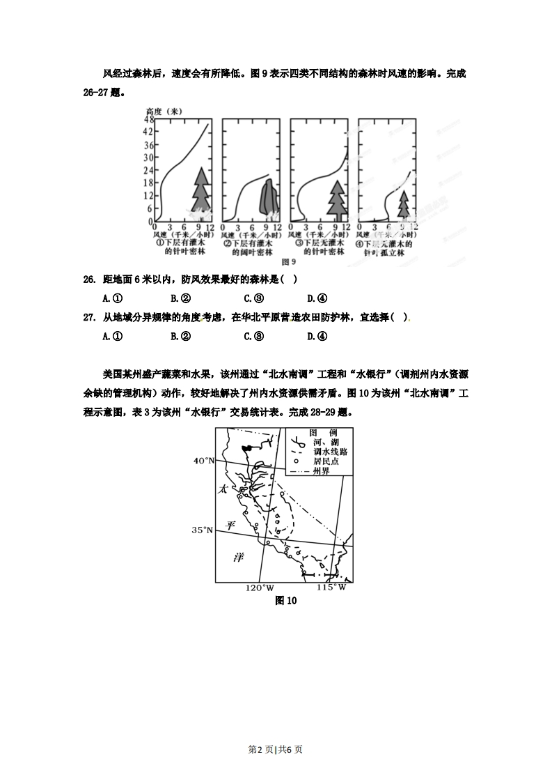 2012年高考安徽文综地理试卷解析(学生版)第I卷(选择题共132分)本卷共33小题,每小题4分,共132分。在每题给出的四个选项中,只有一项是符合题目要求的。图7表示2000-2010年安徽省耕地面积和粮食产量变化,图8表示2000年、2010年安徽省农作物播种面积结构。完成23-25题。耕地面积(万公项)粮食产量(万吨)450r32004403000430280042026004102400400◆耕地面积一粮食产量2200390200020022004200620082010年份图76.3%2.3%图例14.2%21.2%粮食作物蔬菜瓜类10.4%66.1%油料和棉花6.4%73.1%其他作物2004年播种面积841.8万公顷2010年播种面积905.5万公顷图823.2000-2010年,安徽省粮食产量总体呈上升态势的主要原因是()①耕地面积增加②政策支持⑧浓业劳动力增加④科技支撑A.①②B.⑧④C.①⑧D.②④24.与2000年相比,2010年蔬莱瓜类播种面积变化较大,其最主要影响因素是()A水源B.市场C.土骧D.机械化25.在浓业方面,运用遥感技术能够()①监测耕地变化②调查作物分布③估测粮食产量④跟踪产品流向A.①②③B.②③④C.①②④D.①③④第1页|共6页风经过森林后,速度会有所降低。图9表示四类不同结构的森林时风速的彩响。完成26-27题。423624181269126912912风速(千米/小时)风速(千米/小时)风速(千米/小时)风速(千米/办时)①下层有灌木②下层有灌木③下层无灌木④下只无灌木的的针叶密林的阔叶密林的针叶密林针时孤立林图926.距地面6米以内,防风效果最好的森林是()A①B.②c.⑧D.④27。从地域分异规律的角度考虑,在华北平原营造农田防护林,宜选舞().A①B.②C.⑧D.④美国某州盛产蔬菜和水果,该州通过“北水南调”工程和“水银行”(调剂州内水资源余峡的管理机构)动作,较好地解决了州内水资源供需矛盾。图10为该州“北水南调”工程示意图,表3为该州“水银行”交易统计表。完成28-29题。图例河、湖调水线路40N居民点州界35N洋120WW图10第2页|共6页