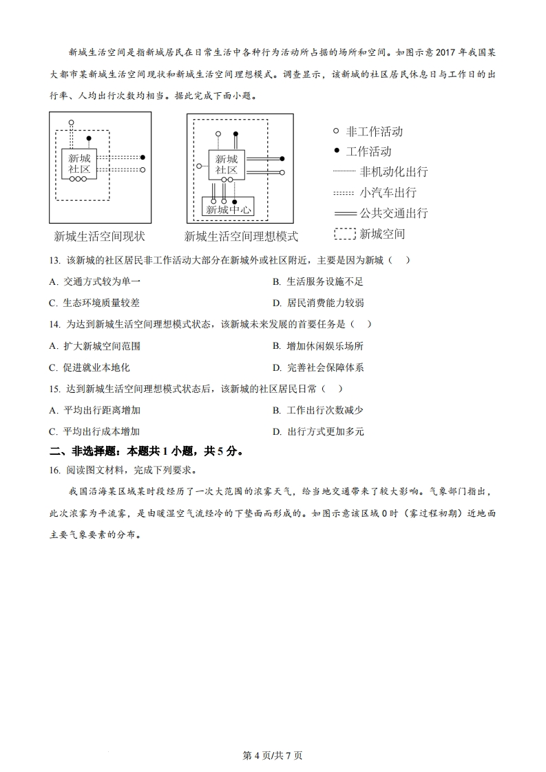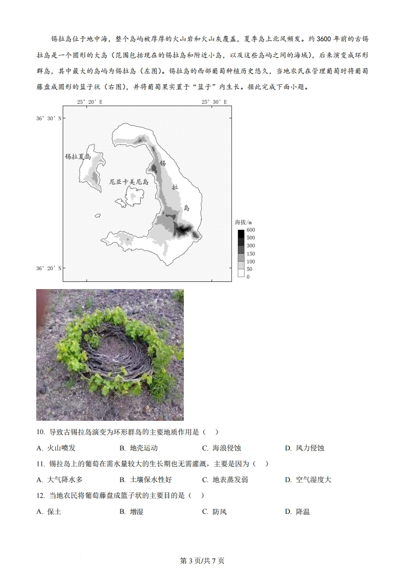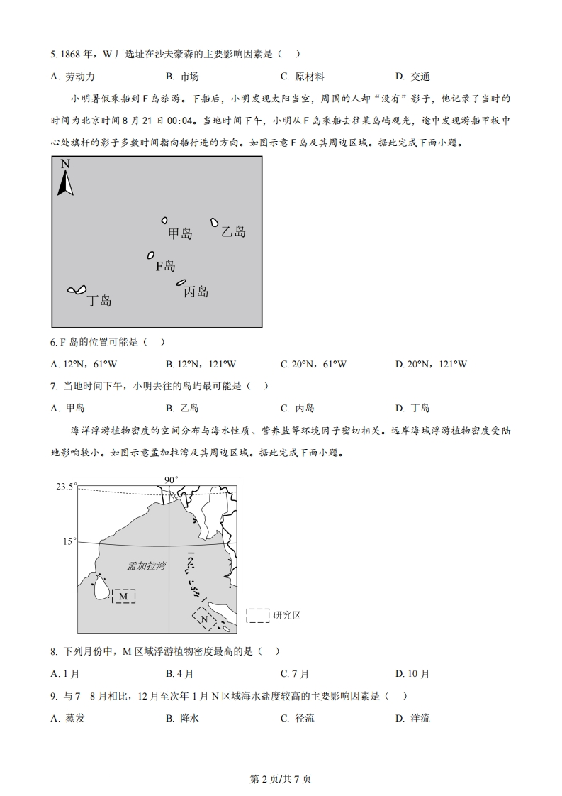 山东省2024年普通高中学业水平等级考试地理限时90分钟满分100分一、选择题:本题共15小题,每小题3分,共45分。平贝(如图)是一种鳞茎入药的名贵中药材,生长周期长,种植投入大。黑龙江省铁力市H村平贝种植历史悠久。在起收平贝后,村民将大辦茎出售、中小辦茎作为种茎分级分区栽植,实现逐年轮流起收。起收的辦茎附着大量泥土,过去村民常在河中手工清洗辦茎。近年来H村新建了沉淀式自动清洗场,将清洗辨茎后沉淀的泥土重新还田。在H村的带动下,铁力市已成为全国最大的平贝栽培和集散基地。据此完成下面小题。鳞茎1.“逐年轮流起收”的主要目的是()A.减少产品损耗B.应对市场风险C.保护种质资源D.降低劳动投入2.与传统清洗方式相比,采用沉淀式自动方式清洗鳞茎有利于()A提高清洗效果B.减少清洗工序C.保持土壤肥力D.提高产品品质3.为打造全国平贝产业高地,铁力市宜重点布局()A.医疗器械企业B.医药制造企业C.食品加工企业D.农机装备企业莱菌河是欧洲的“黄金水道”,其上游的莱菌瀑布是欧洲流量最大的瀑布。位于莱菌瀑布附近的商业小镇沙夫豪森于1045年建城。瑞士制表业始于16世纪中叶,长期以手工作坊方式生产钟表。1868年,一名美国制表师在沙夫豪森创办了瑞士最早期的机械制表工厂一W厂,产品主要销往美国。如今W厂的钟表已成为知名产品。据此完成下面小题。4.商业小镇沙夫豪森的兴起最可能缘于()A.行政管理需求B.金融服务需求C.观光旅游需求D.货物转运需求第1页共7页5.1868年,W厂选址在沙夫豪森的主要影响因素是()A.劳动力B.市场C.原材料D.交通小明暑假乘船到「岛旅游。下船后,小明发现太阳当空,周围的人却“没有”影子,他记录了当时的时间为北京时间8月21日00:04。当地时间下午,小明从F岛乘船去往某岛屿观光,途中发现游船甲板中心处旗杆的影子多数时间指向船行进的方向。如图示意F岛及其周边区域。据此完成下面小题。0甲岛0乙岛0F岛co丁岛丙岛6.F岛的位置可能是()A.12N,61WB.12N,121WC.20°N,61oWD.20N,121W7.当地时间下午,小明去往的岛屿最可能是()A.甲岛B.乙岛C.丙岛D.丁岛海洋浮游植物密度的空间分布与海水性质、营养盐等环境因子密切相关。远岸海域浮游植物密度受陆地影响较小。如图示意孟加拉湾及其周边区域。据此完成下面小题。9023.515孟加拉湾MN二二了研究区8.下列月份中,M区域浮游植物密度最高的是()A.1月B.4月C.7月D.10月9.与7一8月相比,12月至次年1月N区域海水盐度较高的主要影响因素是()A.蒸发B.降水C.径流D.洋流第2页/共7页