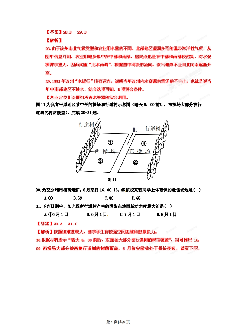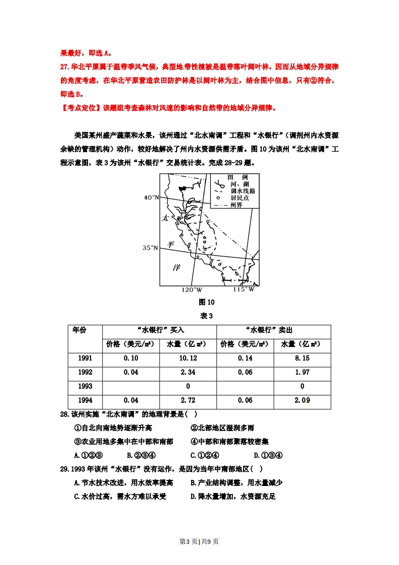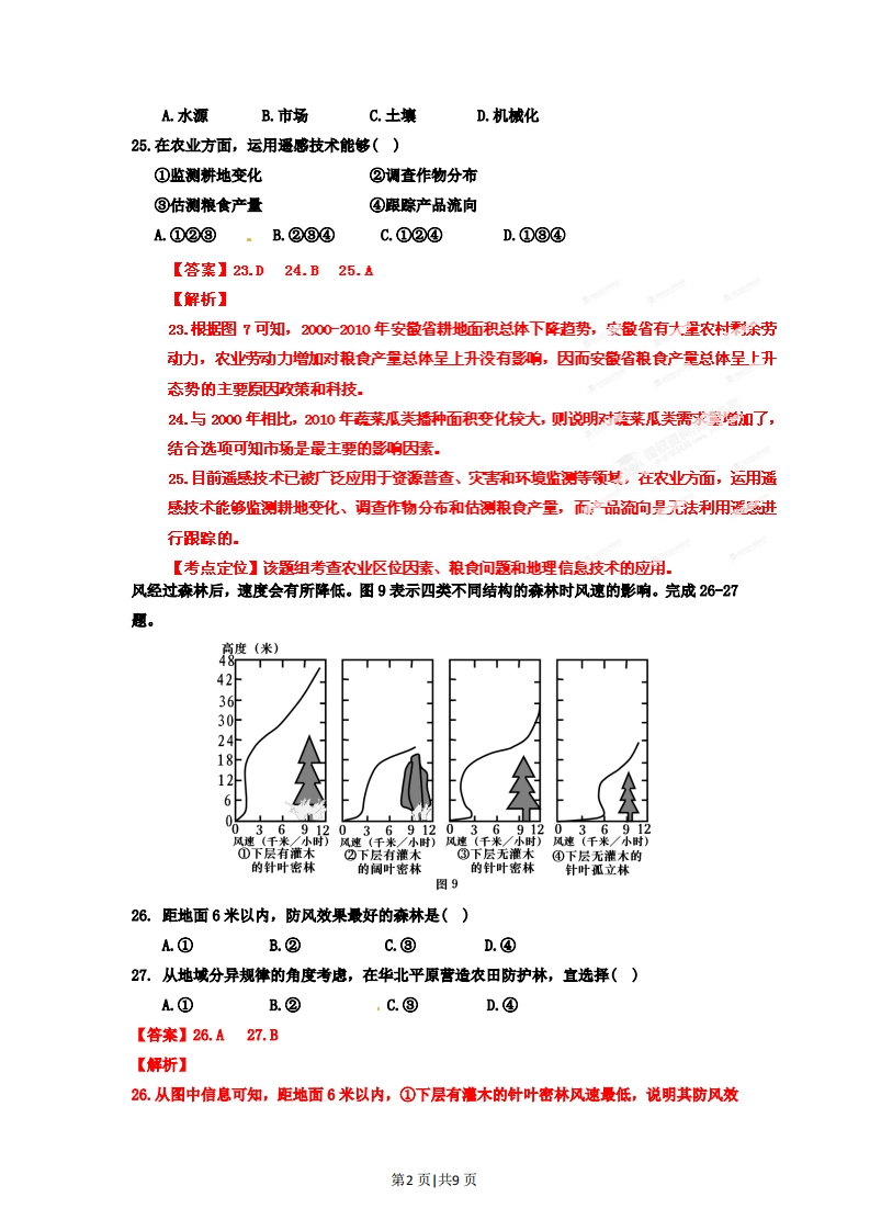 2012年高考安徽文综地理试卷解析(教师版)【试卷总评】试题考查知识较全面,难度适宜,符合新课标地理高考的要求。选择题,命愿紧紧抓住地理学科本身的学科特点以及能力要求,考查学生对地理基本原理的理解和判断能力,通过图表考查学生正确获取地理信息和理解运用的能力,选择题考查自然地理为主,30-31题难度偏大:综合惠分别以湖北省和云南苍山洱海地区为背景材料来命题,难度不大,世界区域地理部分考查相对较少,重点考查学生对材料阅读理解和综合分析的能力,考查学生描述和阐释地理基本原理与规律的能力。,第I卷(选择题共132分)本卷共33小题,每小题4分,共132分。在每题给出的四个选项中,只有一项是符合题目要求的。图7表示2000-2010年安徽省耕地面积和粮食产量变化,图8表示2000年、2010年安徽省农作物播种面积结构。完成23-25题。耕地面积(万公项)粮食产量(万吨)450f32004403000430280042026004102400400士耕地面积银食产量2200390200020022004200620080可年份图76.3%2.3%图例14.2%21.2%粮食作物蔬菜瓜类66.1%油料和棉花73.1%6.4%其他作物2004年播种面积841.8万公顷2010年播种面积905.5万公顷图823.2000-2010年,安徽省粮食产量总体呈上升态势的主要原因是()①耕地面积增加②政策支持⑧农业劳动力增加④科技支撑A①②B.⑧④C.①⑧D.②④24.与2000年相比,2010年蔬菜爪类擂种面积变化较大,其最主要影响因素是())第1页|共9页A水源B.市场C.土壤D.机械化25.在农业方面,运用遥感技术能够()①监测耕地变化②调查作物分布③估测粮食产量④跟踪产品流向A.①②⑧.B.②⑧④C.①②④D.①⑧④【答案】23.D24.B25.4【解析】23.根据图?可知,2000-2010年安量省耕地面积总体下降趋势,安数省有大呈农村形余劳动力,农业劳动力增加对粮食产量总体呈上升没有影赠,因而安徵省粮食产量总体呈上升态势的主要原因策和科技.24.与2000年相此,2010年核菜瓜类美播种面积变化校大,则说明对菜瓜类糯球嗜知了,结合选项可知市场是最主要的影明因素.25.目前遙感技术已被广泛应用于资源普查、灾害和环境监测特领其,在农业方面,运用遙感技术能够监测耕地变化、调查作物分布和估测粮食产量,而产品流向是无法利用汽进行跟踪的.【考点定位】该题组考查农业区位因素、粮食问题和地理信息技术的应用.风经过森林后,速度会有所降低。图9表示四类不同结构的森林时风速的影响。完成26-27题。度米)18691203691203.6912036912风速(千米/小时)风速(千米/小时)风撞(千米/小时)风速(千米/小时)①下层有灌木②下层有灌木③下层无灌木④下层无灌木的的针叶密林的阔叶密林的针叶密林针叶孤立林图926.距地面6米以内,防风效果最好的森林是()A①B.②C.⑧D.④27.从地域分异规律的角度考虑,在华北平原营造农田防护林,宜选择()A①B.②.C.③D.④【答案】26.A27.B【解析】26.从图中信息可知,距地面6米以内,①下层有灌木的针叶密林风速最低,说明其防风效第2页|共9页