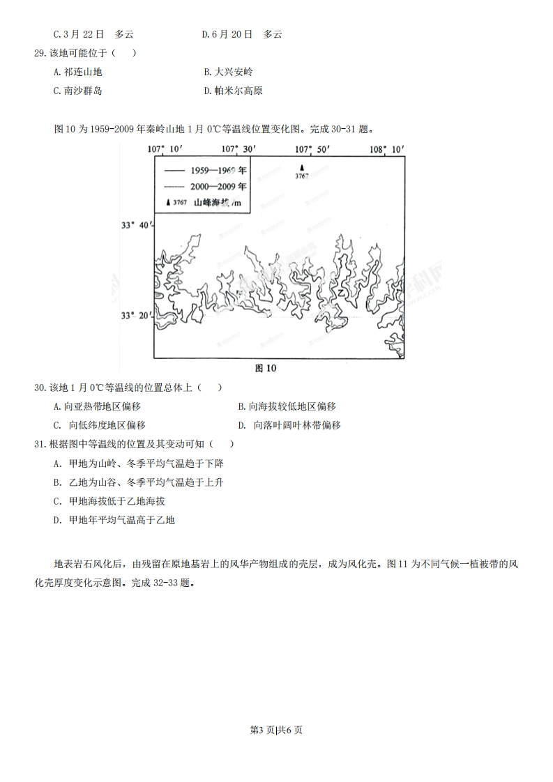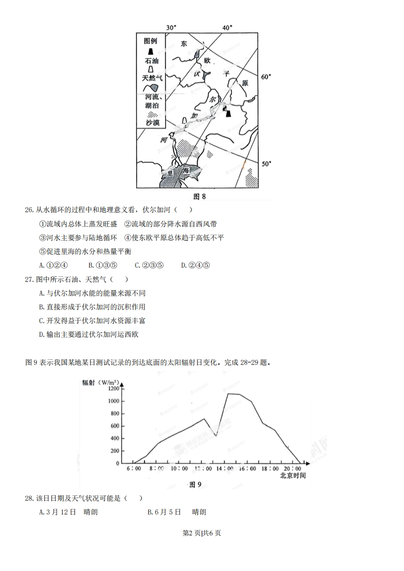 2013年普通高等学校招生全国统一考试(安徽卷)文科综合通理部分图7表示安徽省1985-2010年就业结构与城镇人口比重变化。完成23-25题。就业比重(%)城镇人口比重(%)1005080406030402020100198519901995200020052010(年份)☑第一产业o第二产业第三产业士城镇人口比重图723.2005年以来,安徽省城市处于()A.初期阶段B.中期阶段C.后期阶段D.逆城市化阶段24.产业结构调整促进安徽省城市化水平的提高,表现在()A.第二、三产业就业比重均持续快速提高B.城镇新增就业人口第二产业超过第三产业C.农村人口向东部沿海海域迁移数量增加D.劳动力主要由第一产业向第二.三产业转移25.为增强工业对就业和农业产业化的带动作用,近期安徽省中小城市可以着力发展()A.劳动力导向型和原料导向型工业B.技术导向型和市场导向型工业C.劳动力导向型和劳动力导向型工业D.原料导向型和技术导向型工业图8为伏尔加河主要流经地区示意图。完成26-27题第1页供6页30°40°图例东A石油天然气60*0河流、湖泊沙漠A50°图826.从水循环的过程中和地理意义看,伏尔加河()①流域内总体上蒸发旺盛②流域的部分降水源自西风带③河水主要参与陆地循环④使东欧平原总体趋于高低不平⑤促进里海的水分和热量平衡A.①②④B.①③⑤C.②③⑤D.②④⑤27.图中所示石油、天然气()A.与伏尔加河水能的能量来源不同B.直接形成于伏尔加河的沉积作用C.开发得益于伏尔加河水资源丰富D.输出主要通过伏尔加河运西欧图9表示我国某地某日测试记录的到达底面的太阳辐射日变化。完成28-29题。辐射(W品f1000800600上4002006:008:0010:0012:0014:0016:0018:0020:00北京时间图928.该日日期及天气状况可能是()A.3月12日晴朗B.6月5日睛朗第2页供6页