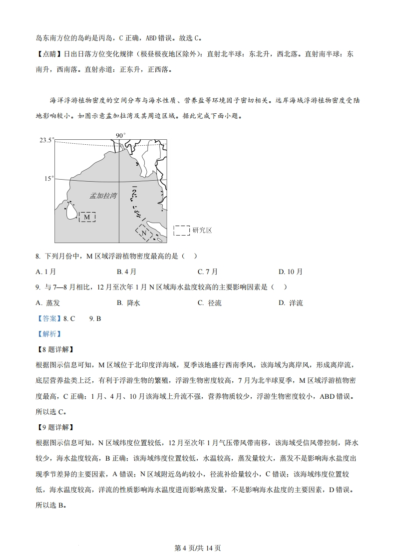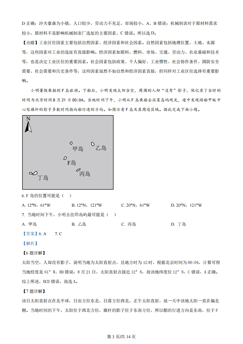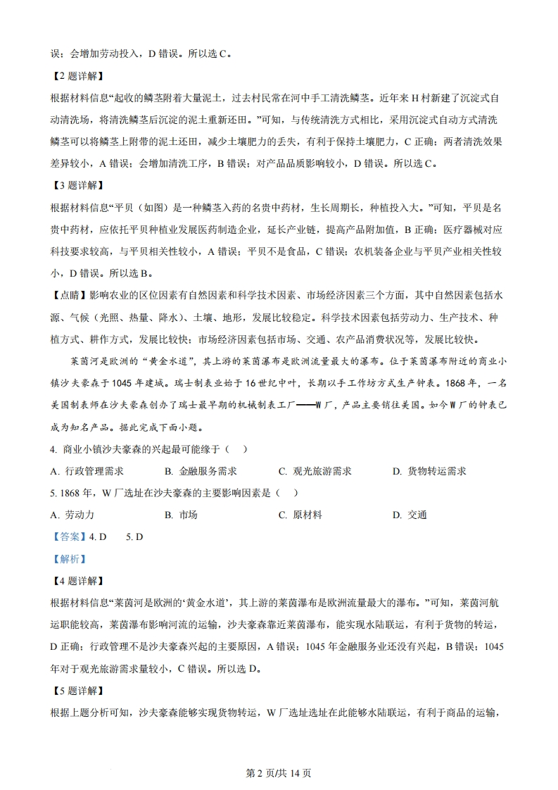 山东省2024年普通高中学业水平等级考试地理限时90分钟满分100分一、选择题:本题共15小题,每小题3分,共45分。平贝(如图)是一种鳞茎入药的名贵中药材,生长周期长,种植投入大。黑龙江省铁力市H村平贝种植历史悠久。在起收平贝后,村民将大辦茎出售、中小辦茎作为种茎分级分区栽植,实现逐年轮流起收。起收的辦茎附着大量泥土,过去村民常在河中手工清洗辦茎。近年来H村新建了沉淀式自动清洗场,将清洗辨茎后沉淀的泥土重新还田。在H村的带动下,铁力市已成为全国最大的平贝栽培和集散基地。据此完成下面小题。鳞茎1.“逐年轮流起收”的主要目的是()A.减少产品损耗B.应对市场风险C.保护种质资源D.降低劳动投入2.与传统清洗方式相比,采用沉淀式自动方式清洗鳞茎有利于()A.提高清洗效果B.减少清洗工序C.保持土壤肥力D.提高产品品质3.为打造全国平贝产业高地,铁力市宜重点布局()A.医疗器械企业B.医药制造企业C.食品加工企业D.农机装备企业【答案】1.C2.C3.B【解析】【1题详解】根据材料信息“在起收平贝后,村民将大鳞茎出售、中小鳞茎作为种茎分级分区栽植,实现逐年轮流起收。”可知,“逐年轮流起收”是将大鳞茎出售,中小鳞茎作为种茎分级分区栽植,能够保护种质资源,提高平贝产量,C正确:“逐年轮流起收”不能减少产品损耗,A错误:对于应对市场风险的作用较小,B错第1页供14页误:会增加劳动投入,D错误。所以选C。【2题详解】根据材料信息“起收的鳞茎附着大量泥土,过去村民常在河中手工清洗鳞茎。近年来H村新建了沉淀式自动清洗场,将清洗鳞茎后沉淀的泥土重新还田。”可知,与传统清洗方式相比,采用沉淀式自动方式清洗鳞茎可以将鳞茎上附带的泥土还田,减少土壤肥力的丢失,有利于保持土壤肥力,C正确:两者清洗效果差异较小,A错误:会增加清洗工序,B错误:对产品品质影响较小,D错误。所以选C。【3题详解】根据材料信息“平贝(如图)是一种鳞茎入药的名贵中药材,生长周期长,种植投入大。”可知,平贝是名贵中药材,应依托平贝种植业发展医药制造企业,延长产业链,提高产品附加值,B正确:医疗器械对应科技要求较高,与平贝相关性较小,A错误:平贝不是食品,C错误:农机装备企业与平贝产业相关性较小,D错误。所以选B。【点睛】影响农业的区位因素有自然因素和科学技术因素、市场经济因素三个方面,其中自然因素包括水源、气候(光照、热量、降水)、土壤、地形,发展比较稳定。科学技术因素包括劳动力、生产技术、种植方式、耕作方式,发展比较快:市场经济因素包括市场、交通、农产品消费状况等,发展比较快。莱菌河是欧洲的“黄金水道”,其上游的莱菌瀑布是欧洲流量最大的瀑布。位于莱菌瀑布附近的商业小镇沙夫豪森于1045年建城。瑞士制表业始于16世纪中叶,长期以手工作坊方式生产钟表。1868年,一名美国制表师在沙夫豪森创办了瑞士最早期的机械制表工厂一W厂,产品主要销往美国。如今W厂的钟表已成为知名产品。据此完成下面小题。4.商业小镇沙夫豪森的兴起最可能缘于()A.行政管理需求B.金融服务需求C.观光旅游需求D.货物转运需求5.1868年,W厂选址在沙夫豪森的主要影响因素是()A.劳动力B.市场C.原材料D.交通【答案】4.D5.D【解析】【4题详解】根据材料信息“莱茵河是欧洲的黄金水道',其上游的莱茵瀑布是欧洲流量最大的瀑布。”可知,莱茵河航运职能较高,莱茵瀑布影响河流的运输,沙夫豪森靠近莱茵瀑布,能实现水陆联运,有利于货物的转运,D正确:行政管理不是沙夫豪森兴起的主要原因,A错误:1045年金融服务业还没有兴起,B错误:1045年对于观光旅游需求量较小,C错误。所以选D。【5题详解】根据上题分析可知,沙夫豪森能够实现货物转运,W厂选址选址在此能够水陆联运,有利于商品的运输,第2页供14页