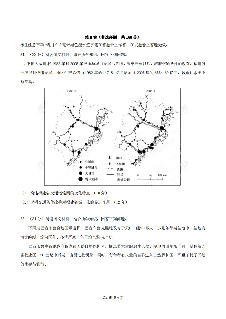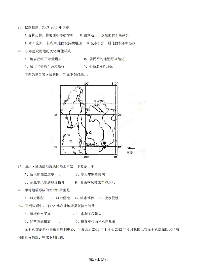 2015年普通高等学校招生全国统一考试(安徽卷)文科综合地理第I卷本卷共33小题。每小题4分,共132分。在每个小题给出的四个选项中,只有一项是符合题目要求的。下图为25°N-32°N之间某区域遥感影像。完成下列问题。地精图23、图示地区主要的陆地自然带是()A.荒漠带B.热带草原带C.热带雨林带D.亚热带常绿阔叶林带24、图示地区有世界重要的海上交通贸易通道。该通道便捷地连接了()A.北美东岸与西欧B.东亚与南亚C.北美东岸与西岸D.西欧与南亚.下图表示某市2003一2013年土地利用面积变化情况。完成下列问题。面积k)6000☐2003年S000▣2006年口2009年4000图2013年3000200010000a耕地林地建设用地水城未利用地第1页供5页25、据图推测,2003-2013年该市A.退耕还林,林地面积持续增加B.围湖造田,水域面积不断减少C.水土流失,未利用地面积持续增加D.城市扩张,耕地面积不断减少26、该市建设用地的变化可能导致A、地表径流下渗量增加B、居民平均通勤距离缩短C、城市“热岛”效应增强D、生物多样性增加下图为世界某区域略图,完成下列问题。。100110梵回识线3010河流1001027、图示区域西部沿海地区降水丰富,主要是由于A、反气旋频繁过境B、受沿岸寒流影响C、东北季风受到地形抬升D、西南季风带来丰沛水汽28、甲地地貌形成的外力作用主是A、风力堆积B、风力侵蚀C、流水堆积D、流水侵蚀29、下列选项中,符合乙地农业地域类型特点的是A、机械化水平高·B、水利工程量大C、经营方式粗放D、粮食单位面积总产量低企业总部是企业决策和控制中心。下表表示2001年1月至2012年4月我国上市企业总部在四大区域间的迁移情况。完成下列问题。第2页供5页