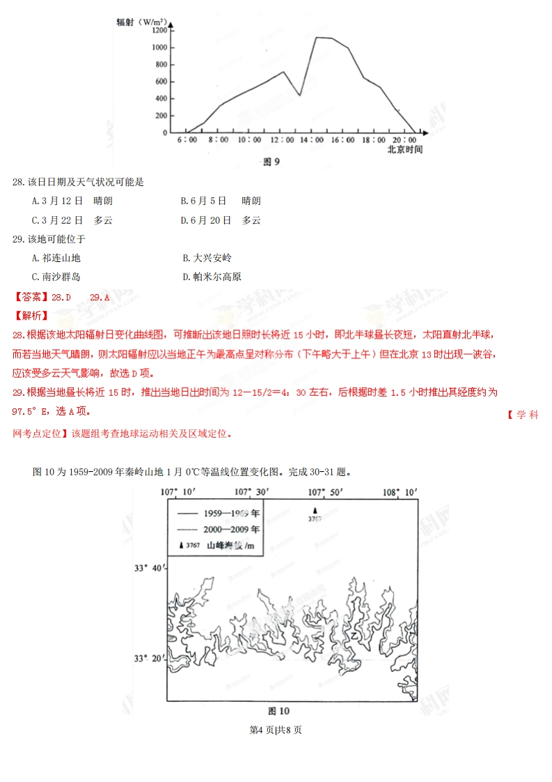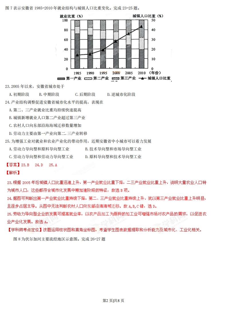 2013年普通高等学校招生全国统一考试(安徽卷)文科综合地理部分2013年安徽高考地理试题总体上考查全面、试题质量高、难度有所上升,加大了对基本原理及其运用的考查和拓展,即如将理论知识与生活生产实际相结合:选择题的灵活性增强,各选项表述的迷惑性较强。具体表现以下特点:一、突出能力立意,体现新课改精神。安徽省《考试说明》指出:“所列考试内容的考察程度不超过课程标准的要求。”学习生活中的地理知识,学习有用的地理知识,运用所学地理知识解决实际问题等,一直是新课程地理教学的基本理念。这一理念在今年我省高考地理试题中得到较好体现:地理试题以考查地理学科的基础知识和能力为主。试题将所学知识点、方法及原理有机结合起来,减少了对记忆性知识的考查,而是采用能力立意的题目,突出对解决问题思路的宏观整体认识和把握,考查解决实际问题的能力。命题意图明确,渗透新课程的理念。二、充分体现地理学科特色。1.全卷共有?幅地图。每一组题均需从图表中解读、获取信息、运用信息,并在整个信息处理过程中寻找解题思路和答案。正如考纲所要求,考生“能够快速、全面、准确地获取图形语言形式的地理信息,包括判读和分析各种地理图表所承载的信息。”当然,只要学生通过对图文信息的认识,启动原有知识储备,再经过判断推理、归纳等思考过程,就可以解决问题。2.试题内容结构合理,以自然为主、兼顾人文,知识点的覆盖面很广,分布较为均衡。3.试题体现了地理学科的综合性和区域性。综合性和区域性是地理学科的两大特点,将地理问题落实到不同空间尺度的具体区域米考查,如第34题利用“区域地面天气图”考查等压线的分布特点、气象灾害的判断及形成条件,有效地考查了学生区域知识与综合分析问题、解决问题的能力。安徽高考地理考试说明一直强调“谈化单一知识点的个别考查,强化多方面知识的综合考查,关注知识间的内在联系;淡化脱离具体情境的理论考查,强化联系特定区域的应用考查,关注社会现实和学科发展”,这在今年的试卷得到充分体现。如地理卷第26、27题组,以“伏尔加河主要流经地区示意图”创设情境,考查了《课程标准》中“运用示意图,说出水循环的过程和主要环节,说明水循环的地理意义”、“结合实例,分析造成地表形态变化的内外力因素”、“阐述太阳对地球的影响”、“以某区域为例,分析该区域能源和矿产资源的合理开发和区域可持续发展的关系”、“对世界经济发展影响较大的自然资源及其分布、生产、贸易等情况”、“世界主要河流,湖泊及其水文特征”等知识。要求考生快速、全面、准确地获取图形语言形式的地理信息,能够调动和运用基本的地理原理与规律等知识作答。三、突出主干知识,注重双基考查。地理知识是考查的对象,更是考查的载体。试卷的题量不大,共计十道选择题,两道综合题,但信息量很大,正所谓“小题量,大容量”,所考查知识点均为地理学科的主干知识,尤其注重对基本原理和规律的考查。四、关注热点焦点,重视乡土地理。地理试题不回避热点焦点,且能将热点事件或热点地区与地理知识、原理有机结合起来,贴近学生生活来命题。乡土地理是今年的新增考试内容,《考试说明》要求考生了解安徽省自然地理总体特征和主要自然灾害以及人口、资源、环境、发展等方面的主要问题及其基本对策。选择题第23、24题就是以安徽省情为背景命题,涉及产业结构变化、人口就业结构变化、人口迁移、城市化等热点话题,效果很好。第1页共8页图7表示安徽省1985-2010年就业结构与城镇人口比重变化。完成23-25题。就业比重(%)城镇人口比重(%)1005080406030402020100198519901995200020052010(年份)☑第一产业⊙第二产业四第三产业城镇人口比重」】23.2005年以来,安徽省城市处于A.初期阶段B.中期阶段C.后期阶段D.逆城市化阶段24.产业结构调整促进安微省城市化水平的提高,表现在A.第二、三产业就业比重均持续快速提高B.城镇新增就业人口第二产业超过第三产业C.农村人口向东部沿海海域迁移数量增加D.劳动力主要由第一产业向第二.三产业转移25.为增强工业对就业和农业产业化的带动作用,近期安微省中小城市可以着力发展A.劳动力导向型和原料导向型工业B.技术导向型和市场导向型工业C.劳动力导向型和劳动力导向型工业D.原料导向型和技术导向型工业【答案】23.B24.D25.A【解析】23.根据2005年后城镇人口比重迅速上升,第一产业就业此重下降,二三产业就业比重上升,说明大量农业人口转为城市人口,这些都符合城市化发展中期加速阶段的特征,故选B项.24.据图可判断出第一产业就业比重持续下降,第二、三产业就业比重持续上升,犹以第三产业就业比重上升明显,且逐步占居主导。从图中无法判断农村人口向东部沿海海域迁移。故A,B,C错,选D.25.劳动力导向型企业的发展可提高就业率,以农产品加工为原料的加工业可增强市场对农产品的需求,以促进农业产业化发展。故选A【学科网考点定位】该题运用柱状图和直角坐标图,考查学生图表数据提取和分析能力及城市化、工业化相关。图8为伏尔加河主要流经地区示意图。完成26-27题第2页供8页