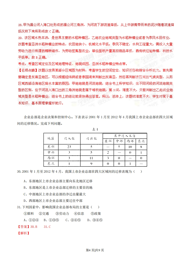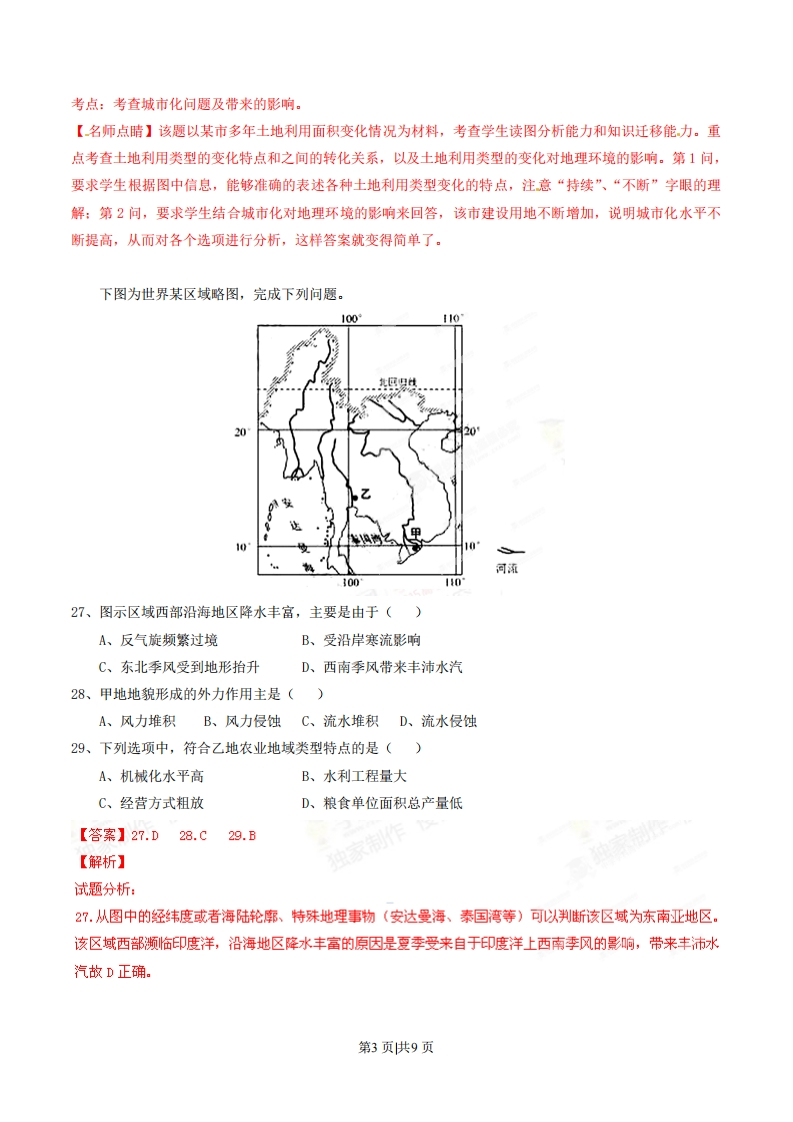 2015年普通高等学校招生全国统一考试(安徽卷)文科综合地理第I卷本卷共33小题。每小题4分,共132分。在每个小题给出的四个选项中,只有一项是符合题目要求的。下图为25°N-32°N之间某区域遥感影像。完成下列问题。图423、图示地区主要的陆地自然带是()A.荒漠带B.热带草原带C.热带雨林带D.亚热带常绿阔叶林带24、图示地区有世界重要的海上交通贸易通道。该通道便捷地连接了()A.北美东岸与西欧B.东亚与南亚C.北美东岸与西岸D.西欧与南亚【答案】23.A24.D【解析】试题分析:23.从遥感影像中拍摄的海陆轮廓及地中海、河流等信息可以判断该区域为西亚和北非地区,该区域常年在副热带高压的控制下,盛行下沉气流,或受来自陆地的信风影响,多晴朗干燥天气,所以形成的气候类型为热带沙漠气候,对应之下的陆地自然带为热带荒漠带故A正确。24.阿拉伯半岛和非洲之间狭长水域为红海,红海是世界重要的海上交通贸易通道。其西北面通过苏伊士运河与地中海相连,南面通过曼德海峡与亚丁湾(印度洋)相连,是欧洲、亚洲(南亚)间的交通航道,是一条重要的石油运输通道,具有成略价值。故D正确:考点:考查区域定位及区域地理特征。【名师点睛】解答此题的关键是空间定位,根据该区域的纬度范围25°N-32°N和轮廓,判断该区域为埃第1页供9页及,从而确定图示地区主要的陆地自然带是热点荒漠带:第2问,该地区作为世界重要的海上交通贸易通道,便捷地连接两个区域的判断,也是根据空间定位后,就能准确判断连接了西欧与南亚,其它三个选项都不符合条件。总体上,此难度不大,但对空间定位要求较高,这样也就要求学生平时复习过程中,对世界区域的空间定位加强训练。下图表示某市2003-2013年土地利用面积变化情况。完成下列问题。面积kr)6000国2003年S000▣2006年口2009年4000息2013年3000200010000.ra.maa.cm耕地林地建设用地水城未刊用地25、据图推测,2003-2013年该市()A.退耕还林,林地面积持续增加B.围湖造田,水域面积不断减少C.水土流失,未利用地面积持续增加D.城市扩张,耕地面积不断减少26、该市建设用地的变化可能导致()A、地表径流下渗量增加B、居民平均通勤距离缩短C、城市。“热岛”效应增强D、生物多样性增加【答案】25.D26.c【解析】试题分析:25.该题认真分析图中各要素的变化。从图中可以看出林地面积是先增后减,而不是持续增加A错误;水域面积也是先增后减,但是变化不大,而不是不断减少B错误,未利用地面积也是先增后减,而不是持续增加C错误,图中建设用地持续增加,耕地面积持续下降,说明城市化的过程占用大量耕地使耕地面积不断减少故D正确。26,首先从上题分析或者从图中看出建设用地发生什么的变化,即面积持续增加,带来的影响应从城市化过程带来的影响角度分析。建设用地增加,使地表硬化,下渗量减少A错误,城市化过程使城市面积扩大,以及现代交通工具让住在较远处的人可以快捷地上班,居民平均通勤距离会变长B错误;建设用地增加,硬化地表,不透水地表面积所占比例增加,会增强城市热岛效应C正确:建设用地增加,会破坏地表,影响生物的栖息地,使生物多样性受损D错误。第2页供9页