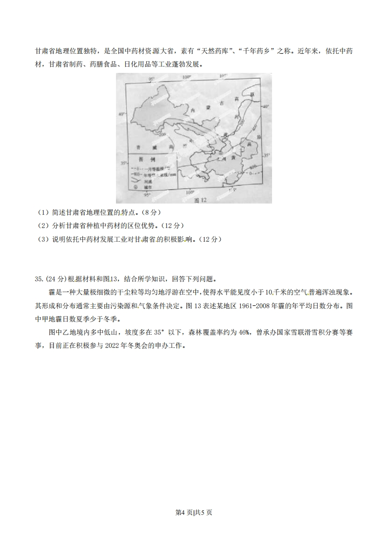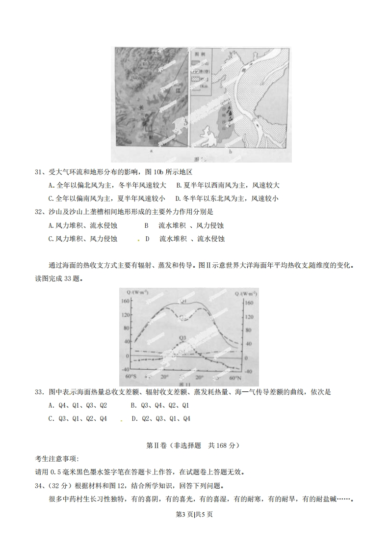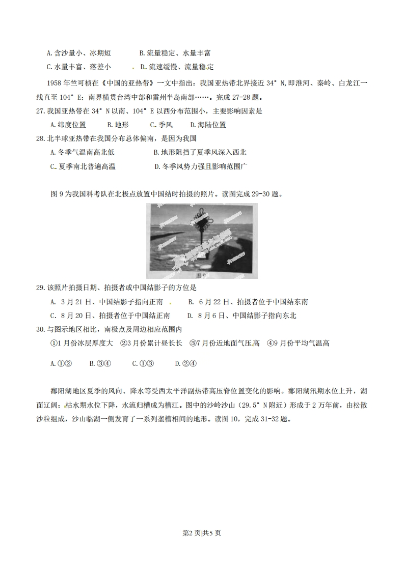 2014年普通高等学校招生全国统一考试(安徽卷)文科综合地理第I卷本卷共33小题。每小题4分,共132分。在每个小题给出的四个选项中,只有一项是符合题目要求的。2013年12月,安徽省人民政府颁布《安徽省主体功能区规划》(主要规划目标到2020年),从开发内容上将全省划分为农产品主产区、城市化地区和重点生态功能区(图7)。完成23-24题。023.图中代表重点生态功能区、城市化地区、农产品主产区的分别是A.I、Ⅱ、IB.I、I、ⅡC.Ⅱ、Π、ID.I、I、Ⅱ24.三类区域中A.区间人口迁移主要由Ⅱ区迁到I区B.铁路建设成本Ⅱ区一般大于Ⅲ区C.商业网点密度Ⅲ区一般大于I区D.承接省外产业转移的主要是Ⅱ区欧洲鳗孵化于马尾藻海,幼体随着洋流到达欧洲西部沿海,然后进入河流生活,成年后回到马尾藻海,产卵后死亡。读图8,完成25-26题。出825.欧洲鳗从马尾藻海西南部迁往欧洲,首先借助的洋流属于①以副热带为中心的大洋环流②以副极地为中心的大洋环流③寒流④暖流A.①③B.①④C.②③D.②④26.甲地自然环境深受海洋影响,在河流水文特征方面表现为第1页供5页A.含沙量小、冰期短B.流量稳定、水量丰富C.水量丰富、落差小·D.流速缓慢、流量稳定1958年竺可桢在《中国的亚热带》一文中指出:我国亚热带北界接近34°N,即淮河、秦岭、白龙江一线直至104°E:南界横贯台湾中部和雷州半岛南部…。完成27-28题。27.我国亚热带在34°N以南、104°E以西分布范围小,主要影响因素是A.纬度位置B.地形C.季风D.海陆位置28.北半球亚热带在我国分布总体偏南,是因为我国A.冬季气温南高北低B.地形阻挡了夏季风深入西北C.夏季南北普遍高温D.冬季风势力强且影响范围广图9为我国科考队在北极点放置中国结时拍摄的照片。读图完成29-30题。29.该照片拍摄日期、拍摄者或中国结影子的方位是A.3月21日、中国结影子指向正南·B.6月22日、拍摄者位于中国结东南C.8月20日、拍摄者位于中国结正南D.8月6日、中国结影子指向东北30.与图示地区相比,南极点及周边相应范围内①1月份冰层厚度大②3月份累计昼长长③7月份近地面气压高④9月份平均气温高A.①②B.③④C.①③D.②④鄱阳湖地区夏季的风向、降水等受西太平洋副热带高压脊位置变化的影响。鄙阳湖汛期水位上升,湖面辽阔:枯水期水位下降,水流归槽成为槽江。图中的沙岭沙山(29.5°N附近)形成于2万年前,由松散沙粒组成,沙山临湖一侧发育了一系列垄槽相间的地形。读图10,完成31-32题。第2页供5页