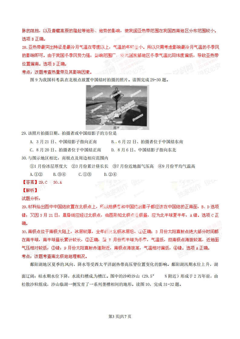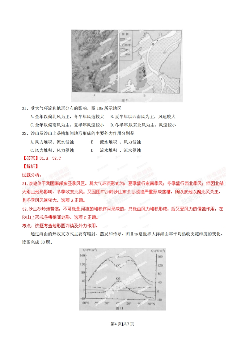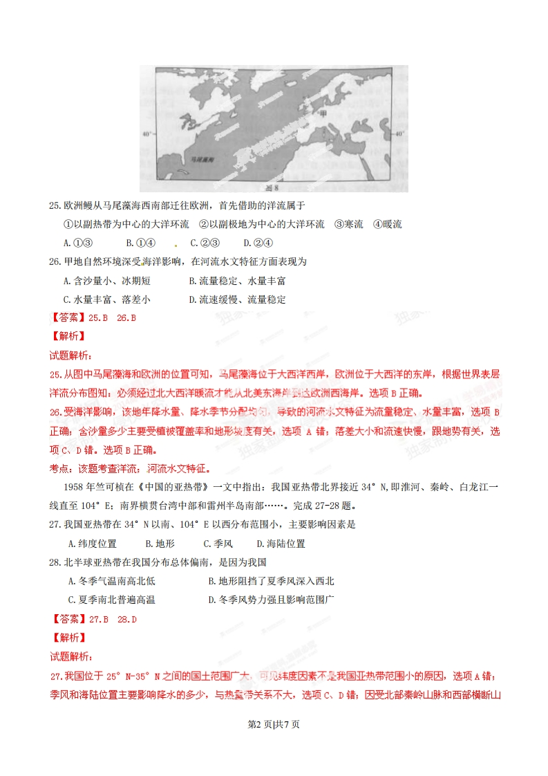 2014年普通高等学校招生全国统一考试(安徽卷)文科综合地理第I卷本卷共33小题。每小题4分,共132分。在每个小题给出的四个选项中,只有一项是符合题目要求的。2013年12月,安徽省人民政府颁布《安徽省主体功能区规划》(主要规划目标到2020年),从开发内容上将全省划分为农产品主产区、城市化地区和重点生态功能区(图7)。完成23-24题。围例50k23.图中代表重点生态功能区、城市化地区、农产品主产区的分别是A.I、Ⅱ、B.I、Ⅲ、ⅡC.Ⅱ、Ⅲ、ID.Π、I、Ⅲ24.三类区域中A.区间人口迁移主要由Ⅱ区迁到I区B.铁路建设成本Ⅱ区一般大于区C.商业网点密度区一般大于I区D.承接省外产业转移的主要是Ⅱ区【答案】23.D24.A【解析】试题分析:23.III区域位于南部山区,水土流失严重,多环境问,应为重点生态功能区,I分布范围较小,位于河流和平原区,经济较发达,应为城市化地区,Ⅱ分布空间大,她形队以平原为主,应为农产品主产区。选项D正确。24.Ⅱ区为城市化地区,经济发达,1区为农产品主产区,经济发展水平低,区间人口迁移主要由Ⅱ区迁到I区,A选项正确:铁路建设在重点生态功能区因地形地势影响成本较高,B错;商业网点城市化地区密度较大,C错;承接外来产业转移只有在当地基础设施此较完善的城市化区较好,D错。选项A正确。考点:该题考查区域经济发展知识。欧洲鳗孵化于马尾藻海,幼体随着洋流到达欧洲西部沿海,然后进入河流生活,成年后回到马尾藻海,产卵后死亡。读图8,完成25-26题。第1页供7页25.欧洲鳗从马尾藻海西南部迁往欧洲,首先借助的洋流属于①以副热带为中心的大洋环流②以副极地为中心的大洋环流③寒流④暖流A.①③B.①④.C.②③D.②④26.甲地自然环境深受海洋影响,在河流水文特征方面表现为A.含沙量小、冰期短B.流量稳定、水量丰富C.水量丰富、落差小D.流速缓慢、流量稳定【答案】25.B26.B独分【解析】试题解析:25.从图中马尾藻海和欧洲的位置可知,马尾藻海位于大西洋西岸,欧洲位于大西洋的东岸,根据世界表层洋流分布图知:必须经过北大西洋暖流才能从北美东海弹达欧洲西海岸。选项B正确。6.受海洋影响,该地年降水量、降水季节分配女匀,导致的河流水文特征为流量稳定、水量丰富,选项B正确:含沙量多少主要受植被覆盖率和地形城度有关,选项A错;落差大小和流速快慢,跟地势有关,选项C、D错。选项B正确。考点:该题考查洋流:河流水文特征。1958年竺可桢在《中国的亚热带》一文中指出:我国亚热带北界接近34°N,即淮河、秦岭、白龙江一线直至104°E:南界横贯台湾中部和雷州半岛南部…。完成27-28题。27.我国亚热带在34°N以南、104°E以西分布范围小,主要影响因素是A.纬度位置B.地形C.季风D.海陆位置28.北半球亚热带在我国分布总体偏南,是因为我国A.冬季气温南高北低B.地形阻挡了夏季风深入西北C.夏季南北普遍高温D.冬季风势力强且影响范围广【答案】27.B28.D【解析】试题解析:27.我国位于25°-35°N之间的国土范围广大,可见度因素不是我国亚热带范围小的原因,选项A错:季风和海陆位置主要影响降水的多少,与热美带关系不大,选项C、D错:因受北部秦岭山脉和西部横断山第2页供7页