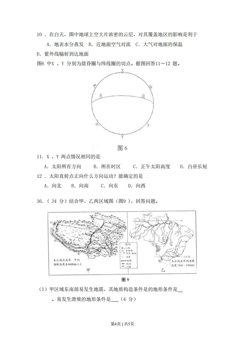 2008年高考天津卷文科综合地理部分分析图1中天津的文化景观,回答12题。一海河上竹一一南开大学1.由自然条件决定其主要功能的一组文化景观是A.甲乙B.乙丙C.乙丁D.丙丁2.在天津的下列产业部门中,能充分合理利用J一图中设施所开采资源的是A.化学工业B.电力工业C.交通运输业D.汽车工业读某区域部分地理信息图(图2),回答3~4题。上月,23°26月--232626。盛行气流…洋流图23.甲区域气候一年分为干、湿两季,据图判断其形成的主要因素是A.纬度位置B.地势C.大气环流D.洋流4.乙海域有一大范围渔场,若用洋流剖面示意图来解释其成因,应选第1页|共5页AB香港地形以山地丘陵为主,有著名的天然良港。结合图文信息(图3)回答56题。是分5.香港建港的有利自然条件是A.地平坡缓B.岛多浪小C.滩阔岸直D.河多沙厚6.填海造陆对香港的影响有A.港区行船更加通畅B.经济活动远离了海岸C.海洋生态得以维护D.利于沿海功能区布局读冀北某地等高线地形图(图4),回答7~8题。第2页|共5页