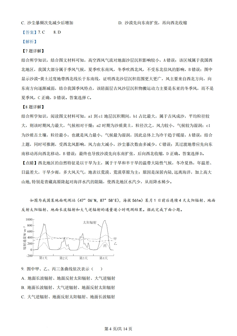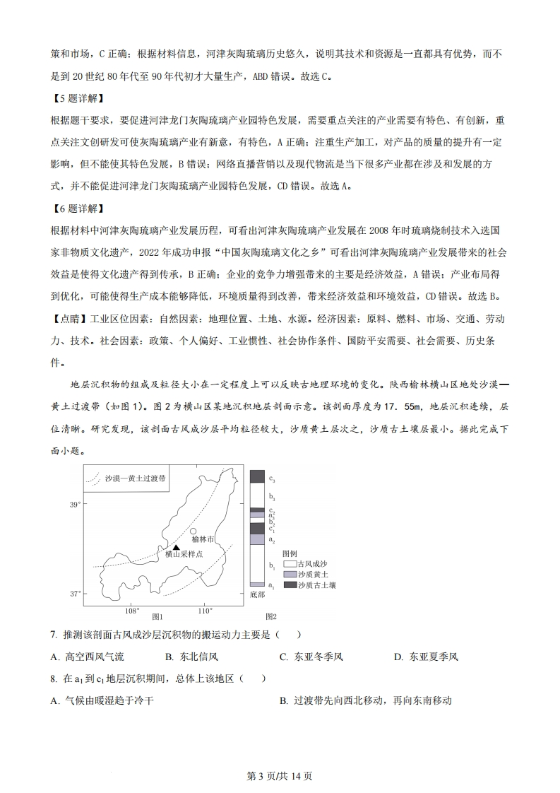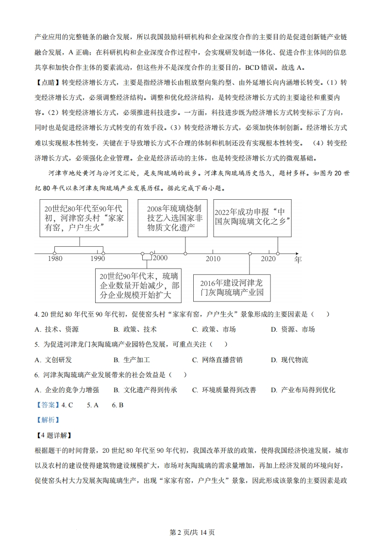 安徽省2024年普通高中学业水平选择性考试地理本试卷满分100分,考试时间75分钟。一、选择题:本题共16小题,每小题3分,共48分。在每小题给出的四个选项中,只有一项是符合题目要求的。中国科学院某研究所经过多年持续攻关,研制出大型低温制冷装备,可用于氢气、氮气液化,大幅减小气体体积。不同于以往“先实验室突破、再中试、再产业化”的模式,研究所在该装备研制过程中联合社会资本共同创立科技公司,创造性地探索出“边研究、边应用、边转化”的发展模式。据此完成下面小题。1.利用大型低温制冷装备将氢气液化,可以()A.确保能源安全B.保证运输过程零碳排放C.取代其他能源D.方便大规模储存与运输2.与以往模式相比,该发展模式的突出优势是()A.提高创新研发水平B.降低企业经营风险C.缩短成果转化周期D.节约科学研究经费3.我国鼓励科研机构和企业深度合作的主要目的是()A.促进创新链产业链融合发展B.加快实现研发制造一体化C.促进合作主体间的信息共享D.加快合作主体的要素流动【答案】1.D2.C3.A【解析】【1题详解】氢气密度远小于空气,在常温常压下运输,体积非常庞大。根据材料可知,利用大型低温制冷装备将氢气液化,可以减小氢气体积,方便大规模储存与运输,但并不能确保能源安全,A错误、D正确:运输过程零碳排放取决于交通运输方式,与氢气液化无关,B错误:氢气液化并不能取代其他能源,C错误。故选D.【2题详解】“边研究、边应用、边转化”的发展模式下,产出科研成果之日,就是产品下线之时,与以往模式相比,可以缩短成果转化周期,C正确:创新研发水平取决于科学技术水平,与发展模式关系不大,A错误:从材料中并不能看出该发展模式可以降低企业经营风险和科学研究经费,BD错误。故选C。【3题详解】科研机构长于技术开发,企业长于工程转化,两者优势互补,可以推动我国形成从技术研发、工程示范到第1页供14页产业应用的完整链条的融合发展,所以我国鼓励科研机构和企业深度合作的主要目的是促进创新链产业链融合发展,A正确:在科研机构和企业深度合作过程中,会实现研发制造一体化、促进合作主体间的信息共享和加快合作主体的要素流动,但这些并不是深度合作的主要目的,BCD错误。故选A。【点睛】转变经济增长方式,主要是指经济增长由粗放型向集约型、由外延增长向内涵增长转变。(1)转变经济增长方式,必须调整经济结构。调整和优化经济结构,是转变经济增长方式的主要途径和重要内容。(2)转变经济增长方式,必须推进科技进步。一方面,科技进步既为经济增长方式转变标示了方向,同时也是促进经济增长方式转变的有效手段。(3)转变经济增长方式,必须加快体制创新。经济增长方式难以实现根本性转变,关键在于导致增长方式不合理的体制和机制还没有实现根本性转变。(4)转变经济增长方式,必须强化企业管理。企业是经济活动的主体,也是转变经济增长方式的微观基础。河津市地处黄河与汾河交汇处,是灰陶琉璃的故乡。河津灰陶琉璃历史悠久,题材多样。如图为0世纪80年代以来河津灰陶琉璃产业发展历程。据此完成下面小题。20世纪80年代至90年代2008年琉璃烧制2022年成功申报“中初,河津窑头村“家家技艺入选国家非国灰陶琉璃文化之乡有窑,户户生火”物质文化遗产19801990J200020102020年20世纪90年代末,琉璃企业数量开始减少,部2016年建设河津龙分企业规模开始扩大门灰陶琉璃产业园4.20世纪80年代至90年代初,促使窑头村“家家有窑,户户生火”景象形成的主要因素是()A.技术、资源B.政策、技术C.政策、市场D.资源、市场5.为促进河津龙门灰陶琉璃产业园特色发展,可重点关注()A.文创研发B.生产加工C.网络直播营销D.现代物流6.河津灰陶琉璃产业发展带来的社会效益是()A.企业的竞争力增强B.文化遗产得到传承C.环境质量得到改善D.产业布局得到优化【答案】4.C5.A6.B【解析】【4题详解】根据题干的时间背景,20世纪80年代至90年代初,我国改革开放的政策,使得我国经济快速发展,城市以及农村的建设使得建筑物建设规模扩大,市场对灰陶琉璃的需求量增加,再加上经济发展的环境向好,促使窑头村大力发展灰陶琉璃生产,出现“家家有窑,户户生火”景象,因此形成该景象的主要因素是政第2页供14页