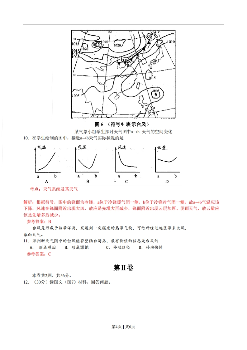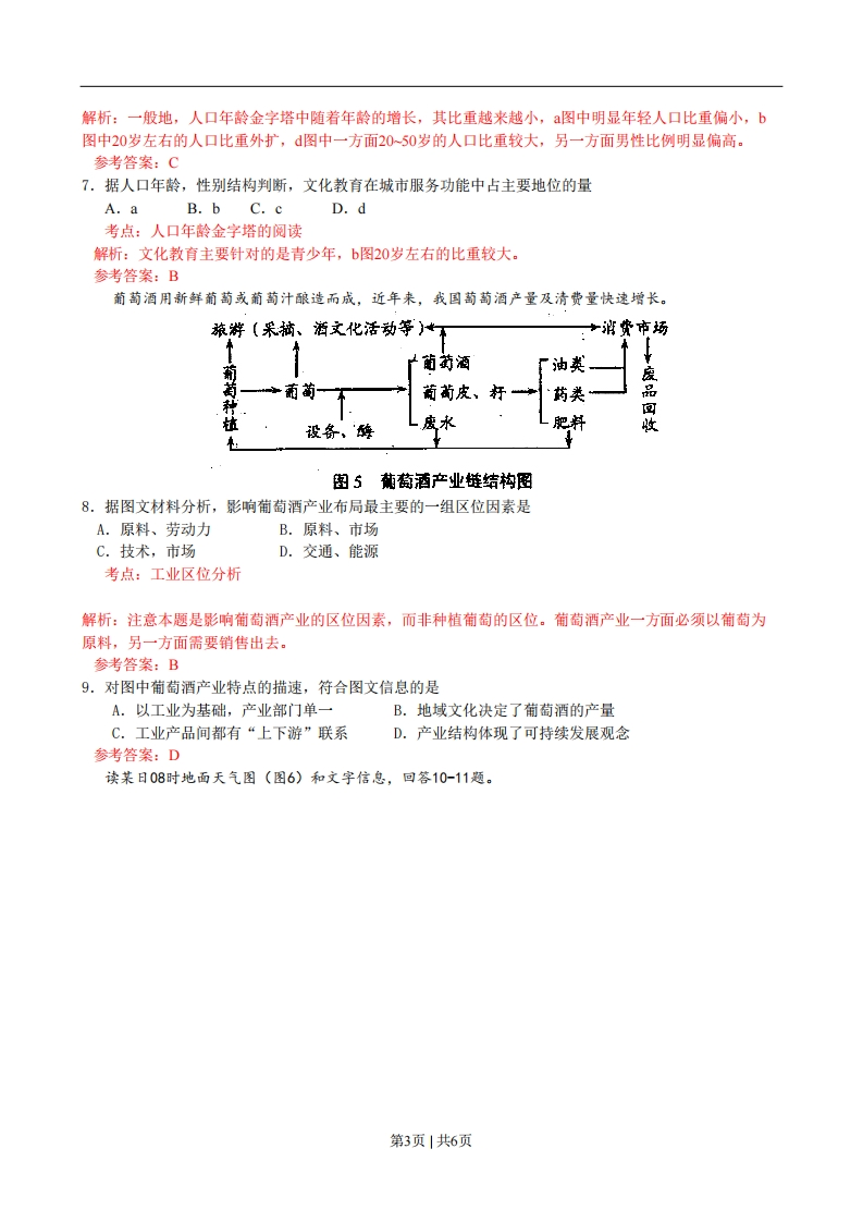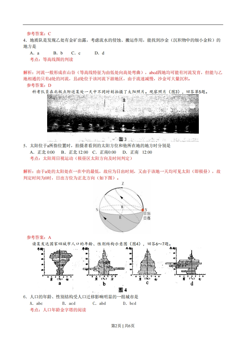 2009年高考文综(天津卷)地理部分解析地理试巷分为第1卷(选择题)和第Ⅱ卷(非选择题)两部分,第1卷至4页,第Ⅱ卷5至6页.共100分。第I卷注意事项:1.每题选出答案后,用铅笔将答题卡上对应题目的答案标号涂黑。如需改动,用橡皮擦干净后,再选涂其它他答案标号。2.本卷井11题,每题4分,共44分。在每题列山的四个选项中,只有一项是最符台题目要求的。读某外流湖自然消亡过程示意图(图1),,回答1一2题图11.该湖泊自然消亡的原因,据图可以确定的是A.地壳上升B.水源减少C.气候变干D.物质沉积考点:湖泊消亡的原因解析:从图中明显可以看到,湖床在不断上升。参考答案:D2.湖泊消亡引起了湖区自然景观的变化,这反映了自然环境的A.整体性B.差异性C.稳定性D.脆弱性考点:地理环境的整体性解析:某一要素的变化引起其它地理环境要素的改变。参考答案:A读我国北方某区域等高线地形图(图2),回答3-4题。图23.甲成为图中区域规模最大的村落和集市,最主要的条件是A.地处河流上游,水质良好B.周围地貌多样,风景优美C.地形平坦开阔,交通方便D.背靠丘陵缓坡,滑坡很少考点:聚落的区位分析解析:从等高线图中可以看出,甲地地形平坦开阔。第1页|共6页参考答案:C4.地质队是发现乙处有金矿出露,考虑流水的侵蚀、搬运作用,能找到沙金(沉积物中的细小金粒)的地方是A.aB.b C.cD.d考点:等高线图的判读解析:河流一般形成在山谷(等高线特征为由低处向高处弯曲),bcd四地均可能有河流发育,但能与乙地相通的只有d处的河流,且d处位于该河流下游地区,由于流速减慢,沙金可大量沉积。参考答案:D科考队员在北极点附近某处一天中不同时刻拍摄了太阳照片。观察照片(图3),回答第5题。5.太阳位于所指位置时,拍摄者看到的太阳方位和他所在地的地方时分别是A.正北000B.正北12:00C.正南0:00D.正南12:00考点:太阳周日视运动(极昼区太阳方向及时间判定)解析:由于处的太阳处在一在中的最低,故应为日出时刻,又由于该地一天均可见太阳(即极昼),故判定时间为0时,日出方位为正北方向(如下图)。出日落参考答案:A读某发达国家四城市人口的年龄、性别结枸示意图(图4),回答6~7题。年岭1平的年药年龄b图46.人口的年龄、性别结构受人口迁移影响明显的一组城市是A.abcB.acdC.abdD.bed考点:人口年龄金字塔的阅读第2页|共6页