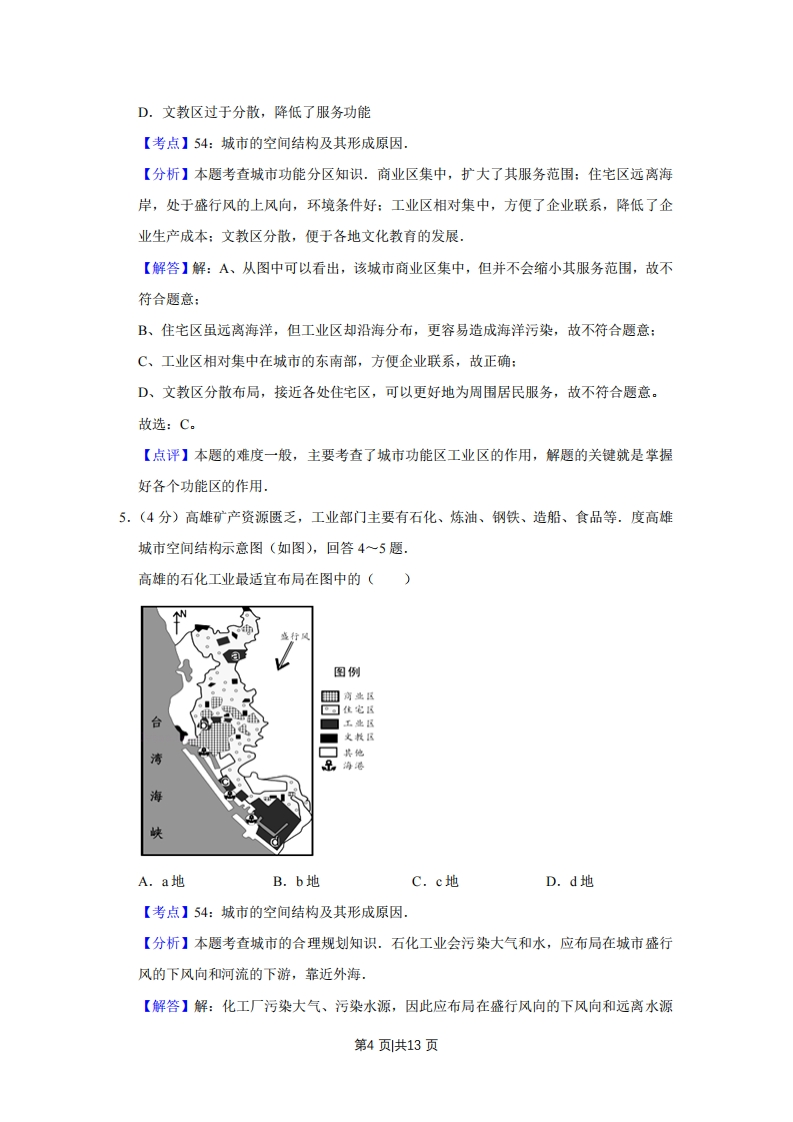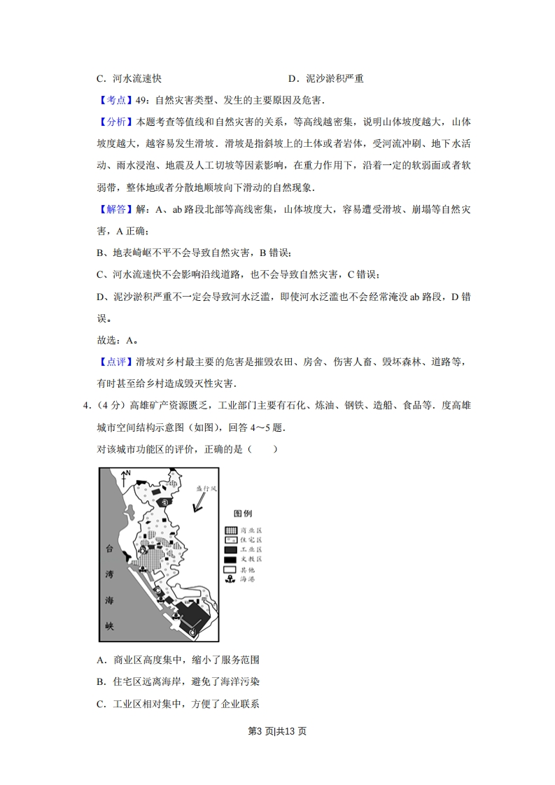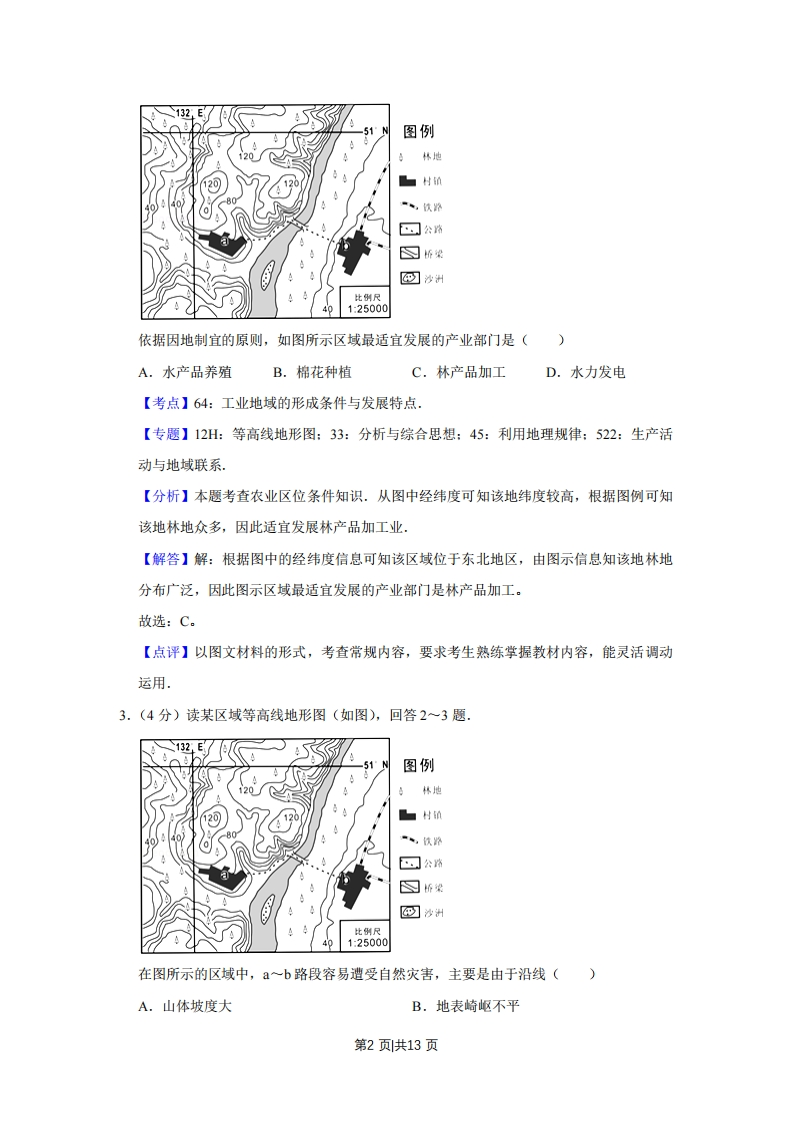 2012年天津市高考地理试卷解析版◆考答案与试题解析一、选择题(共有11小题,每小题4分,满44分)1.(4分)读城市水循环示意图(如图),回答:在城镇建设中,提倡用透水材料铺设“可呼吸地面”代替不透水的硬质地面.采用“可呼吸地面”之后,图中四个环节的变化符合实际的是(A.a增加B.b增加C.c减少D.d减少【考点】2E:水循环的过程和主要环节.【分析】城镇建设中铺设“可呼吸地面”代替不透水的硬质地面,增加了地表水的下渗,从而导致地表径流减少,地下径流增多,同时也使城市的蒸发量增加【解答】解:A、铺设“可呼吸地面”代替不透水的硬质地面,导致地表径流减少,即减少,故不符合题意。B、城镇建设中铺设“可呼吸地面”代替不透水的硬质地面,增加了地表水的下渗,即b增加,故正确。C、城镇建设中铺设“可呼吸地面”代替不透水的硬质地面,增加了地表水的下渗,从而导致地表径流减少,地下径流增多,即c增加,故不符合题意。D、城镇建设中铺设“可呼吸地面”代替不透水的硬质地面,使城市的蒸发量增加,故不符合题意。故选:B。【点评】在图中能分析各个示意箭头所代表的含义,理解材料所阐述的含义,养成分析材料的好习惯。2.(4分)读某区域等高线地形图(如图),回答2~3题.第1页共13页13251图例林地司公路图桥梁】沙洲比酬民401:25000依据因地制宜的原则,如图所示区域最适宜发展的产业部门是(A.水产品养殖B.棉花种植C.林产品加工D.水力发电【考点】64:工业地域的形成条件与发展特点,【专题】12H:等高线地形图:33:分析与综合思想:45:利用地理规律:522:生产活动与地域联系【分析】本题考查农业区位条件知识.从图中经纬度可知该地纬度较高,根据图例可知该地林地众多,因此适宜发展林产品加工业【解答】解:根据图中的经纬度信息可知该区域位于东北地区,由图示信息知该地林地分布广泛,因此图示区域最适宜发展的产业部门是林产品加工。故选:C。【点评】以图文材料的形式,考查常规内容,要求考生熟练掌握教材内容,能灵活调动运用,3.(4分)读某区域等高线地形图(如图),回答2~3题.131图例林地公路习桥梁习沙洲比酬尺401:25000在图所示的区域中,a~b路段容易遭受自然灾害,主要是由于沿线()A.山体坡度大B.地表崎岖不平第2页共13页