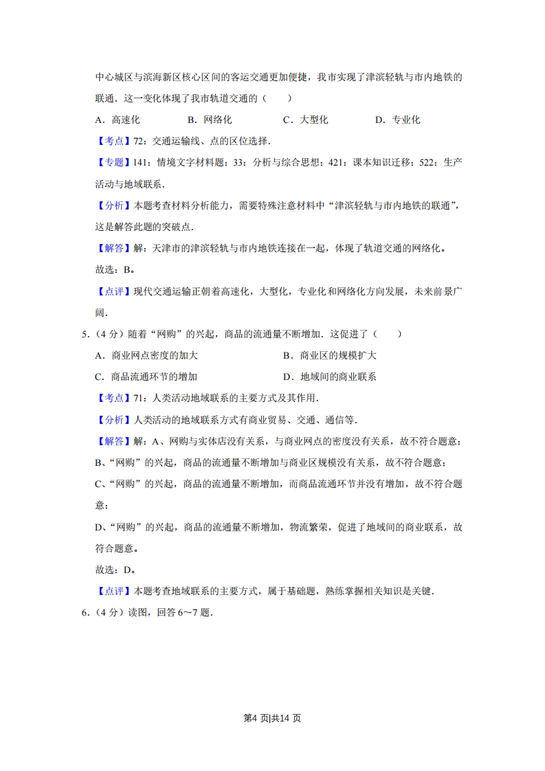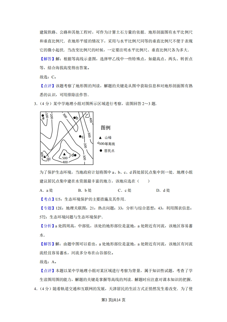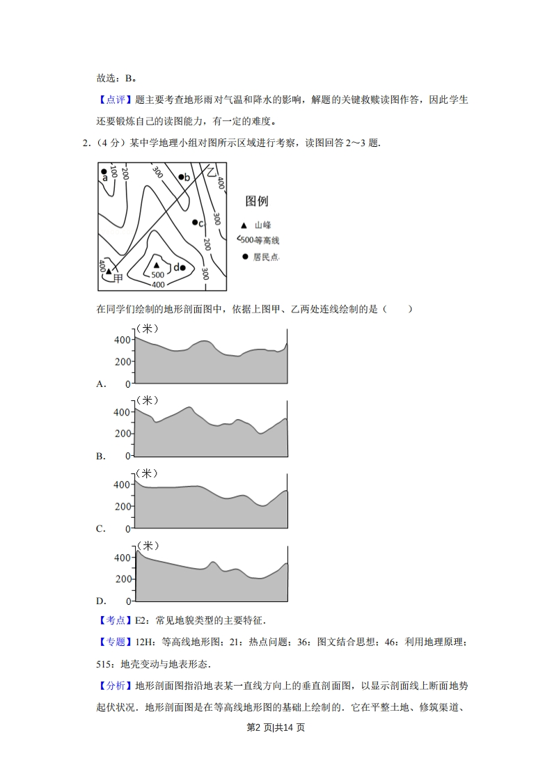 2013年天津省高考地理试卷解析版事考答案与试题佩折一、选择题(共7小题,每小题4分,满分12分)1.(4分)读图1,回答:列曲线图,正确反映图1气流运动过程中气温、降水可能性变化趋势的是图2中的()山地图1气狸…·降水可能性地加图2A.AB.BC.CD.D【考点】2B:影响气候的主要因素.【分析】由图示可以看出这时是地形雨。,甲为迎风坡,降水多,随着海拔增高气温下降:乙为背风坡,随着海拔下降降水减少气温增加。【解答】解:A、根据上面的分析:甲是山地迎风坡降水多,气温会随海拔的升高而降低,故不符合题意:B、根据上面的分析:甲是山地迎风坡降水多,气温会随海拔的升高而降低,乙地是背风坡,降水少,但是气温随海拔的降低而升高,故正确:C、根据上面的分析:甲是山地迎风坡降水多,气温会随海拔的升高而降低,乙地是背风坡,降水少,但是气温随海拔的降低而升高,故不符合题意:D、根据上面的分析:甲是山地迎风坡降水多,气温会随海拔的升高而降低,乙地是背风坡,降水少,但是气温随海拔的降低而升高,故不符合题意。第1页共14页故选:B。【点评】题主要考查地形雨对气温和降水的影响,解题的关键救赎读图作答,因此学生还要锻炼自己的读图能力,有一定的难度。2.(4分)某中学地理小组对图所示区域进行考察,读图回答2~3题.300b图例●c▲山峰500等高线●居民点▲do(500400在同学们绘制的地形剖面图中,依据上图甲、乙两处连线绘制的是()(米)400200A07米)》400200B.(米)4002000(米)400200D0【考点】E2:常见地貌类型的主要特征.【专题】12H:等高线地形图:21:热点问题:36:图文结合思想:46:利用地理原理:515:地壳变动与地表形态,【分析】地形剖面图指沿地表某一直线方向上的垂直剖面图,以显示剖面线上断面地势起伏状况.地形剖面图是在等高线地形图的基础上绘制的.它在平整土地、修筑渠道、第2页共14页