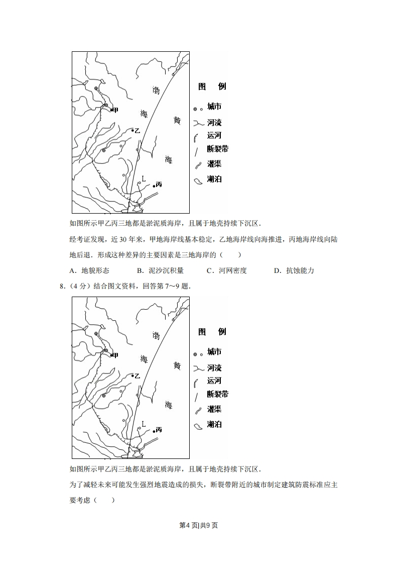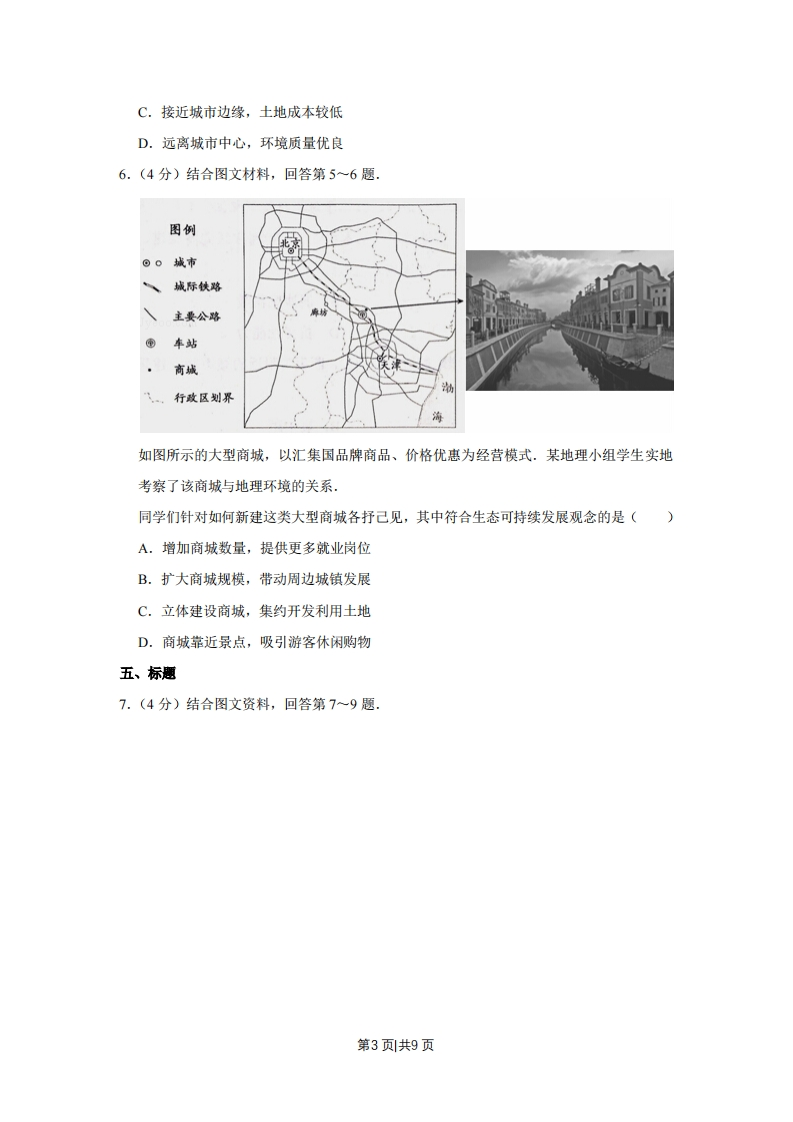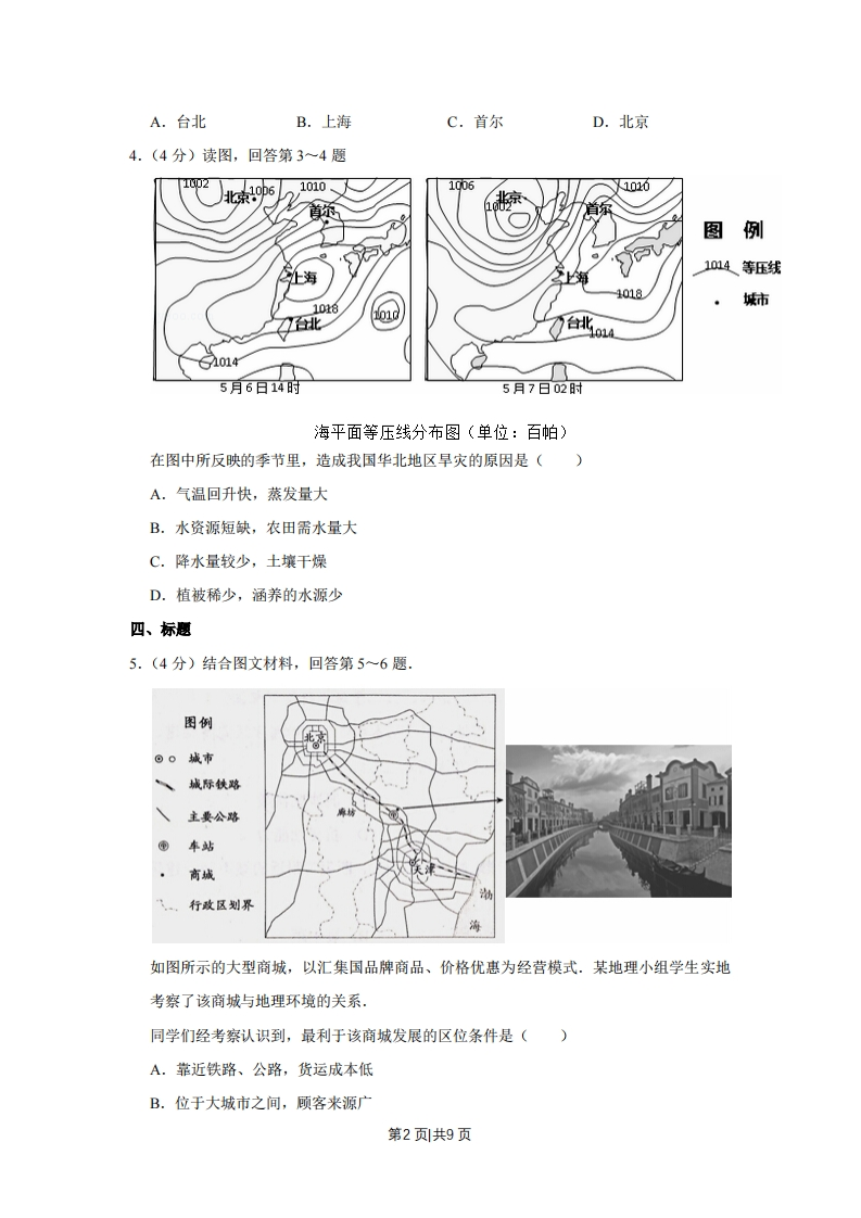 2014年天津市高考地理试卷一、选择题1.(4分)结合图文材料,回答第1-2题海拔高度(m)010km200015001000500东南西北北京西山地形剖面示意图在图中所示甲乙丙丁四地,年降水量由多到少的正确排序是(A.甲乙丙丁B.乙甲丙丁C.丙丁乙甲D.丁丙乙甲2.(4分)结合图文材料,回答第1-2题海拔高厚(m)010km再200015001000500东南西北北京西山地形制面示意图板栗属于喜光、喜暖的落叶阔叶树种,是北京西山地区重要的经济林木,在甲乙丙丁四地中,最适宜大面积栽培板栗的是()A.甲B.乙C.丙D.丁三、标题3.(4分)读图,回答第3~4题10210p6.101010061010图例1014等压线江海10181018城市01d北a号0145月6日14时5月7日02时海平面等压线分布图(单位:百帕)在图中所示的时段内,风向由东南变为东北的城市是()第1页共9页A.台北B.上海C.首尔D.北京4.(4分)读图,回答第3~4题10210p6101010061010北首尔图例1014等压线上海40181018城市0100145月6日14时5月7日02时海平面等压线分布图(单位:百帕)在图中所反映的季节里,造成我国华北地区旱灾的原因是()A.气温回升快,蒸发量大B.水资源短缺,农田需水量大C.降水量较少,土壤干燥D.植被稀少,涵养的水源少四、标题5.(4分)结合图文材料,回答第5~6题.图例⊙。城市城际铁路八主要公路车站商城八…行政区划界如图所示的大型商城,以汇集国品牌商品、价格优惠为经营模式.某地理小组学生实地考察了该商城与地理环境的关系,同学们经考察认识到,最利于该商城发展的区位条件是()A.靠近铁路、公路,货运成本低B.位于大城市之间,顾客来源广第2页共9页