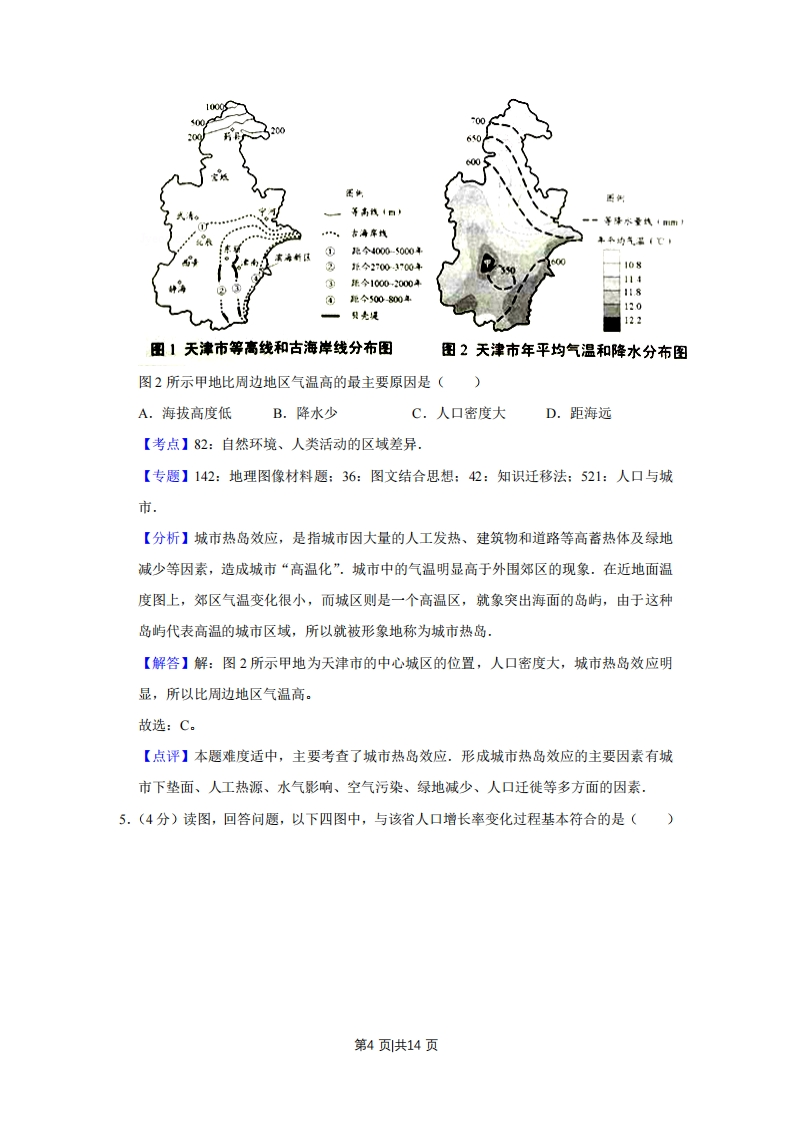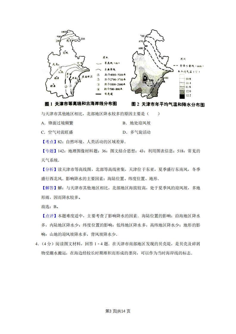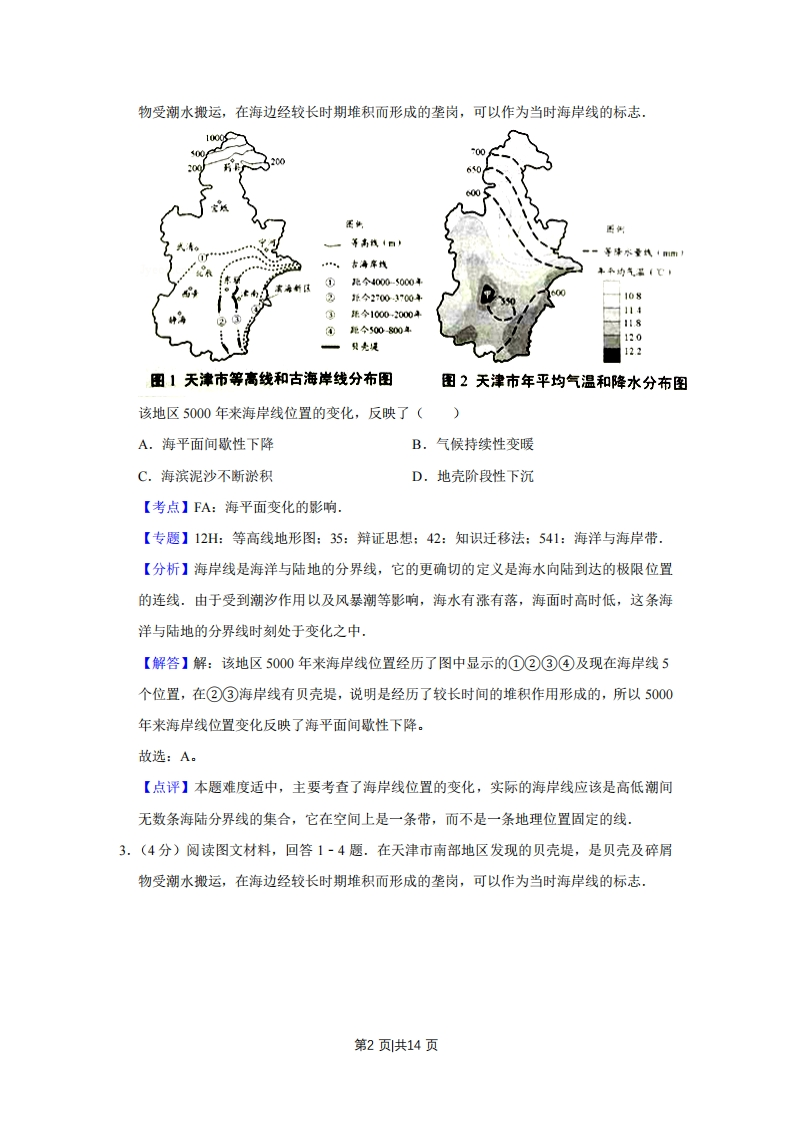2016年天津市高考地理试卷解析版事考答案与试题佩析一、本卷为选择题.在每个小题给出的四个选项中,只有一项是符合题目要求的1.(4分)阅读图文材料,回答1-4题.在天津市南部地区发现的贝壳堤,是贝壳及碎屑物受潮水搬运,在海边经较长时期堆积而形成的垄岗,可以作为当时海岸线的标志,10009活等新代口等停容童线专用m)右海席执年不功气君(℃是个4000-50004兼今270037004-11086今1000-2000414e个500-800.8120122田1天津市等高线和古海岸线分布图图2天津市年平均气温和降水分布图图1所示古海岸线分布地区地势的总体变化趋势是()A.由东北向西南倾斜B.由西向东倾斜C.由西北向东南倾斜D.由北向南倾斜【考点】FA:海平面变化的影响【专题】12H:等高线地形图:35:辩证思想:44:利用地理事实:541:海洋与海岸带【分析】海洋和陆地是地球表面的两个基本单元,海岸线即是陆地与海洋的分界线,一般指海潮时高潮所到达的界线.地质历史时期的海岸线,称古海岸线.根据图中古海岸线分布进行判断。【解答】解:根据图中4条古海岸线的分布,①②③④大致从西北向东南方向变化,④离现在海岸线最近,说明地势最低,所以古海岸线分布地区的地势总体是由西北向东南倾斜。故选:C。【点评】本题难度适中,主要考查了古海岸线分布地区地势,海岸线由于受到潮汐作用以及风暴潮等影响,海水有涨有落,海面时高时低,这条海洋与陆地的分界线时刻处于变化之中.2.(4分)阅读图文材料,回答1-4题.在天津市南部地区发现的贝壳堤,是贝壳及碎屑第1页共14页物受潮水搬运,在海边经较长时期堆积而形成的垄岗,可以作为当时海岸线的标志.10009图物图等高线口=等停容童线卡阳)表海席代车本场气(℃,是个4000-50004兼今270037004-1108集今1000-2000414北个500-8004.118120一见先见121田1天津市等高线和古海岸线分布图图2天津市年平均气温和降水分布图该地区5000年来海岸线位置的变化,反映了()A.海平面间歇性下降B.气候持续性变暖C.海滨泥沙不断淤积D.地壳阶段性下沉【考点】FA:海平面变化的影响,【专题】12H:等高线地形图:35:辩证思想:42:知识迁移法:541:海洋与海岸带.【分析】海岸线是海洋与陆地的分界线,它的更确切的定义是海水向陆到达的极限位置的连线.由于受到潮汐作用以及风暴潮等影响,海水有涨有落,海面时高时低,这条海洋与陆地的分界线时刻处于变化之中,【解答】解:该地区5000年来海岸线位置经历了图中显示的①②③④及现在海岸线5个位置,在②③海岸线有贝壳堤,说明是经历了较长时间的堆积作用形成的,所以5000年来海岸线位置变化反映了海平面间歇性下降。故选:A。【点评】本题难度适中,主要考查了海岸线位置的变化,实际的海岸线应该是高低潮间无数条海陆分界线的集合,它在空间上是一条带,而不是一条地理位置固定的线,3.(4分)阅读图文材料,回答1-4题.在天津市南部地区发现的贝壳堤,是贝壳及碎屑物受潮水搬运,在海边经较长时期堆积而形成的垄岗,可以作为当时海岸线的标志,第2页共14页