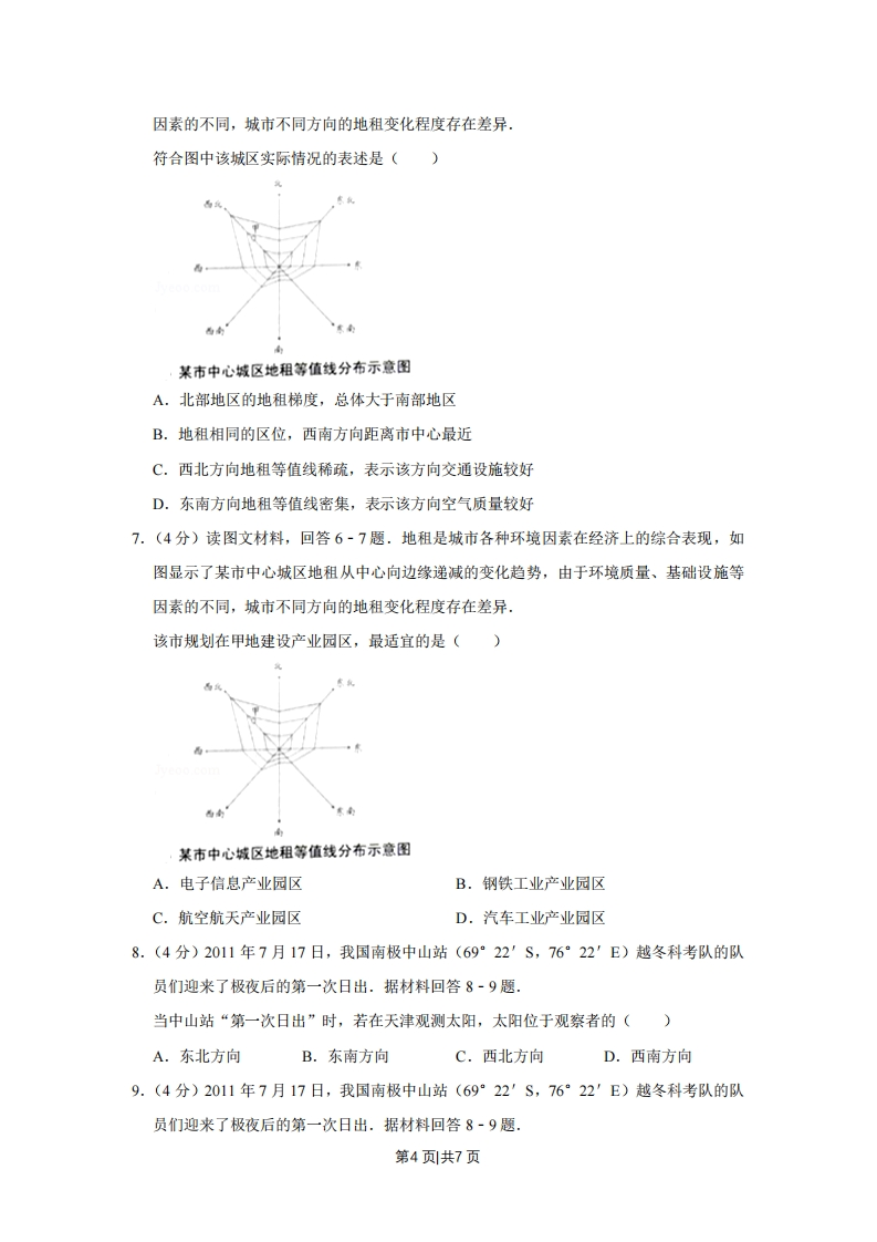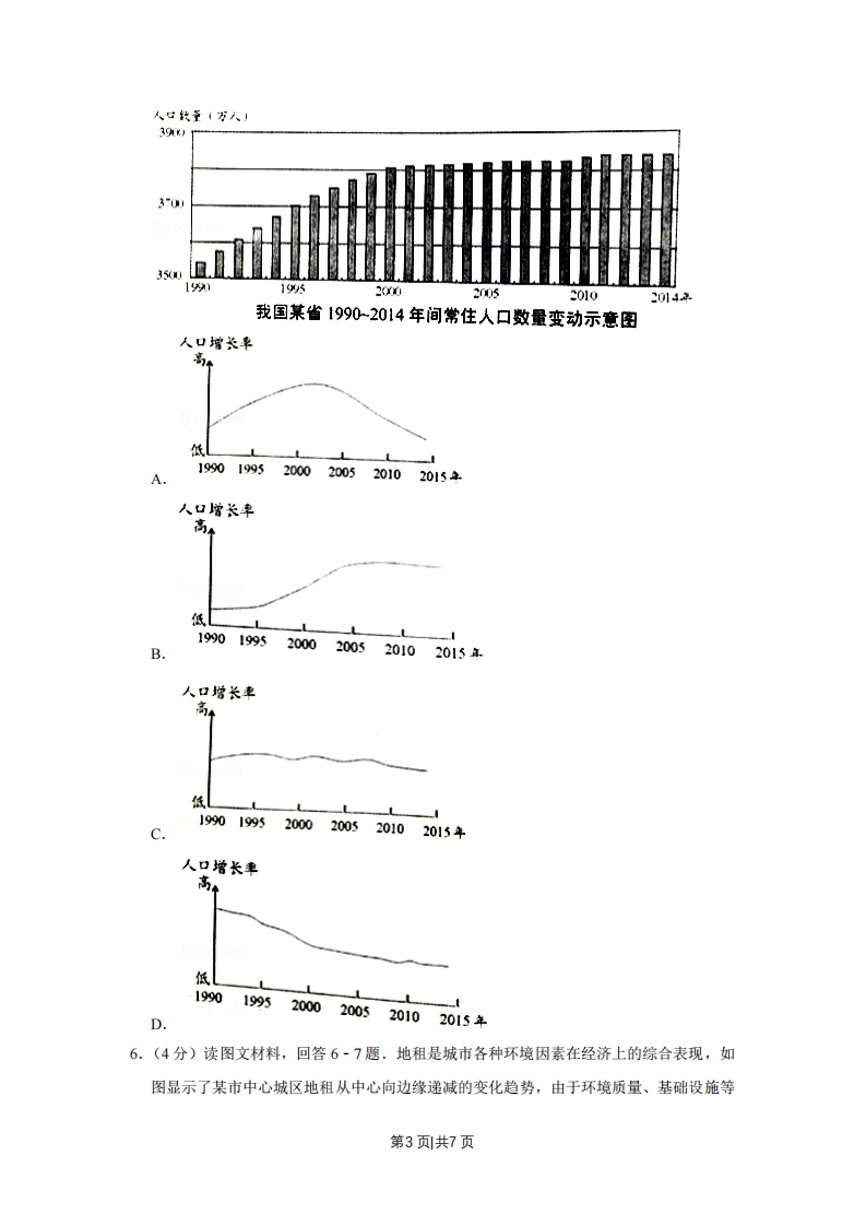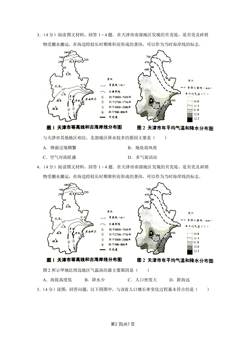 2016年天津市高考地理试卷一、本卷为选择题.在每个小题给出的四个选项中,只有一项是符合题目要求的。1.(4分)阅读图文材料,回答1-4题.在天津市南部地区发现的贝壳堤,是贝壳及碎屑物受潮水搬运,在海边经较长时期堆积而形成的垄岗,可以作为当时海岸线的标志。0无快图等高线4口==等条尽量线4mm车不功气君℃是个4000-50004希区兼今20037004-十108今1000-2000414④北个500-8004118120碧免提122田1天津市等高线和古海岸线分布图围2天津市年平均气温和降水分布图图1所示古海岸线分布地区地势的总体变化趋势是(A.由东北向西南倾斜B.由西向东倾斜C.由西北向东南倾斜D.由北向南倾斜2.(4分)阅读图文材料,回答1-4题.在天津市南部地区发现的贝壳堤,是贝壳及碎屑物受潮水搬运,在海边经较长时期堆积而形成的垄岗,可以作为当时海岸线的标志100000f活韩一等高件自-=等停尽量线4阳m】。卡海痒执车不动气需(℃北个4000-50004边兼今270037004108兼.今1000-20004114④轮个5008004118120县免堤122田1天津市等高线和古海岸线分布图图2天津市年平均气温和降水分布图该地区5000年来海岸线位置的变化,反映了(A.海平面间歇性下降B.气候持续性变暖C.海滨泥沙不断淤积D.地壳阶段性下沉第1页共7页3.(4分)阅读图文材料,回答1-4题.在天津市南部地区发现的贝壳堤,是贝壳及碎屑物受潮水搬运,在海边经较长时期堆积而形成的垄岗,可以作为当时海岸线的标志。100020右海席执车本动气需(℃北个4000-50004非今270037004-11082.今1000-20004140今50080018120县先堤121田1天津市等高线和古海岸线分布图图2天津市年平均气温和降水分布图与天津市其他地区相比,北部地区降水较多的原因主要是()A.锋面过境频繁B.地处迎风坡C.空气对流旺盛D.多气旋活动4.(4分)阅读图文材料,回答1-4题.在天津市南部地区发现的贝壳堤,是贝壳及碎屑物受潮水搬运,在海边经较长时期堆积而形成的垄岗,可以作为当时海岸线的标志。10009000震共图一等高代口=等停容童线阳)右海序代年本坊气君(℃,的区①花个4000-50004并今2700370041108兼今1000-2000414北个500-800418120一鬼先见122田1天津市等高线和古海岸线分布图图2天津市年平均气温和降水分布图图2所示甲地比周边地区气温高的最主要原因是(A.海拔高度低B.降水少C.人口密度大D.距海远5.(4分)读图,回答问题,以下四图中,与该省人口增长率变化过程基本符合的是()第2页共7页