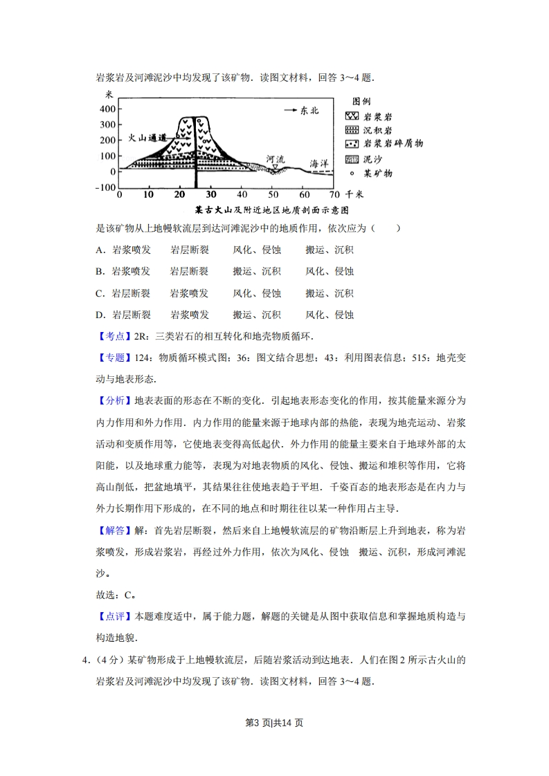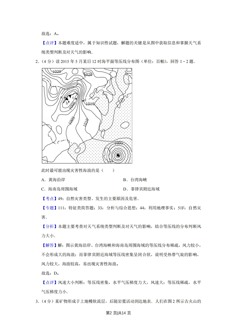 2015年天津市高考地理试卷解析版事考答案与试题佩折一、选择题1.(4分)读2015年5月某日12时海平面等压线分布图(单位:百帕),回答1-2题,1029020此时出现大风、降温、雨雪天气的地点是()A.aB.bC.cD.d【考点】29:锋面系统与天气:2A:气压系统与天气.【专题】125:等压线图:36:图文结合思想:45:利用地理规律:518:常见的天气系统【分析】冷锋的特点:①冷气团主动向暖气团移动.②冷锋用线条加(黑)三角表示,三角形标在暖气团一侧.③冷锋坡度大.④冷锋降水主要出现在锋线后及附近,雨区狭窄.⑤冷锋降水时间短,强度大.⑥冷锋过境时,常常出现阴天气旋的特点:①中心气压低于周围气压.②周围旋转向里符合,北半球为逆时针,南半球为顺时针.③中心气流上升,多形成阴雨天气.风速大小判断:等压线密集,水平气压梯度力大,风速大:等压线稀疏,水平气压梯度力小,风速小,气温变化判断:从高纬度吹向低纬度风,气温降低,从低纬度吹向高纬度的风,气温升高【解答】解:图示地位于冷锋后,且等压线密集,所以应为大风、降温、雨雪天气:而b地位于气旋中心,不会出现大风天气:c地和d地等压线密集,仅出现大风天气,没有上升气流,且为偏南风,不会出现降温、雨雪天气。第1页共14页故选:A。【点评】本题难度适中,属于知识性试题,解题的关键是从图中获取信息和掌握天气系统类型判断及对天气的影响2.(4分)读2015年5月某日12时海平面等压线分布图(单位:百帕),回答1-2题.1029020000此时最可能出现灾害性海浪的是(A.黄海沿岸B.台湾海峡C.海南岛周围海域D.菲律宾附近海域【考点】49:自然灾害类型、发生的主要原因及危害【专题】111:特征类简答题:33:分析与综合思想:44:利用地理事实:51F:自然灾害【分析】本题主要考查对天气系统类型判断及对天气的影响,结合等压线的分布判断风力大小【解答】解:图示黄海沿岸、台湾海峡和海南岛周围海域的等压线分布稀疏,风力较小,不会形成大的海浪:而菲律宾附近海域等压线密集呈闭合状,说明受热带气旋的影响,风力较大,海浪较高,易出现灾害性海浪。故选:D。【点评】风速大小判断:等压线密集,水平气压梯度力大,风速大:等压线稀疏,水平气压梯度力小3.(4分)某矿物形成于上地慢软流层,后随岩浆活动到达地表.人们在图2所示古火山的第2页共14页