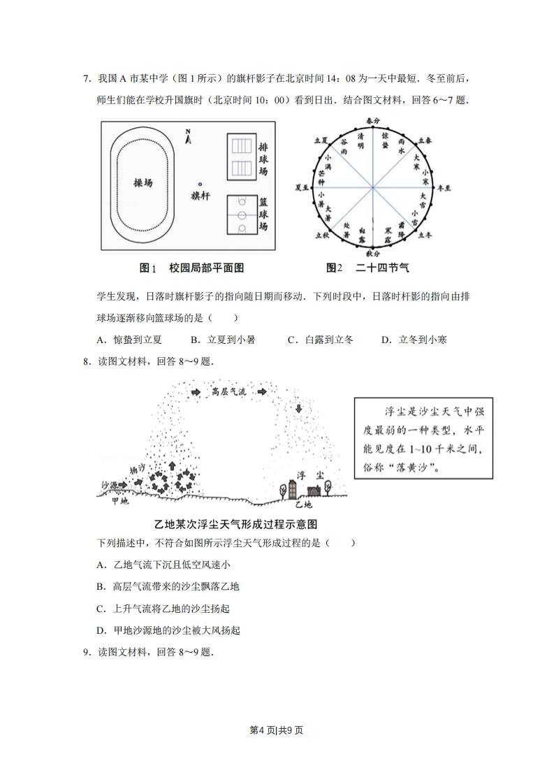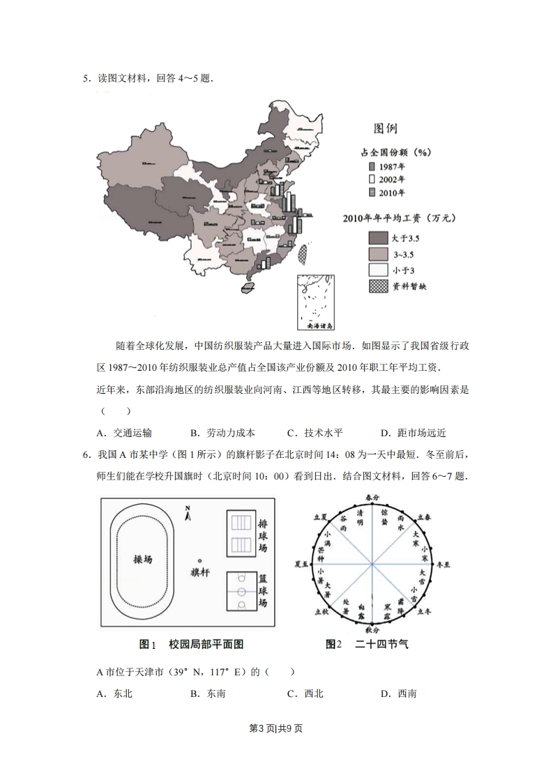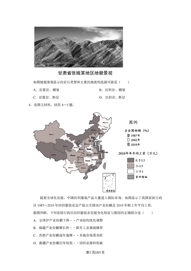 2017年天津市高考地理试卷一、选释题:本卷共11题,每题4分,共44分。在每题给出的四个选项中,只有一项是最符合题目要求的。1,天津既有优美的盘山自然景观,又有海河沿岸的历史遗迹.读图回答1~2题图例外口明代军事卫域能国。法村落图址环形通路一河流a.上盘奇松b.中盘怪石:直c.下盘飞瀑d.中秋挂月图1盘山景观图图2天津部分“沽”村落旧址示意图盘山从山顶至山脚分上、中、下三盘,夏季常出现“三盘暮雨”的现象.图1中受“三盘暮雨”影响最明显的自然景观是()A.aB.bC.cD.d2.天津既有优美的盘山自然景观,又有海河沿岸的历史遗迹.读图回答1~2题图例口明代军事立域范国。法村落图址环形道路a.上食奇松b.中金怪石一河流大直c.下盘飞瀑d.中款挂月图1盘山景观图图2天津部分“沽”村落旧址示意图目前,天津部分称“沽”的村落(图2所示)己难寻觅,主要原因是()A.城市的扩展B.河流的改道C.人口的迁移D.文化的融合3.(4分)读图,回答第3题.第1页共9页甘肃省张掖某地区地貌景观如图地貌景观显示的岩石类型和主要的地质构造最可能是()A.岩浆岩、褶皱B.沉积岩、褶皱C.岩浆岩、断层D.沉积岩、断层4.读图文材料,回答4~5题.图例占全国份颜(%)☐1987年02002年目2010年2010年年平均工资(万元)大于3.53-3.5小于3贵料暂缺南海诸岛随着全球化发展,中国纺织服装产品大量进入国际市场.如图显示了我国省级行政区1987~2010年纺织服装业总产值占全国该产业份额及2010年职工年平均工资.据图判断,下列省级行政区纺织服装业发展变化特征与原因的正确组合是()A.京津沪产业份额下降·-产业结构优化调整B.福建产业份额增长快·-原有工业基础雄厚C.苏浙产业份额逐年递增-·本地市场需求旺D.新疆产业份额历年较低·-纺织业原料短缺第2页共9页