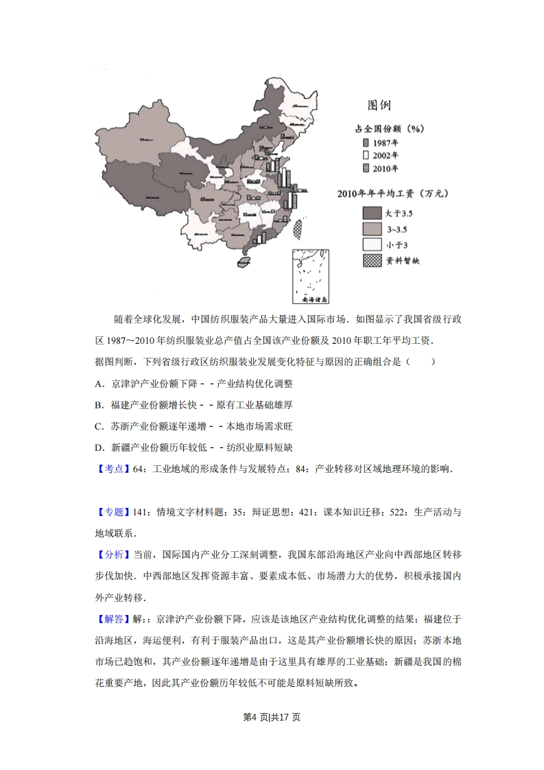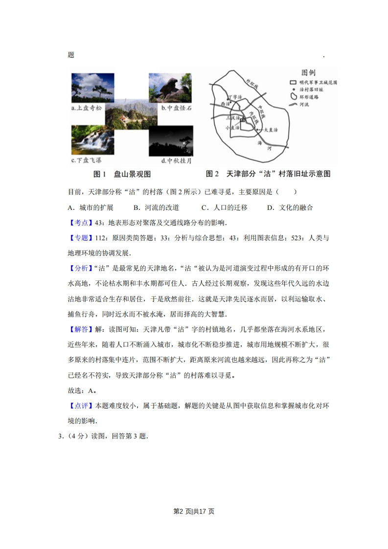 2017年天津市高考地理试卷解析版事考答案与试题佩析一、选择题:本卷共11题,每题4分,共44分。在每题给出的四个选项中,只有一项是最符合题目要求的。1·天津既有优美的盘山自然景观,又有海河沿岸的历史遗迹.读图回答1~2题图例口明代军事卫域范国。浩村落图址环形道路a.上食奇松b.中盘怪石一河流c.下盘飞瀑d.中秋挂月图1盘山景观图图2天津部分“沽”村落旧址示意图盘山从山顶至山脚分上、中、下三盘,夏季常出现“三盘暮雨”的现象.图1中受“三盘暮雨”影响最明显的自然景观是()A.aB.bC.cD.d【考点】82:自然环境、人类活动的区域差异.【专题】142:地理图像材料题:36:图文结合思想:43:利用图表信息:531:区域地理环境与人类活动【分析】据图片可知:盘山的上盘以松取胜,中盘以石取胜,下盘以水取胜,【解答】解:根据材料盘山从山顶至山脚分上、中、下三盘,夏季常出现“三盘暮雨”。在黄昏暮霭、烟雾朦胧之时皆被云气笼罩,身处山中可见“似晴非睛、不雨是雨”之象。此时“山中云气郁勃弥漫,浩浩如雪海峰峦,水汽较多,容易形成降水,雨水下泄,在下盘地区汇聚成河,形成下盘飞瀑景观。故选:C。【点评】本题主要考查学生的读图分析能力,关键是会运用整体性的原理分析“三盘暮雨”2,天津既有优美的盘山自然景观,又有海河沿岸的历史遗迹.读图回答1~2第1页共17页题图例口明代军事立域范国。法村落图址环彩道菇a.上盘奇松b.中食怪石一河流c.下盘飞瀑d.中秋挂月图1盘山景观图图2天津部分“沽”村落旧址示意图目前,天津部分称“沽”的村落(图2所示)己难寻觅,主要原因是()A.城市的扩展B.河流的改道C.人口的迁移D.文化的融合【考点】43:地表形态对聚落及交通线路分布的影响,【专题】112:原因类简答题:33:分析与综合思想:43:利用图表信息:523:人类与地理环境的协调发展【分析】“沽”是最常见的天津地名,“沽“被认为是河道演变过程中形成的有开口的环水高地,不论枯水期和丰水期都可住人,古人经过长期观察,发现这些年代久远的水边沽地非常适合生存和居住,于是欣然前往.这就是天津先民逐水而居,以利运输取水、捕鱼行舟,同时近水而不被水淹,居而择高的大智慧,【解答】解:读图可知:天津凡带“沽”字的村镇地名,几乎都坐落在海河水系地区,近些年来,随着人口不断涌入城市,城市化不断稳步推进,城市用地规模不断扩大,很多原来的村落集中连片,范围不断扩大,距离原来河流也越来越远,因此再称之为“沽”己经名不符实,导致天津部分称“沽”的村落难以寻觅。故选:A。【点评】本题难度较小,属于基础题,解题的关键是从图中获取信息和掌握城市化对环境的影响,3.(4分)读图,回答第3题.第2页共17页