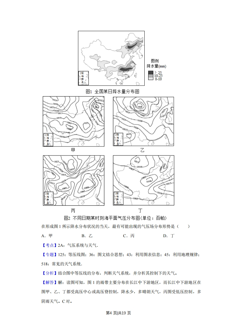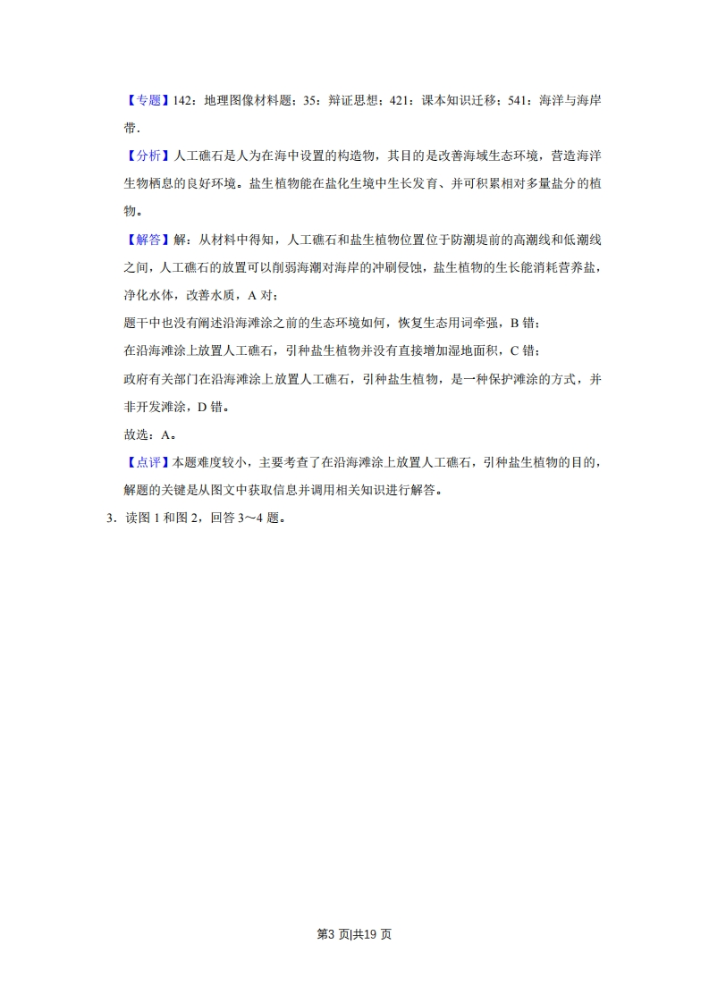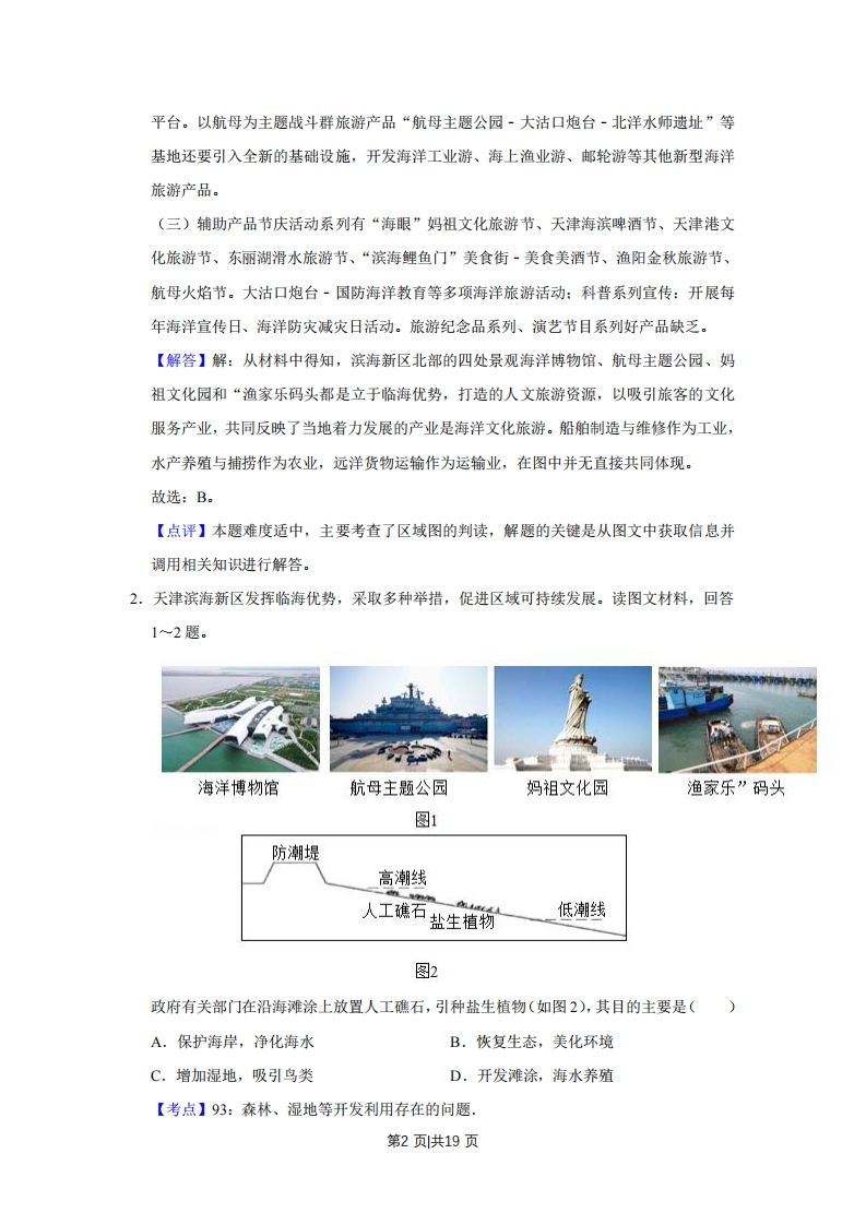 2019年天津市高考地理试卷解析版套考答案与试题解析一、选释题(本卷共有11小题,每题4分,共44分。在每题给出的四个选项中,只有一项是最符合题目要求的。)1.天津滨海新区发挥临海优势,采取多种举措,促进区域可持续发展。读图文材料,回答1~2题。海洋博物馆航母主题公园妈祖文化园渔家乐”码头图1防潮堤高潮线人工礁石盐生植物低潮线图2集中分布在滨海新区北部的四处景观(如图1),共同反映了当地着力发展的产业是(A.船舶制造与维修B.海洋文化旅游C.水产养殖与捕捞D.远洋货物运输【考点】F9:海岸带开发利用的主要方式【专题】142:地理图像材料题:33:分析与综合思想:45:利用地理规律:541:海洋与海岸带【分析】天津海洋文化旅游产品开发分析:(一)基础设施建设中国北方的地标性海洋旅游景区~航母战斗群旅游产品~海洋主题公园、鲤鱼门海鲜美食街等,天津古贝壳堤博物馆、天津港博览馆等都作为重要的文化教育基地,对于弘扬天津当地的海港文化具有重要意义。其他重要景区还有极地海洋馆、东疆湾沙滩、中心渔港等。(二)核心产品国家海洋博物馆是中国第一座大规模的海洋专题博物馆,也是我国第一个公益性的博物馆,建成后将会成为一个可以进行展示的爱国主义基地和海洋科技交流第1页共19页平台。以航母为主题战斗群旅游产品“航母主题公园-大沽口炮台-北洋水师遗址”等基地还要引入全新的基础设施,开发海洋工业游、海上渔业游、邮轮游等其他新型海洋旅游产品。(三)辅助产品节庆活动系列有“海眼”妈祖文化旅游节、天津海滨啤酒节、天津港文化旅游节、东丽湖滑水旅游节、“滨海鲤鱼门”美食街-美食美酒节、渔阳金秋旅游节、航母火焰节。大沾口炮台·国防海洋教育等多项海洋旅游活动:科普系列宣传:开展每年海洋宣传日、海洋防灾减灾日活动。旅游纪念品系列、演艺节目系列好产品缺乏。【解答】解:从材料中得知,滨海新区北部的四处景观海洋博物馆、航母主题公园、妈祖文化园和“渔家乐码头都是立于临海优势,打造的人文旅游资源,以吸引旅客的文化服务产业,共同反映了当地着力发展的产业是海洋文化旅游。船舶制造与维修作为工业,水产养殖与捕捞作为农业,远洋货物运输作为运输业,在图中并无直接共同体现。故选:B。【点评】本题难度适中,主要考查了区域图的判读,解题的关键是从图文中获取信息并调用相关知识进行解答。2.天津滨海新区发挥临海优势,采取多种举措,促进区域可持续发展。读图文材料,回答1~2题。海洋博物馆航母主题公园妈祖文化园渔家乐”码头图1防潮堤高潮线n人工礁石盐生植物低潮线图2政府有关部门在沿海滩涂上放置人工礁石,引种盐生植物(如图2),其目的主要是()A.保护海岸,净化海水B.恢复生态,美化环境C.增加湿地,吸引鸟类D.开发滩涂,海水养殖【考点】93:森林、湿地等开发利用存在的问题.第2页共19页