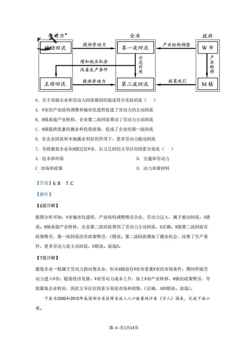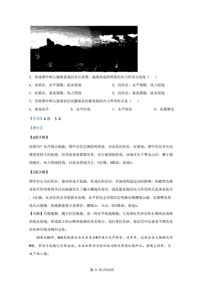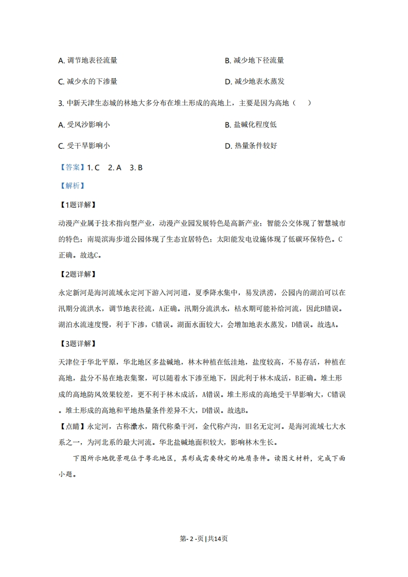 2020年天津市普通高中学业水平等级性考试地理考试说明:1.本试卷分为第I卷(选择题)和第Ⅱ卷(排选择题)两部分,共100分,考试用时60分钟。第I卷1至5页,第Ⅱ卷6至8页。2.答卷前,考生务必将自已的姓名、考生号、考场号和座位号填写在答题卡上,并在规定位置粘贴考试用条形码。答卷时,考生务必将答案涂写在答题卡上,答在试卷上的无效。考试结束后,将本试卷和答题卡一并交回。祝各位考生考试顺利!第I卷注意事项:1.每题选出答案后,用铅笔将答题卡上对应题目的答案标号标涂黑。如需改动,用橡皮擦干净后,再选涂其他答案标号。2.本卷共15题,每题3分,共45分,在每题给出的四个选项中,只有一项是最符合题目要求的。中新天津生态城是在盐碱荒滩上建设起来的一座新城,下图为四幅能反映生态城发展特色的景观照片,读图文材料,完成下面小题。动漫产业园区智能公交站南堤滨海步道公园太阳能发电设施1.在中新天津生态城发展特色的描述中,与图1中的景观依次对应的是()A.智慧城市、低碳环保、高新产业、生态宜居B.生态宜居、高新产业、低碳环保、智慧城市C.高新产业、智慧城市、生态宜居、低碳环保D.低碳环保、生态宜居、智慧城市、高新产业2.南堤滨海步道公园紧邻永定新河,园内湖泊对当地水循环的影响是()第-1-页1共14页A.调节地表径流量B.减少地下径流量C.减少水的下渗量D.减少地表水蒸发3.中新天津生态城的林地大多分布在堆土形成的高地上,主要是因为高地()A.受风沙影响小B.盐碱化程度低C.受干旱影响小D.热量条件较好【答案】1.C2.A3.B【解析】【1题详解】动漫产业属于技术指向型产业,动漫产业园发展特色是高新产业:智能公交体现了智慧城市的特色:南堤滨海步道公园体现了生态宜居特色:太阳能发电设施体现了低碳环保特色。C正确。故选C。【2题详解】永定新河是海河流域永定河下游入河河道,夏季降水集中,易发洪涝,公园内的湖泊可以在汛期分流洪水,调节地表径流,A正确。汛期分流洪水,枯水期可能补给河流,因此B错误。湖泊水流速度慢,利于下渗,C错误。湖面水面较大,会增加地表水蒸发,D错误。故选A。【3题详解】天津位于华北平原,华北地区多盐碱地,林木种植在低洼地,盐度较高,不易存活,种植在高地,盐分不易在地表集聚,可以随着水下渗至地下,因此利于林木成活,B正确。堆土形成的高地防风效果较差,更不利于林木成活,A错误。堆土形成的高地受干旱影响大,C错误。堆土形成的高地和平地热量条件差异不大,D错误。故选B。【点睛】永定河,古称漂水,隋代称桑干河,金代称卢沟,旧名无定河。是海河流域七大水系之一,为河北系的最大河流。华北盐碱地面积较大,影响林木生长。下图所示地貌景观位于粤北地区,其形成需要特定的地质条件。读图文材料,完成下面小题。第-2-页|共14页