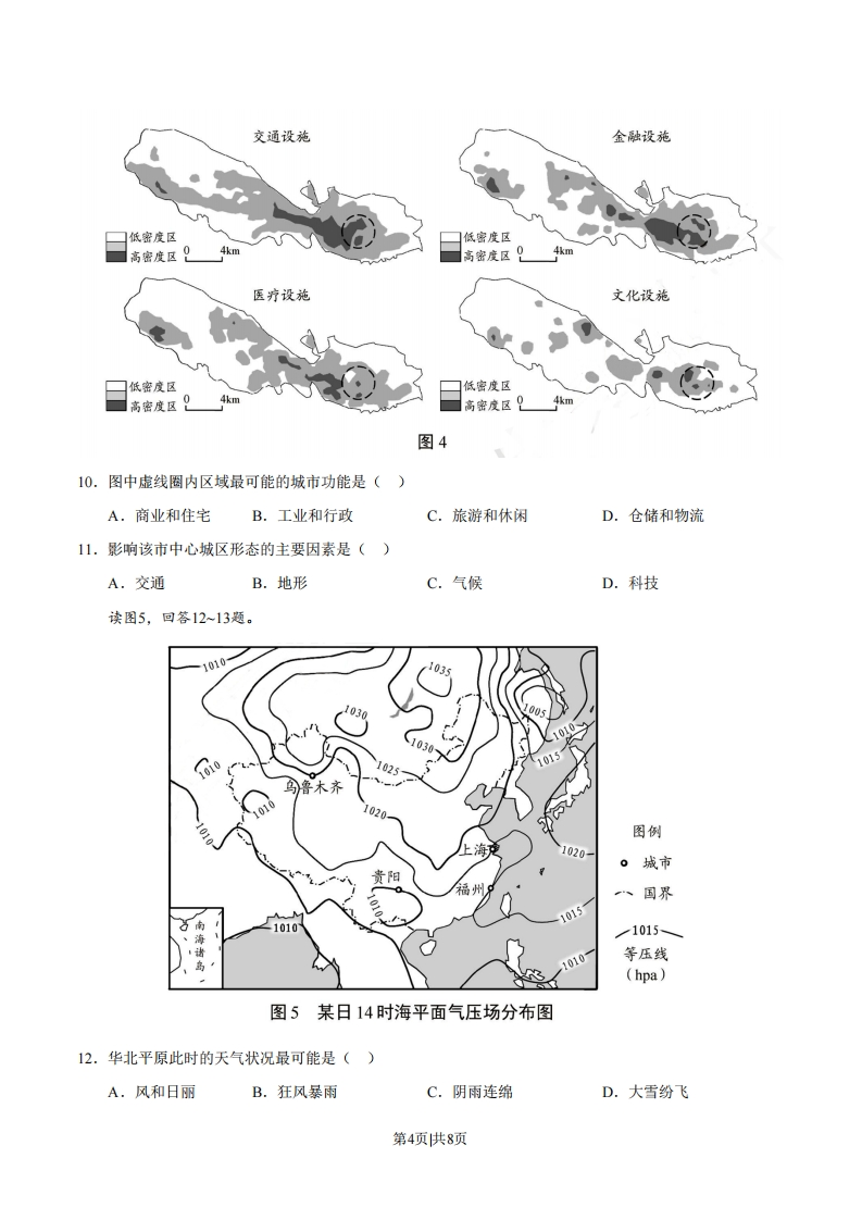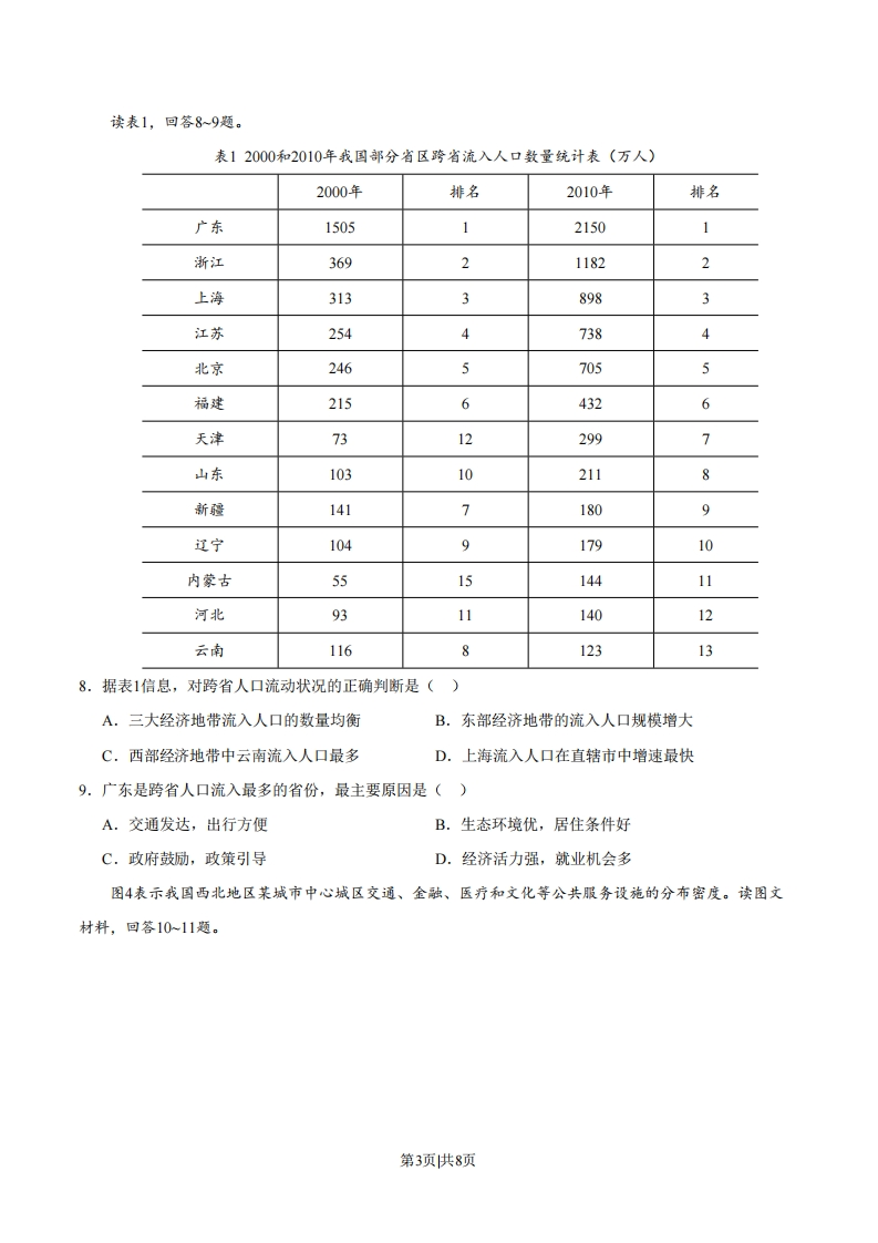 机密★启用前2020年天津市普通高中学业水平等级性考试地理本试卷分为第I卷(选择题)和第Ⅱ卷(排选择题)两部分,共100分,考试用时60分钟。第I卷1至5页,第Ⅱ卷6至8页。答卷前,考生务必将自己的姓名、考生号、考场号和座位号填写在答题卡上,并在规定位置粘贴考试用条形码。答卷时,考生务必将答案涂写在答题卡上,答在试卷上的无效。考试结束后,将本试卷和答题卡一并交回。祝各位考生考试顺利!第卷注意事项:1.每题选出答案后,用铅笔将答题卡上对应题目的答案标号涂黑。如需改动,用橡皮擦干净后,再选涂其他答案标号。2.本卷共15题,每题3分,共45分,在每题给出的四个选项中,只有一项是最符合题目要求的。中新天津生态城是在盐碱荒滩上建设起来的一座新城,图1为四幅能反映生态城发展特色的景观照片。读图文材料,回答1~3题。动漫产业园区智能公交站南堤滨海步道公园太阳能发电设施图11.在中新天津生态城发展特色的描述中,与图1中的景观依次对应的是()A.智慧城市、低碳环保、高新产业、生态宜居B.生态宜居、高新产业、低碳环保、智慧城市C.高新产业、智慧城市、生态宜居、低碳环保D.低碳环保、生态宜居、智慧城市、高新产业2.南堤滨海步道公园紧邻永定新河,园内湖泊对当地水循环的影响是()A.调节地表径流量B.减少地下径流量C.减少水的下渗量D.减少地表水蒸发3.中新天津生态城的林地大多分布在堆土形成的高地上,主要是因为高地()A.受风沙影响小B.盐碱化程度低C.受干旱影响小D.热量条件较好第1页共8页图2所示地貌景观位于粤北地区,其形成需要特定的地质条件。读图文材料,回答45题。图24.形成图2所示地貌景观的岩石类型、地质构造和所需的外力作用分别是()A.变质岩、水平裂隙、流水侵蚀B.沉积岩、水平裂隙、风力侵蚀C.岩浆岩、垂直裂隙、风力侵蚀D.沉积岩、垂直裂隙、流水侵蚀5.导致图2所示景观岩层出露地表的最直接的内力作用形式是()A.垂直抬升B.水平拉张C.水平挤压D.岩浆喷发20世纪80年代,M镇的服装企业迁至省会W市进行生产经营。近年来,这些企业又陆续迁回M镇,劳动力也随之迁移流动。企业和劳动力的回流过程及原因如图3所示。读图文材料,回答6~7题。劳动力企业政府被动回流提供劳动力第一波回流产业结构调整W市示增加就业机会改善生产条件转用主动回流提供劳动力第二波回流政策吸引M镇图36.关于该镇企业和劳动力回流原因的叙述符合实际的是()A.W市的产业结构调整和城市化进程促进了劳动力的主动回流B.M镇承接产业转移,企业第二波回流带动了劳动力主动回流C.M镇提供优惠的就业和投资政策,促成了企业的第一波回流D.在企业回流和本地就业利好的作用下,更多劳动力被动回流7.导致服装企业从M镇迁往W市,后又迁回的主导区位因素分别是()A.技术和环保B.交通和劳动力C.市场和政策D.动力和原材料第2页共8页