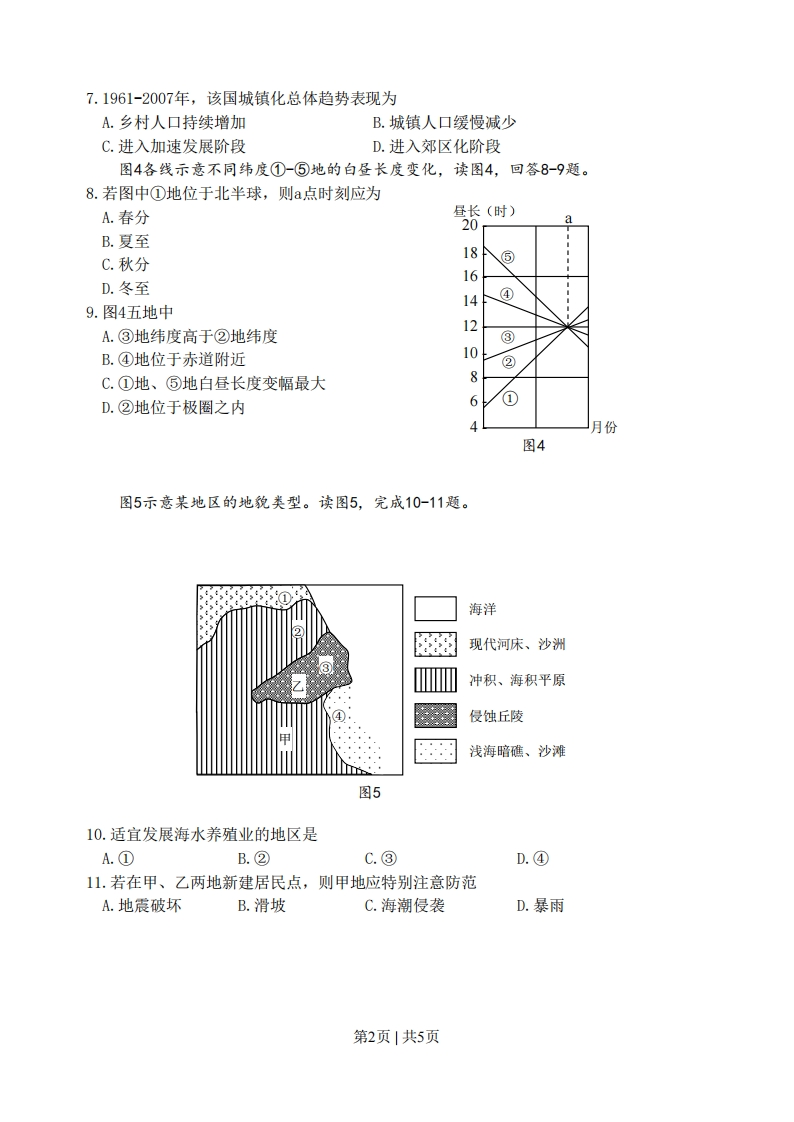 2008年普通高等学校招生全国统一考试文科综合能力测试(四卷·地理)第卷注:本卷为单项选择题,每小题4分,共44分。图1示意海平面两条闭合等压线。读图1,回答1-2题。1.若M点吹东南风,则该天气系统所处的位置和性质分别为A.北半球、气旋B.北半球、反气旋C.南半球、气旋D.南半球、反气旋2.若该天气系统生成于太平洋海域,则其中心移动的方向通常为①南②西③北④东南⑤西北A.①②③B.②③④图1C.②③⑤D.③④⑤图2示意我国北方农牧交错带生产与生态定位。读图2,回答3-4题。3.北方农牧交错带农业发展方向是A.增大坡耕地面积,提高粮食产量特育肥家裔草原牧☒带B.大量开垦荒地,提高人均耕地面积深加工产品C.大规模机械化,建成商品粮基地饲草料牧东部农耕区D.退耕还林(草),发展舍饲养殖农副产品4.北方农牧交错带的生态与生产功能是图2①东部农耕区的生态屏障和畜产品供应基地②东部农耕区的生态屏障和重要粮食供应基地③西部牧区的水源涵养带和饲草料供应基地④西部牧区的水源涵养带和重要粮食供应基地A.①③B.②③C.①④D.②④图3示意某国城镇人口和乡村人口的变化。读图3,回答5-7题。万人5.1982年该国城镇化水平约为100000-90000-乡村人可A.10%B.20%80000-70000-C.30%D.40%60000-50000-6.20世纪该国城镇人口比重增长最快城城人口40000-30000-的时期是20000-A.60年代初期B.70年代中期10000-0-C.80年代中期D.90年代后期医玉家是星眉年份图3第1页|共5页7.1961-2007年,该国城镇化总体趋势表现为A.乡村人口持续增加B.城镇人口缓慢减少C.进入加速发展阶段D.进入郊区化阶段图4各线示意不同纬度①-⑤地的白昼长度变化,读图4,回答8-9题。8.若图中①地位于北半球,则a点时刻应为A.春分昼长(时)20B.夏至18C.秋分⑤16D.冬至14④9.图4五地中12A.③地纬度高于②地纬度③B.④地位于赤道附近10②C.①地、⑤地白昼长度变幅最大8D.②地位于极圈之内6月份图4图5示意某地区的地貌类型。读图5,完成10-11题。海洋图现代河床、沙洲皿冲积、海积平原侵蚀丘陵浅海暗礁、沙滩图510.适宜发展海水养殖业的地区是A.①B.②C.③D.④11.若在甲、乙两地新建居民点,则甲地应特别注意防范A.地震破坏B.滑坡C.海潮侵袭D.暴雨第2页|共5页