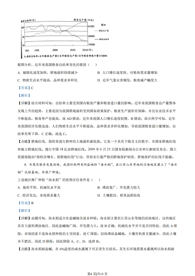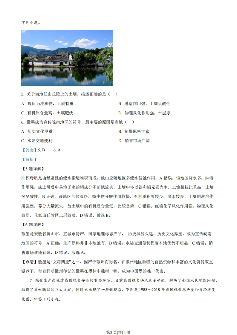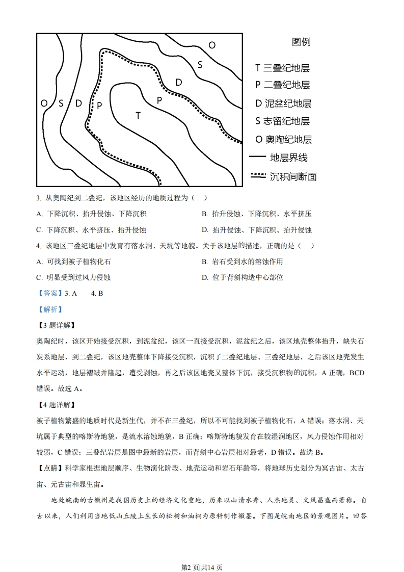 2022年天津市普通高中学业水平等级性考试地理第I卷下列是天津四处的景观图片。回答下列小题。1.四图中能反映历史时期本市平原地区地面沉降的是()A.甲、丙B.甲、乙C.乙、丁D.丙、丁2.图乙所示的居民区位于滨海地区,当地居民经常能感受到海陆风。在夏季时,若只考虑海陆热力性质差异,一天中海风风力最大的时段是()A.6:00-7:00B.10:00-11:00C.14:0015:00D.20:00-21:00【答案】1.D2.C【解析】【1题详解】沿海防潮堤主要体现的是海水的海拔,与地面沉降关联不大,甲图不能反映地面沉降:下沉式广场是建设过程中选择低洼地区建设,本来地势就低的地区不能直观反映地面沉降,乙图不能反映地面沉降:沿海地区人们消费海洋贝类生物较多,产生了大量的贝壳,这部分贝壳原来在地表,现在却出现在地下,说明贝壳堆积在岩层之中,地面沉降,形成地下贝壳层,丙图能反映地面沉降:天津地处我国华北平原,由于雨季短,且降水季节变化大,水资源相对短缺,天津会过度开采地下水造成地面沉降,据图示可知明代古街道出现了明显的下沉,这就是天津在上世纪初期开始不断抽取地下水而导致的地面沉降,丁图能反映地面沉降。丙、丁两图能反映历史时期本市平原地区地面沉降,D正确。故选D。【2题详解】海陆风中海风是指海洋吹向陆地的风,此时海洋应气压较高,相对气温较低,而如果海陆同时增温,海洋由于热容量较大,增温幅度小,相对于陆地气温低,气压高,故此一天之中地面辐射最多的时刻,也就是气温最高的时刻,海风最大,而一天中气温最高的时刻一般是在14时附近,C正确,ABD错误。故选c。【点晴】海洋热容量大,陆地热容量小,因此,海洋升温降温较慢,陆地升温降温较快。白天,陆地受热升温快,海洋受热升温慢,从而产生了冷热差异,近地面风由海洋吹向陆地,所以叫做“海风”。下图为某地不同地质时期形成的沉积地层在地表出露情况的示意图。回答下列小题。第1页共14页图例T三叠纪地层O/s/D9P二叠纪地层D泥盆纪地层S志留纪地层O奥陶纪地层地层界线沉积间断面3.从奥陶纪到二叠纪,该地区经历的地质过程为()A.下降沉积、抬升侵蚀、下降沉积B.抬升侵蚀、下降沉积、水平挤压C.下降沉积、水平挤压、抬升侵蚀D.抬升侵蚀、下降沉积、抬升侵蚀4.该地区三叠纪地层中发育有落水洞、天坑等地貌。关于该地层的描述,正确的是()A.可找到被子植物化石B.岩石受到水的溶蚀作用C.明显受到过风力侵蚀D.位于背斜构造中心部位【答案】3.A4.B【解析】【3题详解】奥陶纪时,该区开始接受沉积,到泥盆纪,该区一直接受沉积,泥盆纪之后,该区地壳整体抬升,缺失石炭系地层,到二叠纪,该区地壳整体下降接受沉积,沉积了二叠纪地层、三叠纪地层,之后该区地壳发生水平运动,地层褶皱并隆起,遭受剥蚀,再之后该区地壳又整体下沉,接受沉积物的沉积,A正确,BCD错误。故选A。【4题详解】被子植物繁盛的地质时代是新生代,并不在三叠纪,所以不可能找到被子植物化石,A错误:落水洞、天坑属于典型的喀斯特地貌,是流水溶蚀地貌,B正确:喀斯特地貌发育在较湿润地区,风力侵蚀作用相对较弱,C错误:三叠纪岩层是图中最新的岩层,而背斜中心岩层相对最老,D错误。故选B。【点睛】科学家根据地层顺序、生物演化阶段、地壳运动和岩石年龄等,将地球历史划分为冥古宙、太古宙、元古宙和显生宙。地处皖南的古嫩州是我国历史上的经济文化重地,历来以山清水秀、人杰地灵、文风昌盛而著称。自古以来,人们利用当地低山丘陵上生长的松树和油桐为原料制作徽墨。下图是皖南地区的景观图片。回答第2页共14页
