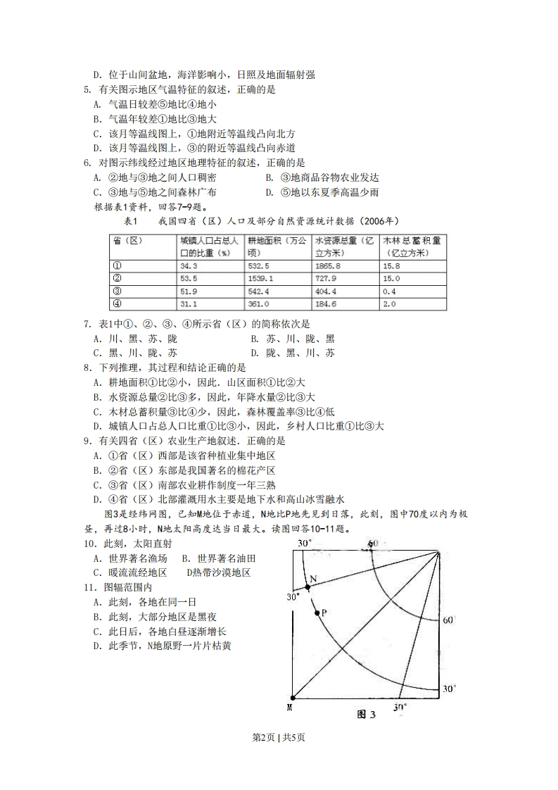 2009年普通高等学校招生全国统一考试(四川卷)文科综合能力测试-地理第I卷图1是亚热带欧亚大陆东部某地等高线分布图,读图回答1-3题。图11.图示区域内拥有且最突出的旅游资源是A.瀑布飞流B.湖光山色C.云海日出D.奇峰峡谷2.下列四地的农业生产活动,合理的是A.甲一一育用材林B.乙一一培育橡胶C.丙一一种植棉花D.丁一一发展茶园3.对图示区域地理事象的叙述,正确的是A.①地位于三角洲B.河流②与河流③流向相反C.盛夏晴朗的夜晚④地常吹偏北风D.深秋的清晨乙地比甲地更容易出现雾图2是沿36度纬线某月平均气温曲线图,读图回答4-6题。气温(℃西东302520①②③④⑤10120°10080°经度图24.该月平均气温,图中②地高附近地区的原因是A.海拔低,太阳高度大,日照时间长B.副热带高压控制,盛行下沉气流,晴天多C.受沿岸暖流影响,增温增湿显著,大气逆辐射强第1页|共5页D.位于山间盆地,海洋影响小,日照及地面辐射强5.有关图示地区气温特征的叙述,正确的是A.气温日较差⑤地比④地小B.气温年较差①地比③地大C.该月等温线图上,①地附近等温线凸向北方D.该月等温线图上,③的附近等温线凸向赤道6.对图示纬线经过地区地理特征的叙述,正确的是A.②地与③地之间人▣稠密B.③地商品谷物农业发达C.③地与⑤地之间森林广布D.⑤地以东夏季高温少雨根据表1资料,回答7-9题。表1我国四省(区)人口及部分自然资源统计数据(2006年)省(区)城镇人口占总人耕地面积(万公水资源总量(亿木林总蓄积量口的比重()顷)立方米)(亿立方米)①34.3532.51865.815.8②53.51539.1727.915.0③51.9542.4404.40.4④31.1361.0184.62.07.表1中①、②、③、④所示省(区)的简称依次是A.川、黑、苏、陇B.苏、川、陇、黑C.黑、川、陇、苏D.陇、黑、川、苏8.下列推理,其过程和结论正确的是A.耕地面积①比②小,因此.山区面积①比②大B.水资源总量②比③多,因此,年降水量②比③大C.木材总蓄积量③比④少,因此,森林覆盖率③比④低D.城镇人口占总人口比重①比③小,因此,乡村人口比重①比③大9.有关四省(区)农业生产地叙述.正确的是A.①省(区)西部是该省种植业集中地区B.②省(区)东部是我国著名的棉花产区C.③省(区)南部农业耕作制度一年三熟D.④省(区)北部灌溉用水主要是地下水和高山冰雪融水图3是经纬网图,已知M地位于赤道,N地比P地先见到日落,此刻,图中70度以内为极昼,再过8小时,N地太阳高度达当日最大。读图回答10-11题。10.此刻,太阳直射300A.世界著名渔场B.世界著名油田C.暖流流经地区D热带沙漠地区11.图辐范围内A.此刻,各地在同一日B.此刻,大部分地区是黑夜60C.此日后,各地白昼逐渐增长D.此季节,N地原野一片片枯黄30M30图3第2页|共5页