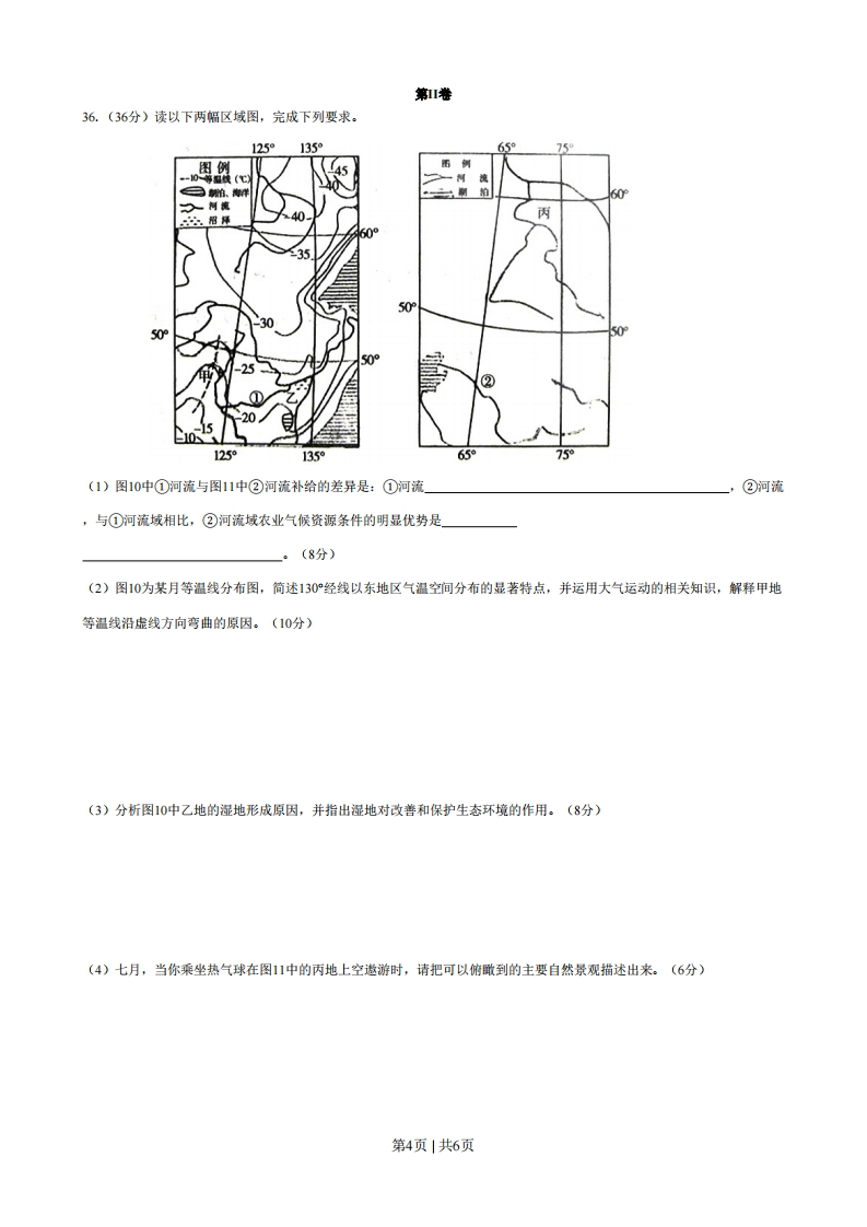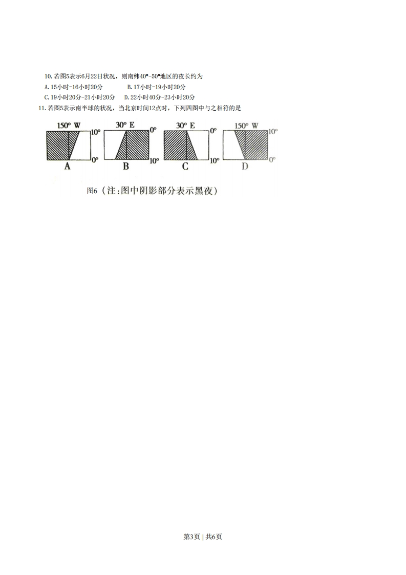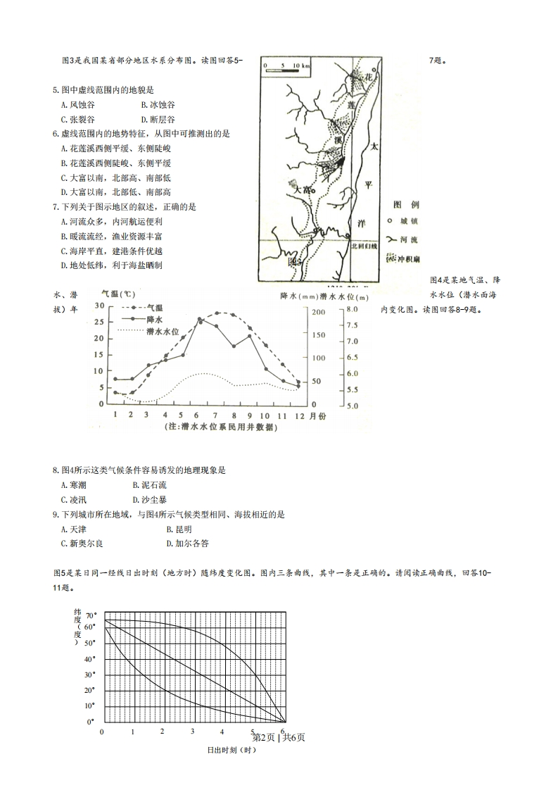 2010年普通高等学校招生全国统一考试文科综合能力测试(四川卷地理)第1卷注:本卷为单项选择题,每小题4分,共44分。图1是2004年河北、甘肃、四川、黑龙江四省能源生产结构图。读图1,回答1-2题。各种能源所占百分比(%)100图例80圈水电60☐天然气40■原油20原煤0①②③④省份图11.与四省能源生产结构相关的叙述,正确的是A.以可再生能源为主B.清洁能源的比重大C.不利于减排温室气体D.有利于降低酸雨危害2.制约①省进一步开发水能的地理条件,正确的是A.水能资源蕴藏量小B.水能资源分布分散C水能富集地人口分布稀疏D.水能富集地地质条件复杂图2中各城市的大气最大降温高度(距地面高度),是连续三年中最强的15次冷空气影响的统计平均值。读图回答3-4题。位大降温高度(米】2000o沈I1500北京o嫩江徐10008上海口长沙郑州500L广州04上20304050图2北纬(度)3.据图2反映的变化趋势,对下列各地最大降温高度的推断,正确的是A.合肥小于南宁B.株洲大于石家庄C.辽河平原大于洞庭湖平原D.长江三角洲小于珠江三角洲4.形成图示趋势的主要影响因素是A.获得太阳辐射多少B.距冬季风源地远近C.下垫面性质的差异D.对流层厚度的不同第1页1共6页图3是我国某省部分地区水系分布图。读图回答57题。510k5.图中虚线范围内的地貌是A.风蚀谷B.冰蚀谷C.张裂谷D.断层谷6.虚线范围内的地势特征,从图中可推测出的是A.花莲溪西侧平缓、东侧陡峻B.花莲溪西侧陡峻、东侧平缓C.大富以南,北部高、南部低D.大富以南,北部低、南部高7.下列关于图示地区的叙述,正确的是图例A.河流众多,内河航运便利0城镇B.暖流流经,渔业资源丰富)河流C.海岸平直,建港条件优越D.地处低纬,利于海盐晒制税:冲积扇图4是莱地气温、降水、潜气温(℃)降水(mm)潜水水位(m】水水位(潜水面海拔)年30-◆-气祖2008.0内变化图。读图回答8-9题。25一降水7.5…潜水水位201507.0151006.5●106.05055.505.0456789101112月份(注:潜水水位暴民用井数据)8.图4所示这类气候条件容易诱发的地理现象是A.寒潮B.泥石流C.凌汛D.沙尘暴9.下列城市所在地域,与图4所示气候类型相同、海拔相近的是A.天津B.昆明C.新奥尔良D.加尔各答图5是某日同一经线日出时刻(地方时)随纬度变化图。图内三条曲线,其中一条是正确的。请阅读正确曲线,回答1011题。70960度50形。3092010第2页共6页日出时刻(时)