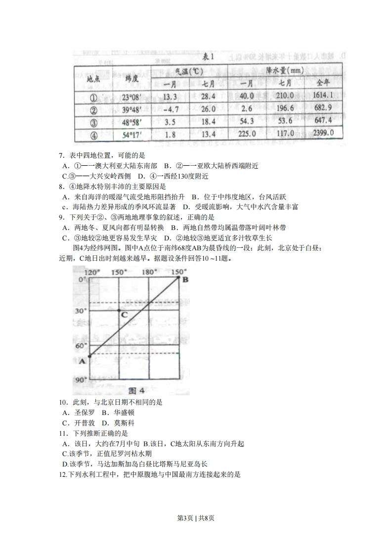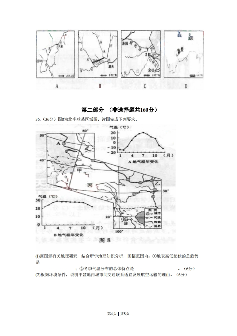 2011年普通高等学校招生全国统一考试(四川卷)文科综合文科综合能力测试试题分选择题和综合题两部分。第一部分(选择题)1至7页,第二部分(综合题)8至12页,共12页。满分300分,考试用时150分钟.注意事项:1.答题前,务必将自己的姓名、准考证号填写在答题卡上规定的位置上。2.答选择题时,必须使用2B铅笔将答题卡上对应题目的答案标号涂黑,如需改动,用橡皮擦干净后,再选涂其他答案标号。3.答题时,必须使用0.5毫米黑色签字笔,将答案书写在答题卡规定的位置上。4所有题目必须在答题卡上作答,在试题卷上答题无效。5.考试结束后,将试卷题和答题卡一并交回。第一部分(选择题共140分)图1为我国西部某省人口数据统计图。近年全国人口自然增长率为0.5%左右。据此回答1一2题。一基35方4青代丙可量080万拉通十习批0.51风老:下擦烟2000年2010年目常住人口数□人口自然增长率四城物人口比重83(注:数据来源于全国人口普查)048图181.关于该省人口状况的叙述,正确的是A.目前出生率低、死亡率低B.人口密度十年来大幅减小C.城市人口比重提高依靠人口自然增长D.城市人口数量十年来增长50%以上2.该省十年来常住人口(指实际居住在当地半年以上的人口)效量减少,其主要原因是A.人口自然增长率下降B.水利工程移民增多C.省级行政区域缩小D.劳务输出数量增加图2为某大洲地形剖面示意图。读图回答3-4题。第1页|共8页海拔(米)烟增数还视30002000100010°1020°(韩度)图2数业3.下列叙述正确的是A.该剖面穿过的地形以山地为主B.乙地所在国工业集中分布在该国西部C.该剖面走向为西北一一东南向D.乙地所在国农业集中分布在该国北部4.关于甲地与所在大洋对岸(同纬度)的叙述,正确的是A.甲地海水的盐度比对岸海域更高B.甲地上升流比对岸海域更显著C.甲地大陆沿岸一派油橄榄林风光D.甲地对岸的沿岸一片草原景观图3为我国部分地区地表年蒸发量等值线图。读图回答5一6题。110°E10040°N0060030*N600600600一300一年落发量等值线(米)天常图3口人的5.据图中的等值线,下列判断正确的是A.丙地年蒸发量小于500毫米B.图幅南部地区年蒸发量由东向西递减C.单位距离年蒸发量变化甲地区大于乙地区D.400毫米等值线同内、外流区分界线基本一致6.在乙地区土壤中水盐运动表现为淋盐特征的时期,丁区域可出现的地理现象是A.油菜花黄蜜蜂忙B.阴雨绵绵梅子黄C.稻田受旱暑骄阳D.落叶遍地秋风狂表为四地气温、降水统计资料。读表回答7-9题。第2页|共8页