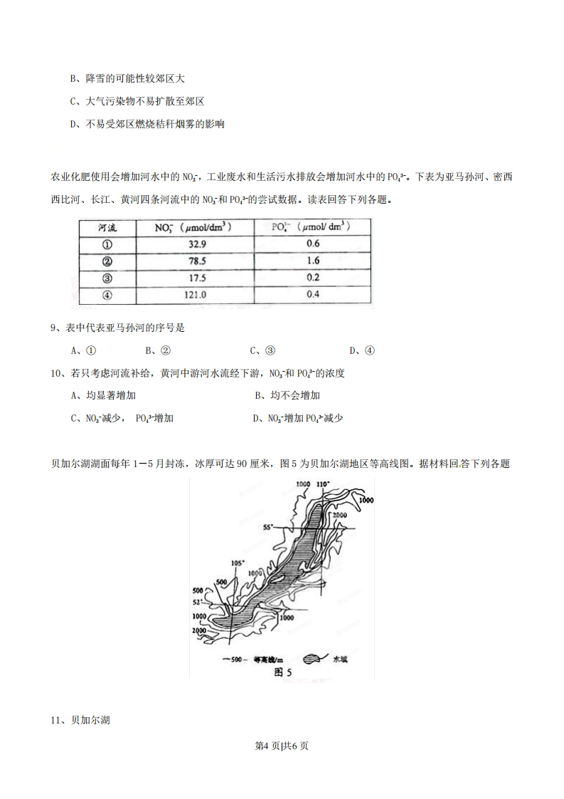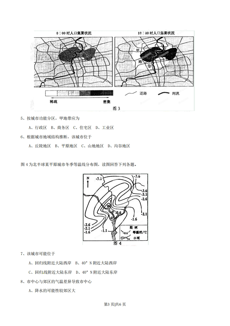 2015年普通高等学校招生全国统一考试(四川卷)文科综合地理文科综合考试时间共150分钟,满分300分。政治、历史、地理各100分。地理试题卷分第I卷(选择题)和第Ⅱ卷(非选择题)。第I卷9至11页,第Ⅱ卷12至12页,共4页。考生作答时,须将答案答在答题卡上,本试题卷、草稿纸上答题无效。考试结束后,将本试题卷和答题卡一并交回。◆第I卷(选择题共48分)注意事项:必须使用2B铅笔在答题卡上将所选答案对应的标号涂黑。第I卷共12题,每题4分。在每题给出的四个选项中,只有一项是最符合题目要求的。2013年4月5日,我国帆船物驾驶“青岛号”帆船荣归青岛港,实现了中国人民首次单人不间断环球航行。图1为此次航行的航线图,据材料回答下列各题。90WE44N224°N2J26°s641r8之线及病1、此次航行中,最能利用盛行风和洋流的航程是A、南美洲以南→非洲以南B、非洲以南→南海C、南海→台湾海峡D、台湾海峡→青岛2、帆船返回青岛港当日,青岛A、日出东南方向B、于地方时6时前日出C、昼长较广州短D、正午物影较春分日长雾是悬浮在近地面空气中的大量微小水滴凝成冰晶,图2为“中国年平均雾日空间分布图”,据材料回下列第1页供6页各题。C3美图23、下列地区中,年平均雾日最少的是A、福建沿海B、黄海沿岸C、准噶尔盆地D、柴达木盆地4、与四川盆地内秋、冬季节多雾直接相关的是A、秦岭阻挡冷空气南下B、气流受地形阻挡抬升C、受暖湿的东南季风影响明显D、晴朗的夜间地面辐射冷却强图3反映我国某城市某工作日0:00时和10:00时的人口集聚状况,该图由手机定位功能获取的人口移动数据制作而成,读图回答下列各题。第2页供6页