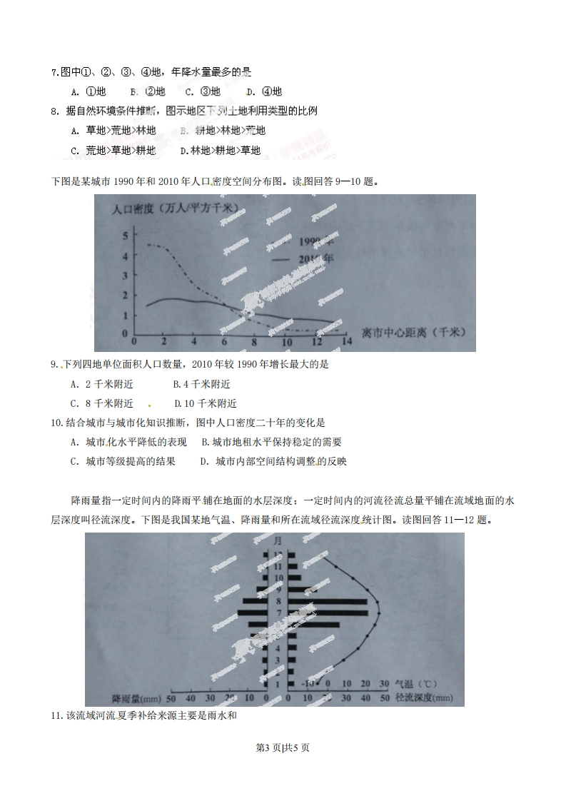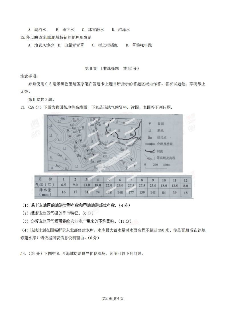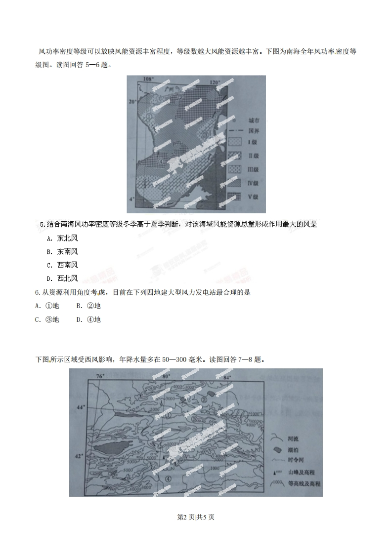 2014年普通高等学校招生全国统一考试(四川卷)文科综合地理文科综合考试时间共150分钟,满分300分。政治、历史、地理各100分。地理试题卷分第I卷(选择题)和第Ⅱ卷(非选择题)。第I卷9至11页,第Ⅱ卷12至12页,共4页。考生作答时,须将答案答在答题卡上,本试题卷、草稿纸上答题无效。考试结束后,将本试题卷和答题卡一并交回。第I卷(选择题共48分)注意事项:必须使用2B铅笔在答题卡上将所选答案对应的标号涂黑。第I卷共12题,每题4分。在每题给出的四个选项中,只有一项是最符合题目要求的。我国嫦娥三号月球探测器于北京时间2013年12月2日1时30分,在四川西昌卫星发射中心成功发射。据此回答1一2题。1.发射时刻的国际标准时间(世界时)是2013年12月A.1日17时30分B.1日21时30分C.2日1时30分D.2日9时30分2.发射时,发射场及其局围地区可能处于A.冷锋过境时B.暖锋过境时C.低压控制下D.高压控制下权必下图为高速铁路和甲运输方式两者间客运市场占有率随运距变化图。读图回答3一4题。市场占有率(%)1007406040202004006000010001200运距(km)3、图中两种运输方式的市场占有率变化幅度最大在A.700-900kmB.600-800kmC.500-700kmD.400-600km4.甲运输方式应该是A.高速公路B.普通铁路C航空。D.水路第1页供5页风功率密度等级可以放映风能资源丰富程度,等级数越大风能资源越丰富。下图为南海全年风功率密度等级图。读图回答5一6题。城市界1V级5.结合南海风功率密度等级冬季高于夏季判断,对该海域风能资源总量形成作用最大的风是A.东北风B.东南风C.西南风D.西北风6.从资源利用角度考虑,目前在下列四地建大型风力发电站最合理的是A.①地B.②地C.③地D.④地下图所示区域受西风影响,年降水量多在50一300毫米。读图回答7一8题。7698444”河流潮柏421时令河山峰及高程等高线及高程第2页供5页