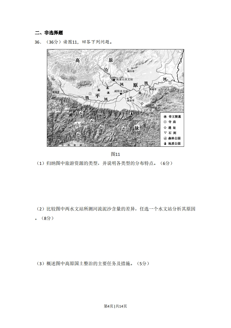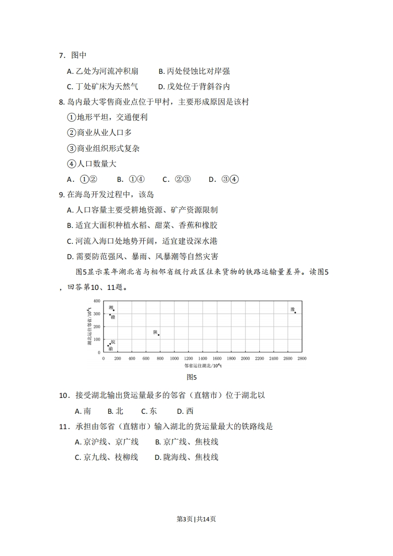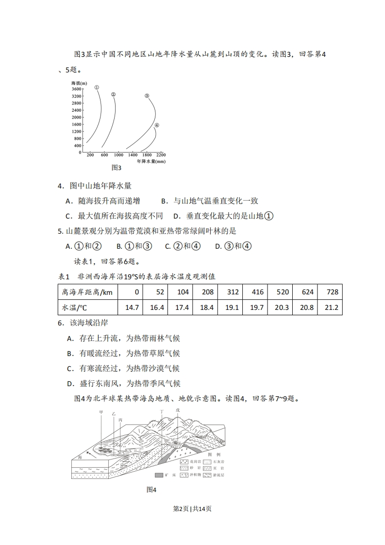 2009年北京市高考地理试卷一、选择题(每小题4分,共44分.)图1是中国局部地区太阳年辐射总量分布图。读图1,回答第1题。10011040517001500120030(单位:kwh/m2)图11.I区太阳年辐射总量比V区高,主要因为I区A,夏季大气逆辐射强B.年平均气温比较高C.正午太阳高度角大D.天气晴朗且海拔高臭氧层保护是当今全球最重要的环保议题之一。图2反映了9月份30S~80S平流层臭氧总量多年变化状况。读图2,回答第2、3题。400350H300年1964-1976解2501980-19842001985-19891990-19941996.199915020001090s80s70s60s50rs40s30s纬度图22.随年份的推移,臭氧总量A.最大值所在位置南移B.随纬度的升高而递减C.在高纬地区递减明显D.随大气C02浓度而增3.臭氧总量减少直接导致A,太阳紫外线辐射减少B.平流层气温降低C.酸雨区面积缩小D.地面辐射强度减弱第1页1共14页图3显示中国不同地区山地年降水量从山麓到山顶的变化。读图3,回答第4、5题。海拔(m)3600320028002400200016004120080040002006001000140018002200年降水量(mm)图34.图中山地年降水量A,随海拔升高而递增B.与山地气温垂直变化一致C.最大值所在海拔高度不同D.垂直变化最大的是山地①5.山麓景观分别为温带荒漠和亚热带常绿阔叶林的是A.①和②B.①和③c.②和④D.③和④读表1,回答第6题。表1非洲西海岸沿19S的表层海水温度观测值离海岸距离/km052104208312416520624728水温/℃14.716.417.418.419.119.720.320.821.26.该海域沿岸A.存在上升流,为热带雨林气候B.有暖流经过,为热带草原气候C.有寒流经过,为热带沙漠气候D.盛行东南风,为热带季风气候图4为北半球某热带海岛地质、地貌示意图。渎图4,回答第7~9题。图例习花同岩☐石灰岩品马珍署图真岩☐矿床田冲积物图徽能层图4第2页1共14页