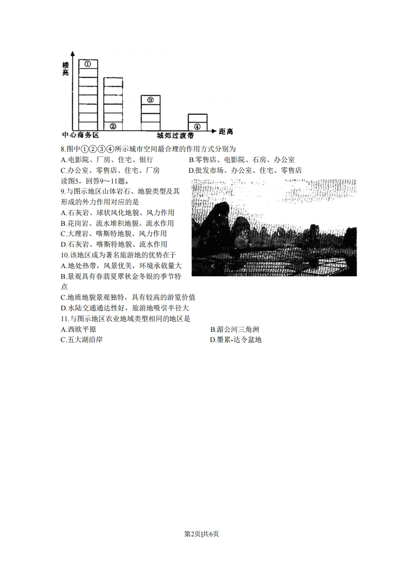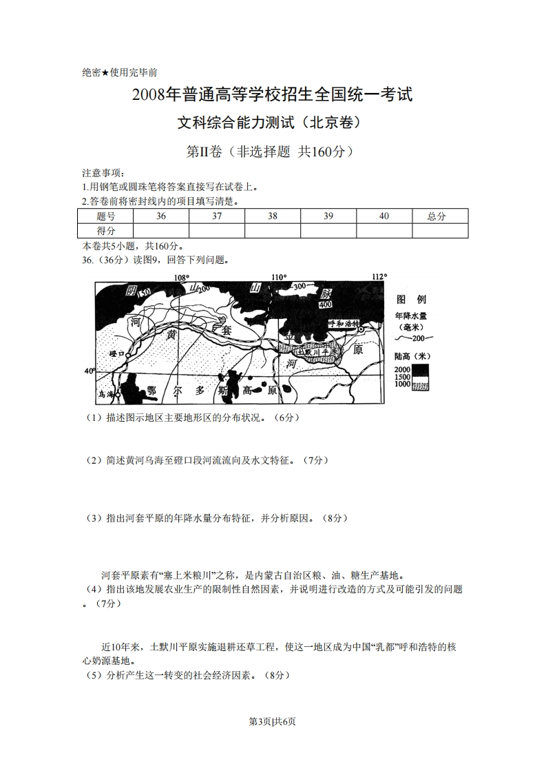 2008年普通高等学校招生全国统一考试文科综合能力测试(北京卷)本试卷分第I卷(选择题)和第Ⅱ卷(非选择题)两部分,第I卷1至6页,第Ⅱ卷7至16页,共300分。考试时间150分钟。考试结束,将本试卷和答题卡一并交回。第I卷(选择题共140分)本卷共35小题,每小题4分,共140分。在每小题列出的四个选项中,选出最符合题目要求的一项。1.目前,人类已知月球上的能源有A.生物能、风能B.核能、潮汐能C潮汐能、太阳能D.太阳能、核能电视收视率是指在某个时段收看电视的人(户)数占电视观众总人(户)数的百分比。收2.一般情况下,图1中表示北京地区电视收视率率变化的曲线是%)A.①B.②③c.③D.④低构建模式图,探究地理基本原理、过程、成因81012141618202224及规律,是学习地理的方法之一。世界时读图2,回答3一5题。E3.如果该图为在气环流模式,S线代表地球表面,则④A.E处气温比H处高①③B.F处气压比G处低C.气流②自西向东运动②D.E处的高度可达120千米GH4.如果该图为海陆间水循环模式,$线代表地球表面,则A.环节①参与地表淡水资源的补给B.环节②是陆地自然带形成的基础C环节③使大洋表面海水的盐度降低D.环节④的运动距离与下垫面无关5如果该图为世界洋流模式的南半球部分,$线代表纬线,则A.洋流①对沿岸气候有降温、减湿作用B.洋流②为西风漂流C.洋流③对沿岸气候有增温、增湿作用D.洋流④为赤道逆流读图3,回答6、7题。月份689101112某作物生产期1R话1cereeeel00种植期☑出苗、分枝期超忍开花期8灌浆期2团收割期6.该作物A.种植期的早晚取决于气候条件B.灌浆期的早晚取决于成土母质C.收割期的早晚取决于农业政策D.一个生产周期至少为8个月7.该作物处于开花期时,正值A.赤道正午太阳高度最大B地中海沿岸炎热干燥C.中国东北平原昼长夜短D潘帕斯草原草木茂盛城市活动在空间上高度集取,并具有水平和垂直方向上的分异。读图4,回答8题。第1页共6页蕊①③、④中心商务区城郊过渡带距离8.图中①②③④所示城市空间最合理的作用方式分别为A.电影院、厂房、住宅、银行B.零售店、电影院、石房、办公室C.办公室、零售店、住宅、厂房D.批发市场、办公室、住宅、零售店读图5,回答9~11题。月i31,9.与图示地区山体岩石、地貌类型及其形成的外力作用对应的是A.石灰岩、球状风化地貌、风力作用B.花岗岩、流水堆积地貌、流水作用C.大理岩、喀斯特地貌、风力作用D.石灰岩、喀斯特地貌、流水作用10.该地区成为著名旅游地的优势在于A.地处热带,风景优美,环境承载量大B.景观具有春翡夏翠秋金冬银的季节特点C地质地貌景观独特,具有较高的游览价值D.水陆交通通达性好,旅游地吸引半径大11.与图示地区农业地域类型相同的地区是A西欧平原B.湄公河三角洲C.五大湖沿岸D.墨累达令盆地第2页供6页