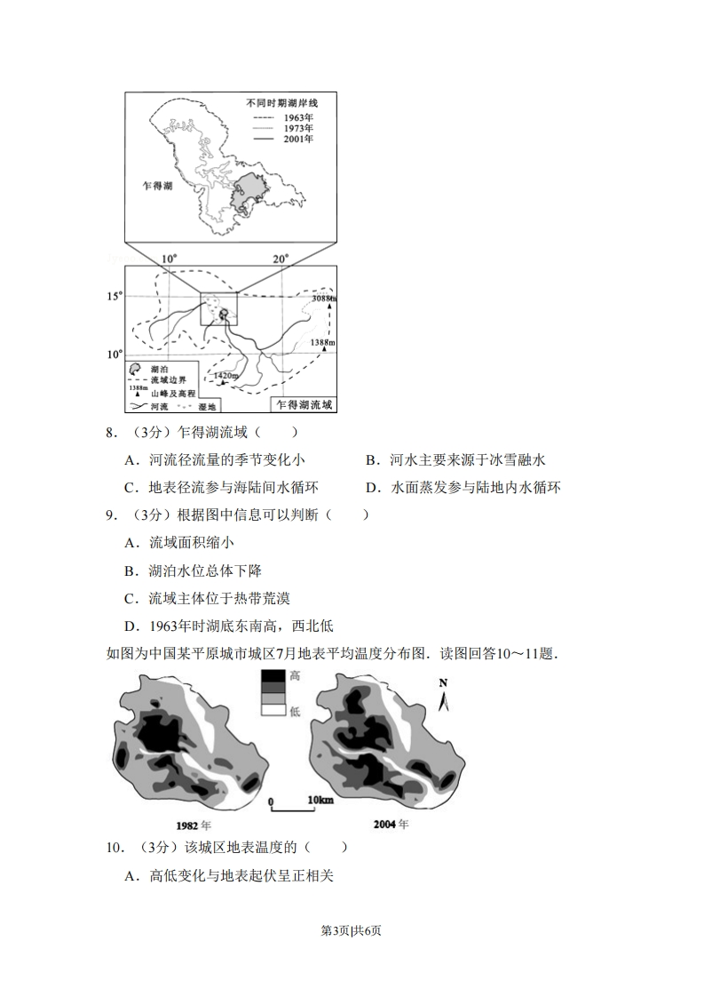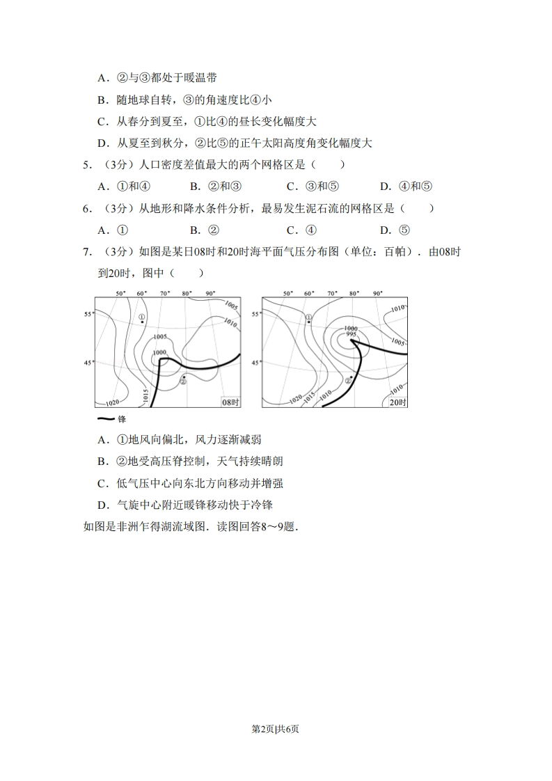2010年北京市高考地理试卷一、选择题如图是八达岭长城照片,该段长城主要坐落在花岗岩侵入体上,读图回答1~2题.①③④⑤1.(3分)图中指示山脊和山谷的分别是()A.①和②B.②和③C.③和④D.④和⑤2.(3分)八达岭地区花岗岩从形成到出露所经历的地质过程依次是()A.固结成岩-风化剥蚀-侵蚀搬运-地壳抬升B,地壳抬升-侵蚀搬运-岩浆侵入-风化剥蚀C.岩浆侵入-地壳抬升-风化剥蚀-侵蚀搬运D.侵蚀搬运-岩浆侵入-地壳抬升-固结成岩如图是经纬网图层和中国省级行政中心图层的叠加图,图中经纬线间隔度数相等.读图回答3~6题.度②.国经度3.(3分)经纬网的纬线间距为()A.30B.5C.8°D.10°4.(3分)图上标出的经纬网格区中()第1页共6页A,②与③都处于暖温带B.随地球自转,③的角速度比④小C.从春分到夏至,①比④的昼长变化幅度大D.从夏至到秋分,②比⑤的正午太阳高度角变化幅度大5.(3分)人口密度差值最大的两个网格区是()A.①和④B.②和③C.③和⑤D.④和⑤6.(3分)从地形和降水条件分析,最易发生泥石流的网格区是()A.①B.②C.④D.⑤7.(3分)如图是某日08时和20时海平面气压分布图(单位:百帕),由08时到20时,图中()50*607080°90°50°607080901001010555500100545451010102008时01020时一锋A.①地风向偏北,风力逐渐减弱B.②地受高压脊控制,天气持续晴朗C.低气压中心向东北方向移动并增强D.气旋中心附近暖锋移动快于冷锋如图是非洲乍得湖流域图.读图回答8一9题,第2页共6页