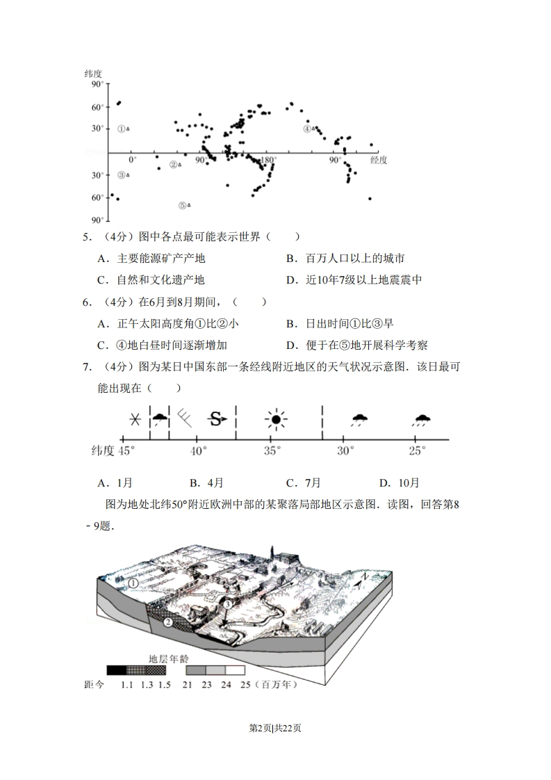 2011年北京市高考地理试卷一、本部分共8小题,每小题4分,共44分.在每小题列出的四个选项中,选出最符合题目要求的一项。1.(4分)图是海南省著名旅游景观“南天一柱”照片.该景观()A.形成受海水侵蚀的影响B.表现出石灰岩沉积特点C.反映热带自然景观特征D.在冬季观赏的效果最佳2.(4分)图为某年中国发生地质地貌灾害次数最多的6个省级行政区.该年发生地质地貌灾害次数最多的山地可能是()灾害数量(次)云贵陕青冀A.横断山和秦岭B.太行山和雪峰山C.大巴山和巫山D.祁连山和唐古拉山3.(4分)在图所示的山区自然灾害链中,①②③④依次是()暴雨堰塞湖3A.滑坡、泥石流、地震、崩塌B.泥石流、地震、崩塌、滑坡C,地震、崩塌、滑坡、泥石流D,崩塌、滑坡、泥石流、地震4.(4分)平均海拔由高到低的省区依次是()A.湘、辽、宁B.台、鲁、苏C.青、粤、晋D.桂、甘、豫读图,回答第5、6题。第1页共22页纬度90°T60°30①8030°+③60°,⑤490°15.(4分)图中各点最可能表示世界()A.主要能源矿产产地B.百万人口以上的城市C.自然和文化遗产地D.近10年7级以上地震震中6.(4分)在6月到8月期间,(A.正午太阳高度角①比②小B.日出时间①比③早C.④地白昼时间逐渐增加D.便于在⑤地开展科学考察7.(4分)图为某日中国东部一条经线附近地区的天气状况示意图.该日最可能出现在(纬度4540353025°A.1月B.4月C.7月D.10月图为地处北纬50°附近欧洲中部的某聚落局部地区示意图.读图,回答第8-9题.地层年龄8☐距今1.11.31.521232425(百万年)第2页共22页