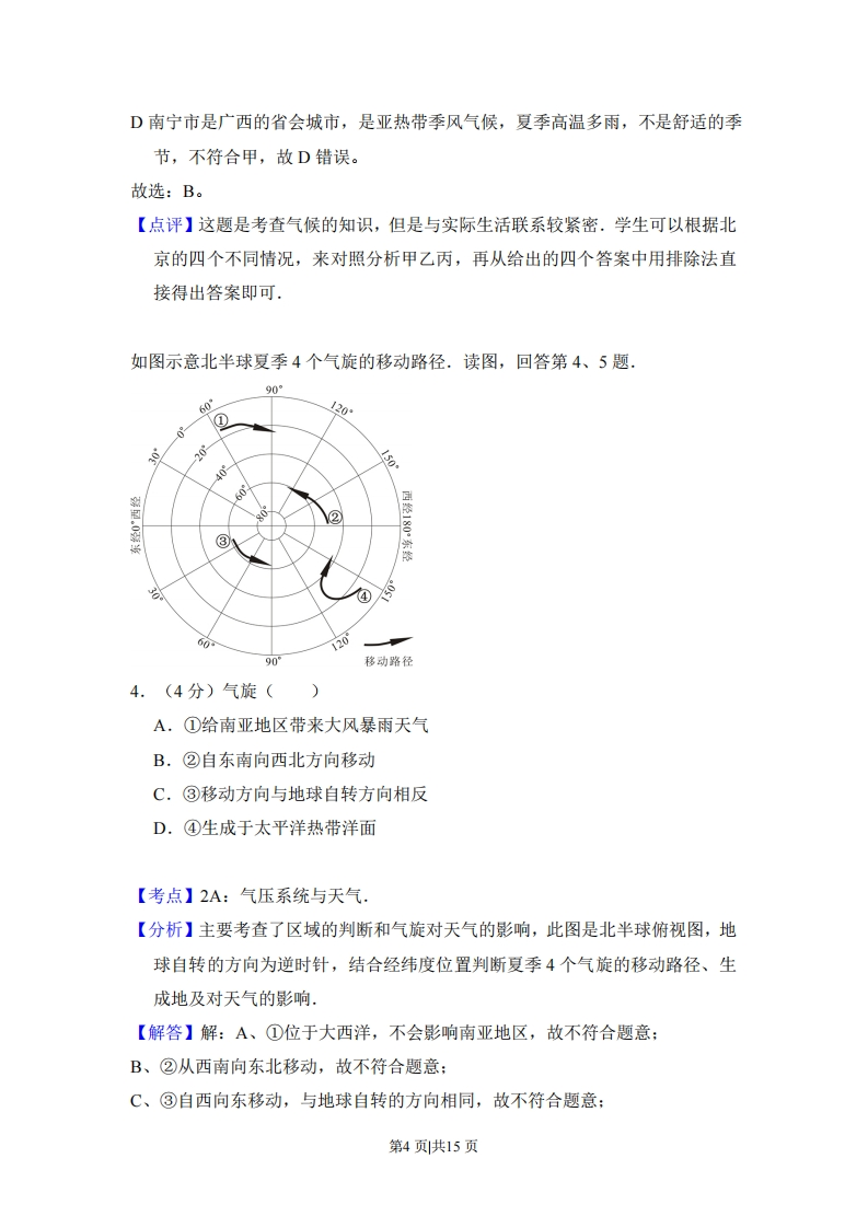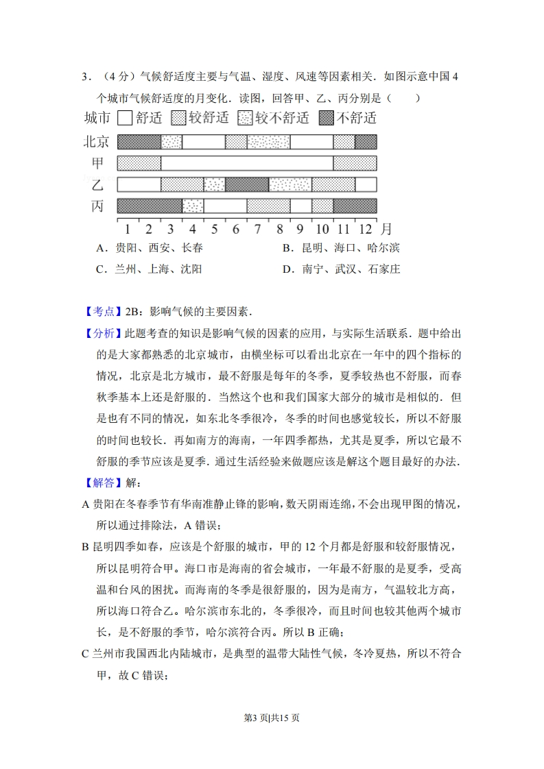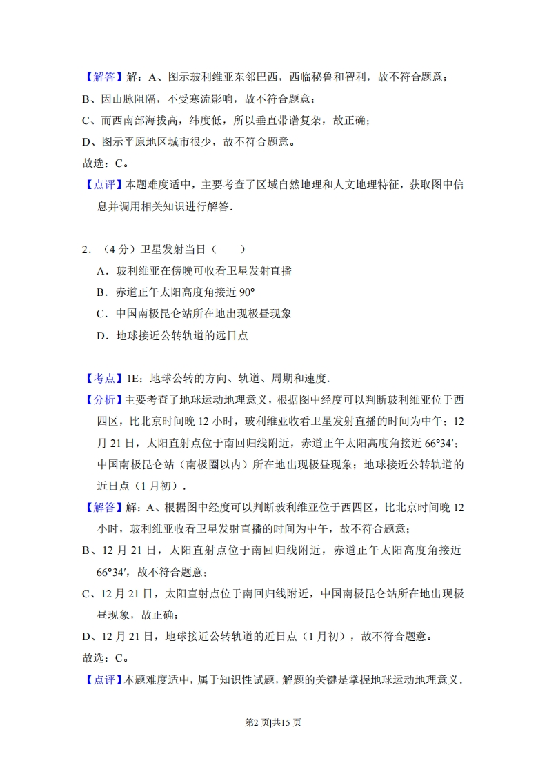 2014年北京市高考地理试卷套考答案与试题解析一、选择题(每小题0分)北京时间2013年12月21日0时42分,我国为玻利维亚成功发射通信卫星,读图,回答第1、2题.76°6860巴120西维16洋国界巴200主要城市利·143高程点海拔/m▲6542山峰及高程/m廷图11.(4分)玻利维亚()A.东邻巴西,西临太平洋B.受寒流影响,多雾少雨C.西南山地垂直地带谱复杂D.城市多分布于平原地区【考点】82:自然环境、人类活动的区域差异,【专题】142:地理图像材料题:35:辩证思想:421:课本知识迁移:521:人口与城市.【分析】读图,图示玻利维亚东邻巴西,西临秘鲁和智利:因山脉阻隔,不受寒流影响:图示平原地区城市很少:而西南部海拔高,纬度低,所以垂直带谱复杂.第1页共15页【解答】解:A、图示玻利维亚东邻巴西,西临秘鲁和智利,故不符合题意:B、因山脉阻隔,不受寒流影响,故不符合题意:C、而西南部海拔高,纬度低,所以垂直带谱复杂,故正确:D、图示平原地区城市很少,故不符合题意。故选:C。【点评】本题难度适中,主要考查了区域自然地理和人文地理特征,获取图中信息并调用相关知识进行解答.2.(4分)卫星发射当日()A.玻利维亚在傍晚可收看卫星发射直播B.赤道正午太阳高度角接近90°C.中国南极昆仑站所在地出现极昼现象D.地球接近公转轨道的远日点【考点】1E:地球公转的方向、轨道、周期和速度.【分析】主要考查了地球运动地理意义,根据图中经度可以判断玻利维亚位于西四区,比北京时间晚12小时,玻利维亚收看卫星发射直播的时间为中午:12月21日,太阳直射点位于南回归线附近,赤道正午太阳高度角接近6634':中国南极昆仑站(南极圈以内)所在地出现极昼现象:地球接近公转轨道的近日点(1月初).【解答】解:A、根据图中经度可以判断玻利维亚位于西四区,比北京时间晚12小时,玻利维亚收看卫星发射直播的时间为中午,故不符合题意:B、12月21日,太阳直射点位于南回归线附近,赤道正午太阳高度角接近66°34',故不符合题意:C、12月21日,太阳直射点位于南回归线附近,中国南极昆仑站所在地出现极昼现象,故正确:D、12月21日,地球接近公转轨道的近日点(1月初),故不符合题意。故选:C。【点评】本题难度适中,属于知识性试题,解题的关键是掌握地球运动地理意义第2页共15页