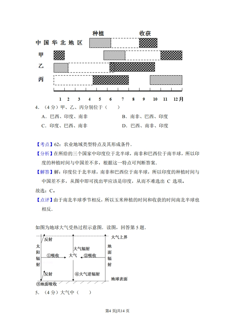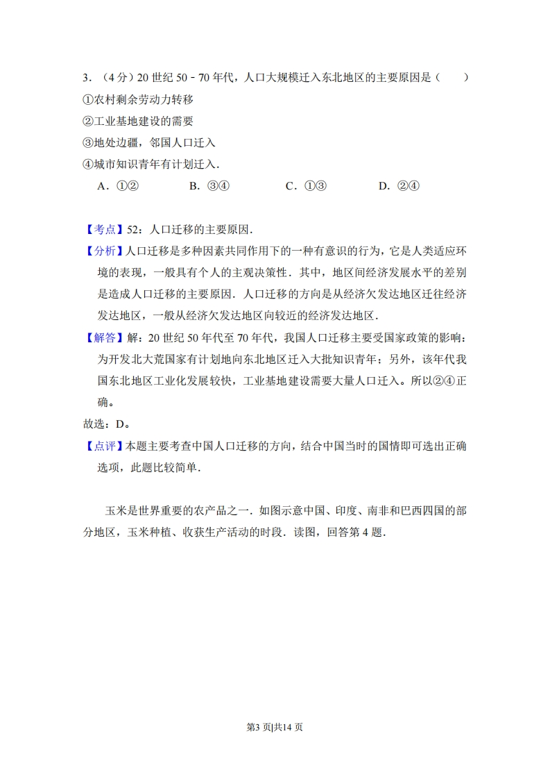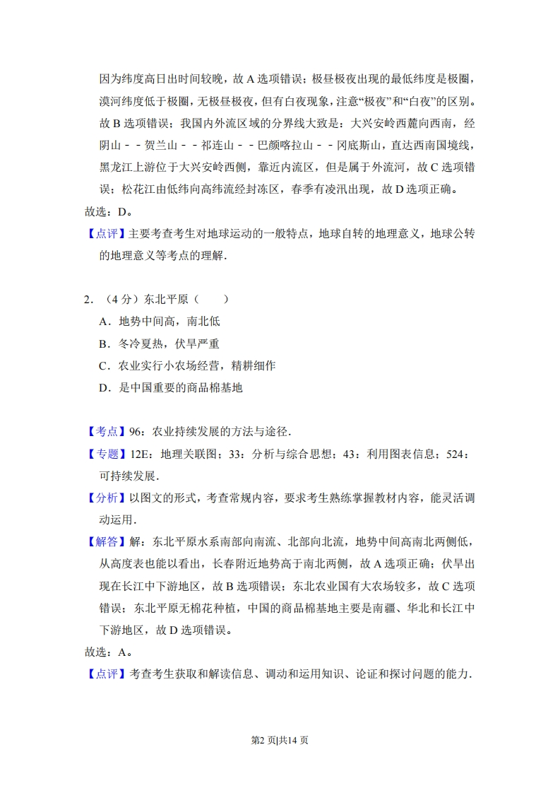 2013年北京市高考地理试卷◆考答案与试题解析一、(每空4分,共44分)读图,回答第1~3题.115125°135°⊙域镇·一国界√河流50°甲45高度表(米)1000409500200101.(4分)图中()A.甲地是中国日出最早的地方B.夏至日漠河有极昼现象C.大兴安岭为内、外流区分水岭D.松花江干流有凌汛现象【考点】96:农业持续发展的方法与途径.【专题】12E:地理关联图:33:分析与综合思想:43:利用图表信息;524:可持续发展,【分析】以图文材料的形式,考查常规内容,要求考生熟练掌握教材内容,能灵活调动运用,【解答】解:根据经纬度得知甲地为我国最东端,在夏半年日出最早,但冬半年第1页共14页因为纬度高日出时间较晚,故A选项错误:极昼极夜出现的最低纬度是极圈,漠河纬度低于极圈,无极昼极夜,但有白夜现象,注意“极夜”和“白夜”的区别。故B选项错误:我国内外流区域的分界线大致是:大兴安岭西麓向西南,经阴山--贺兰山--祁连山--巴颜喀拉山--冈底斯山,直达西南国境线,黑龙江上游位于大兴安岭西侧,靠近内流区,但是属于外流河,故C选项错误:松花江由低纬向高纬流经封冻区,春季有凌汛出现,故D选项正确。故选:D。【点评】主要考查考生对地球运动的一般特点,地球自转的地理意义,地球公转的地理意义等考点的理解2.(4分)东北平原()A.地势中间高,南北低B.冬冷夏热,伏旱严重C.农业实行小农场经营,精耕细作D.是中国重要的商品棉基地【考点】96:农业持续发展的方法与途径.【专题】12E:地理关联图:33:分析与综合思想:43:利用图表信息:524:可持续发展,【分析】以图文的形式,考查常规内容,要求考生熟练掌握教材内容,能灵活调动运用,【解答】解:东北平原水系南部向南流、北部向北流,地势中间高南北两侧低,从高度表也能以看出,长春附近地势高于南北两侧,故A选项正确:伏旱出现在长江中下游地区,故B选项错误:东北农业国有大农场较多,故C选项错误:东北平原无棉花种植,中国的商品棉基地主要是南疆、华北和长江中下游地区,故D选项错误。故选:A。【点评】考查考生获取和解读信息、调动和运用知识、论证和探讨问题的能力第2页共14页