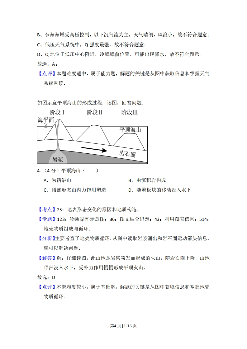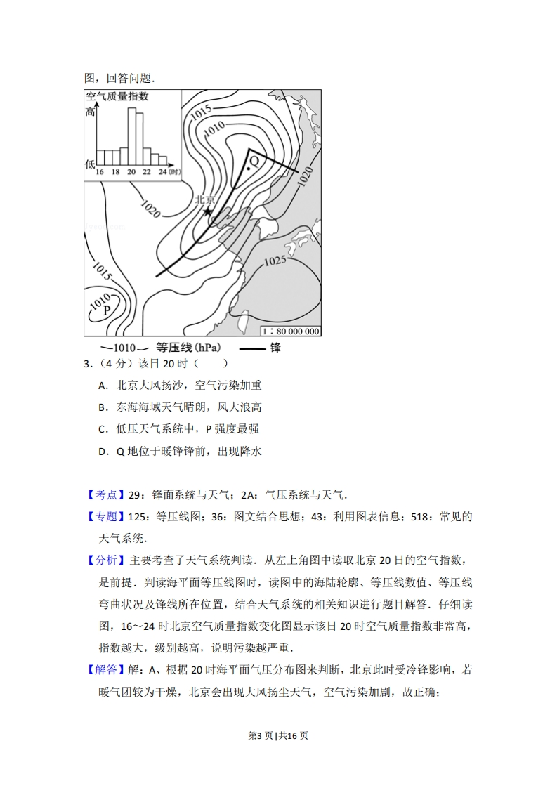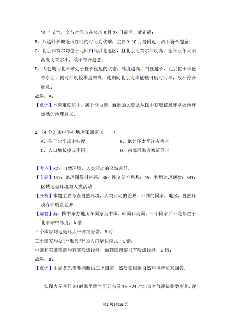 2016年北京市高考地理试卷事考答案与试题佩折一、选择题2016年8月21日-25日,第33届国际地理学大会将在北京举行,往届大会曾在华盛顿等地举办,读图,回答第1、2题.纬度构建我们的和谐世界40°2016北京地理即发现华盛顿1992生活多样化38°206首尔图例主举办地年36°东八区东九区西五区(时区)1.(4分)本届大会期间,北京()A.适逢中国农历处署节气B.八达岭长城漫山红叶C.比首尔正午太阳高度大D.比华盛顿日出时间晚【考点】1」:地球运动的地理意义.【专题】142:地理图像材料题:36:图文结合思想:43:利用图表信息;512:地球的自转与公转,【分析】主要考查了地球运动的地理意义,从题干信息知,本届大会期间,北京时间为2016年8月21日-25日.处暑即为“出署”炎热离开的意思,是农历二十四节气之中的第14个节气,交节时间点在公历8月23日前后:八达岭长城漫山红叶的时间为秋季,主要在10月份附近:北京和首尔均位于北回归线以北地区,且北京比首尔纬度高,全年正午太阳高度比首尔小:大会期间北半球处于昼长夜短的状态,纬度越高,白昼越长,北京位于华盛顿东面,同时纬度较华盛顿高,此期间北京比华盛顿日出时间早【解答】解:A、处暑即为“出暑”炎热离开的意思,是农历二十四节气之中的第第1页1共16页14个节气,交节时间点在公历8月23日前后,故正确:B、八达岭长城漫山红叶的时间为秋季,主要在10月份附近,故不符合题意:C、北京和首尔均位于北回归线以北地区,且北京比首尔纬度高,全年正午太阳高度比首尔小,故不符合题意:D、大会期间北半球处于昼长夜短的状态,纬度越高,白昼越长,北京位于华盛顿东面,同时纬度较华盛顿高,此期间北京比华盛顿日出时间早,故不符合题意。故选:A。【点评】本题难度适中,属于能力题,解题的关键是从图中获取信息和掌握地球运动的地理意义.2.(4分)图中举办地所在国家()A.位于北半球中纬度B.地处环太平洋灾害带C.人口增长模式不同D.南部沿海有寒流经过【考点】82:自然环境、人类活动的区域差异,【专题】142:地理图像材料题:36:图文结合思想:45:利用地理规律:531:区域地理环境与人类活动,【分析】本题主要考查自然环境,人类活动的差异.不同的国家,地区,自然环境存在明显差异【解答】解:图中举办地所在国家为中国、韩国和美国。三个国家并不是都位于北半球中纬度,A错:三个国家均地处环太平洋灾害带,B对:三个国家均处于“现代型”的人口增长模式,C错:中国和美国南部均有寒暖流经过,而韩国南部只有暖流经过,D错。故选:B。【点评】本题首先需要判断出三个国家,然后在根据自然环境特征来回答.如图表示某日20时海平面气压分布及16~24时北京空气质量指数变化.读第2页1共16页