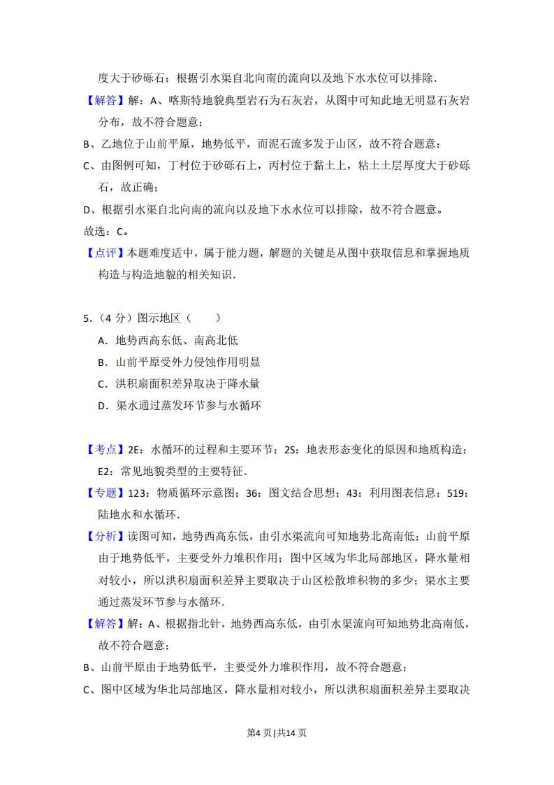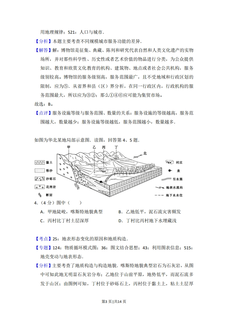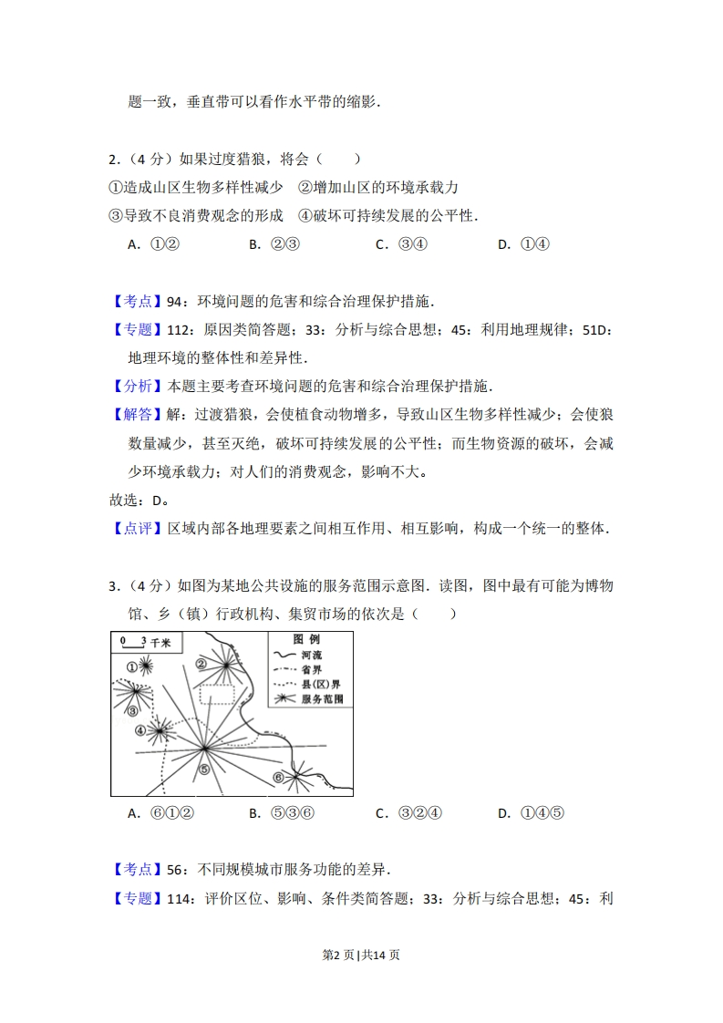 2015年北京市高考地理试卷考答来与试题解析一、选择题(每小题0分)从太白山的北麓往上,越上树木越密越高,上到山的中腰再往上,树木则越稀越矮.待到大稀大矮的境界,繁衍着狼的族类,也居住了一户猎狼的人家(引自贾平凹《太白山记》.太白山为秦岭主峰,海拔3767米).据此,回答第1、2题.1.(4分)太白山()A.北麓为亚热带常绿阔叶林带B.北坡山中腰降水量比山麓少C.又密又高的树木在针叶林带D.树木大稀大矮处为稀树草原【考点】37:地理环境的地域分布规律【专题】111:特征类简答题:37:整体性与差异性思想:45:利用地理规律:51D:地理环境的整体性和差异性,【分析】本题考查区域的整体性.区域内部各地理要素之间相互作用、相互影响,构成一个统一的整体,气候、生物、水文、土壤等自然地理环境要素之间的联系,【解答】解:A、太白山为秦岭的主峰,其北侧为温带季风气候,山麓地带的自然带为温带落叶阔叶林带。B、“从太白山的北麓往上,越上树木越密越高,说明山麓比山腰降水少。C、根据山地垂直地带性自然带变化规律,由山麓向山腰自然带由温带落叶阔叶林转变为针叶林。D、稀疏草原为热带草原带的自然带,不可能出现在太白山区。太白山北侧为温带季风气候。故选:C。【点评】植被的垂直分布可以概括以下规律:①基带为当地典型的植被带.②在各森林地带内,随着海拔高度的升高与随着纬度的增加,植被类型的变化大第1页|共14页题一致,垂直带可以看作水平带的缩影.2.(4分)如果过度猎狼,将会()①造成山区生物多样性减少②增加山区的环境承载力③导致不良消费观念的形成④破坏可持续发展的公平性,A.①②B.②③C.③④D.①④【考点】94:环境问题的危害和综合治理保护措施.【专题】112:原因类简答题:33:分析与综合思想:45:利用地理规律:51D:地理环境的整体性和差异性,【分析】本题主要考查环境问题的危害和综合治理保护措施,【解答】解:过渡猎狼,会使植食动物增多,导致山区生物多样性减少:会使狼数量减少,甚至灭绝,破坏可持续发展的公平性:而生物资源的破坏,会减少环境承载力:对人们的消费观念,影响不大。故选:D。【点评】区域内部各地理要素之间相互作用、相互影响,构成一个统一的整体,3.(4分)如图为某地公共设施的服务范围示意图.读图,图中最有可能为博物馆、乡(镇)行政机构、集贸市场的依次是()03千米图例一一河流米…省界…县(区)界米服务范围④】A.⑥①②B.⑤③⑥C.③②④D.①④⑤【考点】56:不同规模城市服务功能的差异,【专题】114:评价区位、影响、条件类简答题:33:分析与综合思想:45:利第2页|共14页