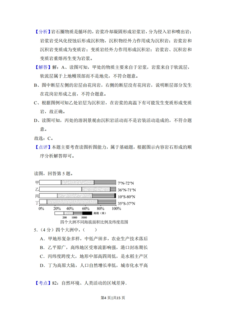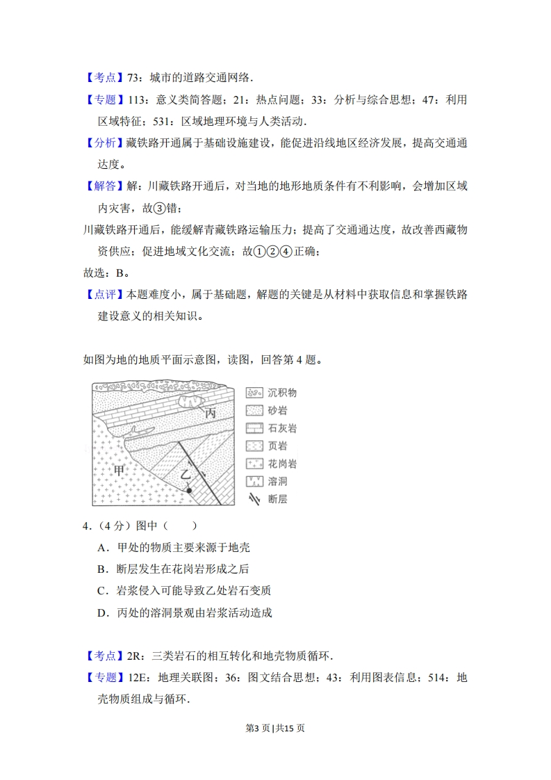 2018年北京市高考地理试卷考答来与试题解析一、第一部分(选择题共44分)本部分11小题,每小题12分,共44分,在每小题列出的四个选项中,选出最符合题目要求的一项.2018年4月,川藏铁路成都至雅安段开始铺轨。读图,回答第1-3题。329⊙0城市既有铁路昌都规划铁路成都河流湖泊高程(米】8拉萨雅安5003000951008网川藏铁路沿线区域简图1.与成都相比,拉萨()A.日出早,白昼长B.正午太阳高度角小C.海拔高、日照强D.大气逆辐射强【考点】82:自然环境、人类活动的区域差异.【专题】111:特征类简答题:21:热点问题:33:分析与综合思想:47:利用区域特征:51D:地理环境的整体性和差异性.【分析】拉萨在青藏高原地区,海拔较高,太阳辐射强:成都在四川盆地,盆地地形,太阳辐射弱。【解答】解:A项,拉萨位于成都的西部,日出时间更晚,故A项错误。B项,拉萨的纬度比成都更低,正午太阳高度角更大,故B项错误。C项,成都位于四川盆地,云层较厚,光照较弱,拉萨位于青藏高原,海拔高,大气稀薄,光照较强,故C项正确。D项,拉萨位于青藏高原,海拔高,大气稀薄,大气对地面辐射的阻挡作用更弱,大气逆辐射更弱,故D项错误。第1页|共15页故选:C。【点评】本题难度小,属于基础题,解题的关键是从材料中获取信息和掌握自然地理环境差异性的相关知识。2.图示区域()A,地处板块的生长边界B.河流的流向自西向东C.自然景观为高寒荒漠D.跨地势第一、二级阶梯【考点】82:自然环境、人类活动的区域差异,【专题】111:特征类简答题:21:热点问题:33:分析与综合思想:43:利用图表信息:531:区域地理环境与人类活动,【分析】根据上图可知,该区域西面是青藏高原,东部是四川盆地,由此分析。【解答】解:A项,该区域位于印度洋板块和亚欧板块的消亡边界,多火山地震,故A项错误。B项,该地大部分位于横断山区,河流大多自北向南流入印度洋,故B项错误。C项,该地位于我国的青藏高原地区,海拔高气温低,自然景观大多为积雪冰川,故C项错误。D项,青藏高原位于我国的一级阶梯,四川盆地位于我国的二级阶梯,此区域位于我国一、二级阶梯的交界处,故D项正确。故选:D。【点评】本题难度小,属于基础题,解题的关键是从材料中获取信息和掌握自然地理环境整体性的相关知识。3.川藏铁路开通后,能够()①缓解青藏铁路运输压力②改善西藏物资供应③消除区域内灾害的影响④促进地域文化交流A.①②③B.①②④C.①③④D.②③④第2页|共15页