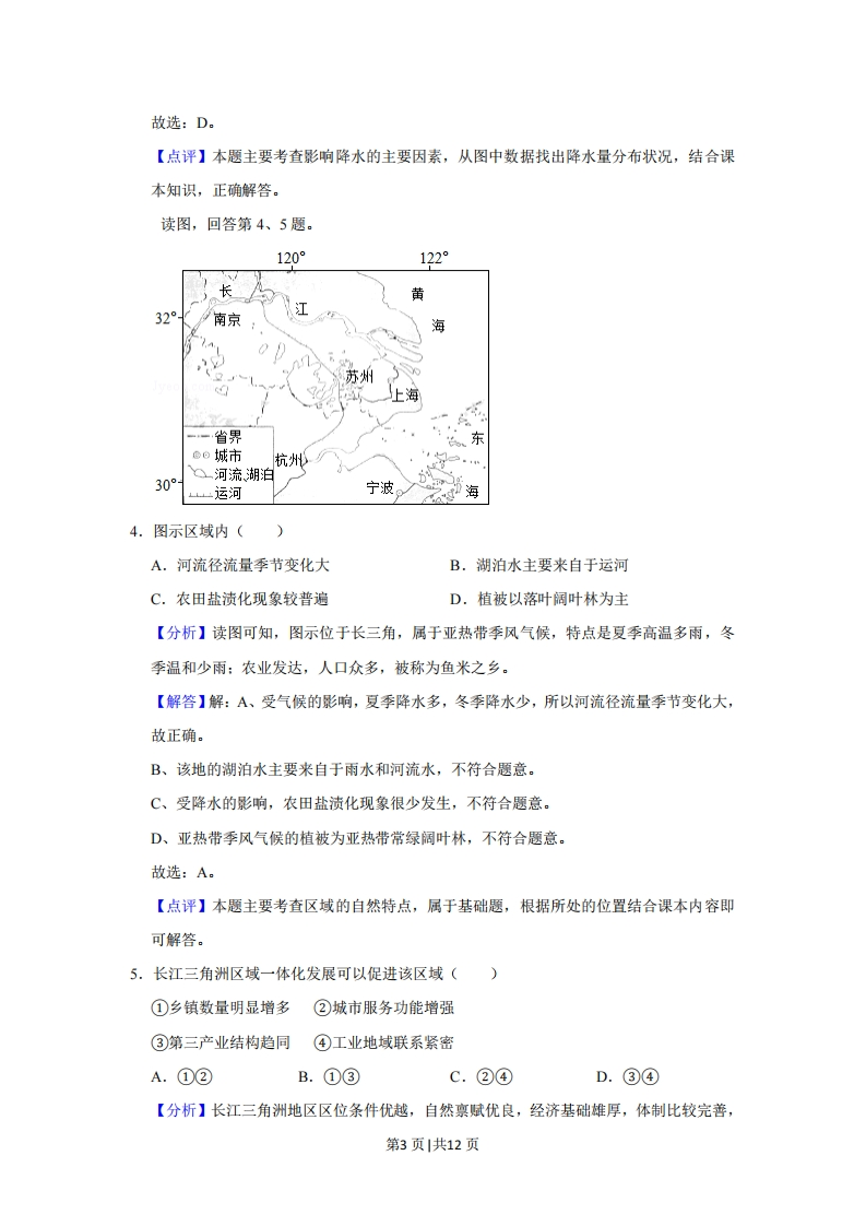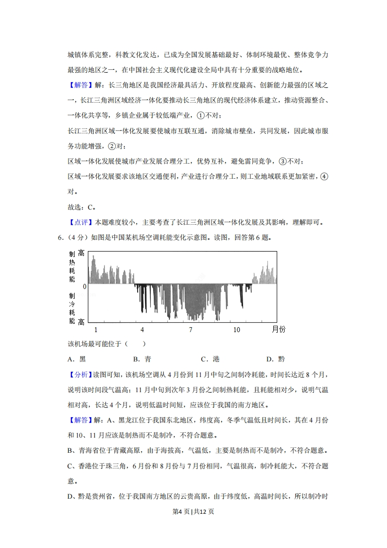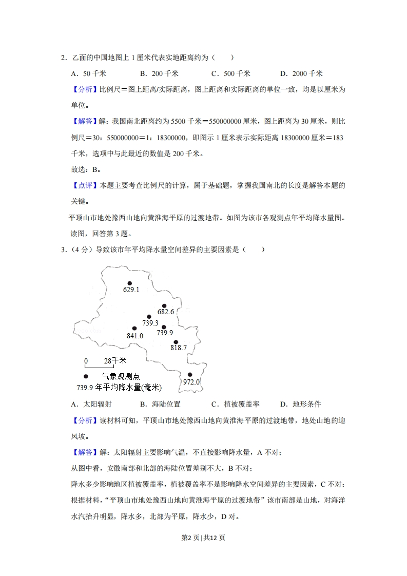 2019年北京市高考地理试卷童考答来与试测解析一、本部分共8小题,年小题8分,共44分。在每小题列出的四个选项中,选出最符合题目要求的一项。某中学制作主题为“点亮中国”的宫灯。如图为学生手绘的设计图。读图,回答第1、2题。深圳30厘米珠海香港澳门·甲1.甲面中绘有多座大桥,可以推断所示区域(A.建桥成本低B.水运条件缺乏C.交通需求量大D.人口迁移频繁【分析】区域的基本特征:1、区域具有一定的界线。2、区域内部表现出明显的相似性和连续性,区域之间则具有显著的差异性。3、区域具有一定的优势、特色和功能。4、区域之间是相互联系的,一个区域的发展变化会影响到周边和相关的地区。【解答】解:右图可知,甲区域位于东南沿海,珠海和深圳属于经济特区、香港和澳门属于特别行政区,四地经济都很发达,甲面中绘有多座大桥,可以推断所示区域交通需求量大,C对:从图中看,该地位于沿海,水域广阔,跨度大,建桥成本较高,A不对:该地水域广阔,河流径流量大,与海洋相连,水运条件较好,B不对:人口迁移一般指较大尺度的、较长时间的人口流动,说两岸的人口迁移频繁不合适,D不对。故选:C。【点评】本题难度较小,主要考查了区域存在的环境及发展问题,获取图文中信息即可。第1页1共12页2.乙面的中国地图上1厘米代表实地距离约为()A.50千米B.200千米C.500千米D.2000千米【分析】比例尺=图上距离/实际距离,图上距离和实际距离的单位一致,均是以厘米为单位。【解答】解:我国南北距离约为5500千米=550000000厘米,图上距离为30厘米,则比例尺=30:550000000=1:18300000,即图示1厘米表示实际距离18300000厘米=183千米,选项中与此最近的数值是200千米。故选:B。【点评】本题主要考查比例尺的计算,属于基础题,掌握我国南北的长度是解答本题的关键。平顶山市地处豫西山地向黄淮海平原的过渡地带。如图为该市各观测点年平均降水量图。读图,回答第3题。3.(4分)导致该市年平均降水量空间差异的主要因素是()●29.162.6●739.3●●841.0739.98128千米●气象观测点●972.0739.9年平均降水量(毫米)A.太阳辐射B.海陆位置C.植被覆盖率D.地形条件【分析】读材料可知,平顶山市地处豫西山地向黄淮海平原的过渡地带,地处山地的迎风坡。【解答】解:太阳辐射主要影响气温,不直接影响降水量,A不对:从图中看,安徽南部和北部的海陆位置差别不大,B不对:降水多少影响地区植被覆盖率,植被覆盖率不是影响降水空间差异的主要因素,C不对:根据材料,“平顶山市地处豫西山地向黄淮海平原的过渡地带”该市南部是山地,对海洋水汽抬升明显,降水多,北部为平原,降水少,D对。第2页|共12页