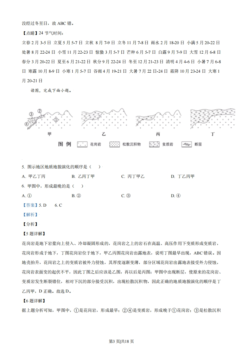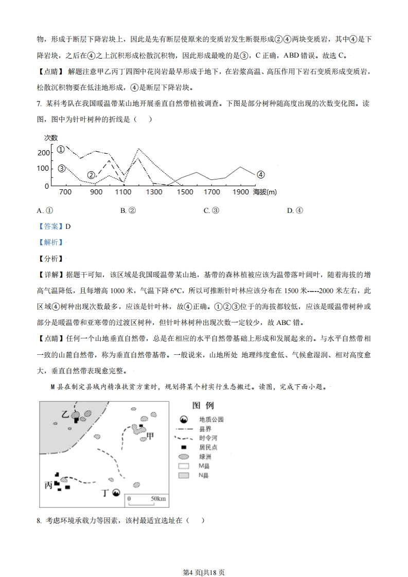 2021年普通高中学业水平等级性考试北京地理注意事项:本试卷共9页,100分。考试时长90分钟。考生务必将答案答在答题卡上,在试卷上作答无效。考试结束后,将本试卷和答题卡一并交回。一、本部分共15题,每题3分,共45分。在每题列出的四个选项中,选出最符合题目要求的一项。我国某镇利用当地主产的粮食制作粮画,打造粮画小镇。图是M学校设计的小镇地理位置指示牌,图b是该校设计的四条“行走的思政课”精华路线示意图。读图,完成下面小题。图例立八义士抗日国处436km★古城保卫战透址粮画小镇北京甲⊙粮画展览馆363250"N⊙0传统民居保护地1151313"EM学校(出发点)一高速公路一铁路一精华路线。河流5km桥a61.该镇()A.位于北京东南方向B.地处华北平原C.粮画原料主要是稻米D.水路交通便捷2.图中最短的精华路线里程约为()A.5千米B.10千米C.15千米D.20千米【答案】1.B2.B【解析】【分析】本题以某粮画小镇为背景,涉及地图的判读及距离计算相关知识,考查读图计算能力及区域认知。【1题详解】北京中心坐标大致为北纬40°,东经116°,结合图中所给当地经纬度可以判断,该镇位于北京西南方位,A项错误:结合当地经纬度可以判断出,该镇位于华北平原,B项正确:该地位于我国北方地区,粮画原料主要是小麦,C项错误:读图可知,当地交通方式主要是以铁路和公路运输为主,水运不便利,D项错误。故选B。【2题详解】图中最短精华路线是从M学校至传统民居保护地这条线路,根据图中比例尺进行计算,图上1厘米代表实第1页共18页际距离5千米,可以计算出最短的精华路线里程约为10千米,B项正确。故选B。【点睛】比例尺计算公式:实际距离=图上距离÷比例尺下图示意北纬27°附近部分地点某年的平均气温。读图,完成下面小题。气温(C)232119◆1715161i718119120121东经()3.影响图中气温高低的主要因素是()A.海拔高度B.大气环流C.海陆位置D.人类活动4.某地理小组连续多日在该纬线附近同一地点用木杆测量正午太阳高度角,记录的木杆影长数值先增大、后减小。该小组测量影长的时间段是()A.立春-惊蛰B.芒种-小暑C.白露-寒露D.大雪-小寒【答案】3.A4.D【解析】【分析】【3题详解】该图示意北纬27°附近部分地点某年的平均气温,从116E到121E,可推断该地区为我国东南丘陵地区,属于亚热带季风气候,年均温的差异不是大气环流导致的,故B错:海陆位置的差异主要影响降水,对年平均气温影响不大,故C错:年均温的差异主要是自然因素导致的,和人类活动关系不大,故D错:同纬度地区,年均温的差异主要是由于海拔高度的不同导致的,海拔高的地方,年均温低,海拔低的地方,年均温高,故A正确。【4题详解】结合学过的知识,影长和正午太阳高度角成反比,太阳高度角越小,影子越长,从夏至日到冬至日,太阳直射点从北回归线向南回归线移动,北回归线以北的地区正午太阳高度逐渐变小,冬至日达最小值,木杆影长数值先增大到最长,然后太阳直射点从南回归线向北移动,北半球正午太阳高度逐渐变大,木杆影长数值减小,到夏至日达最小值,故木杆影长数值先增大、后减小的时间段必须经历冬至日。大雪(12月6-一8日)-冬至(12月22日前后)-小寒(1月5-7日),故D正确:立春(2月3-5日)-惊蛰(3月5-7日),芒种6月5-7日>-小暑(7月6-8日),白露(9月7-9日)-寒露(10月8-9日),显然都第2页共18页